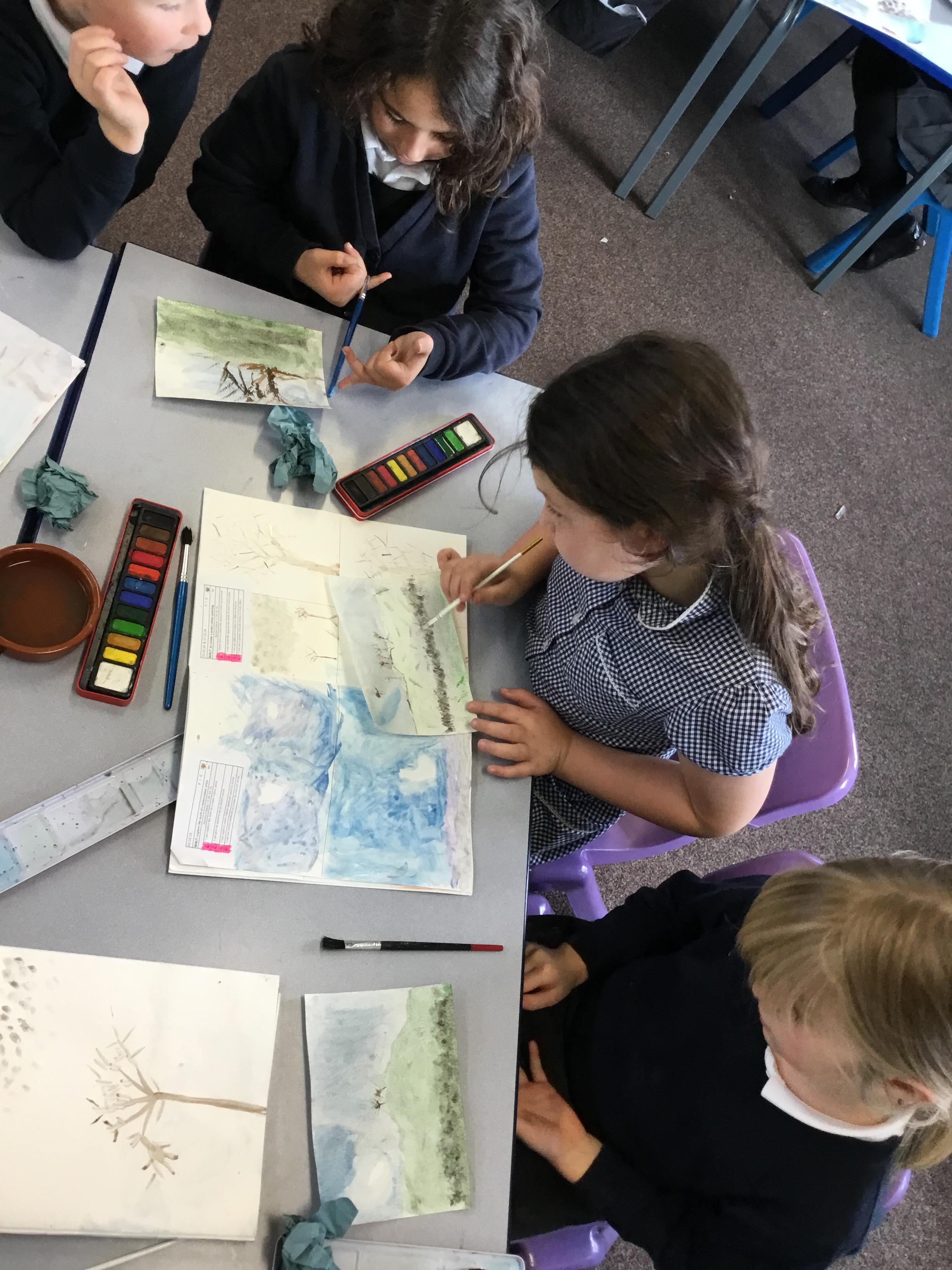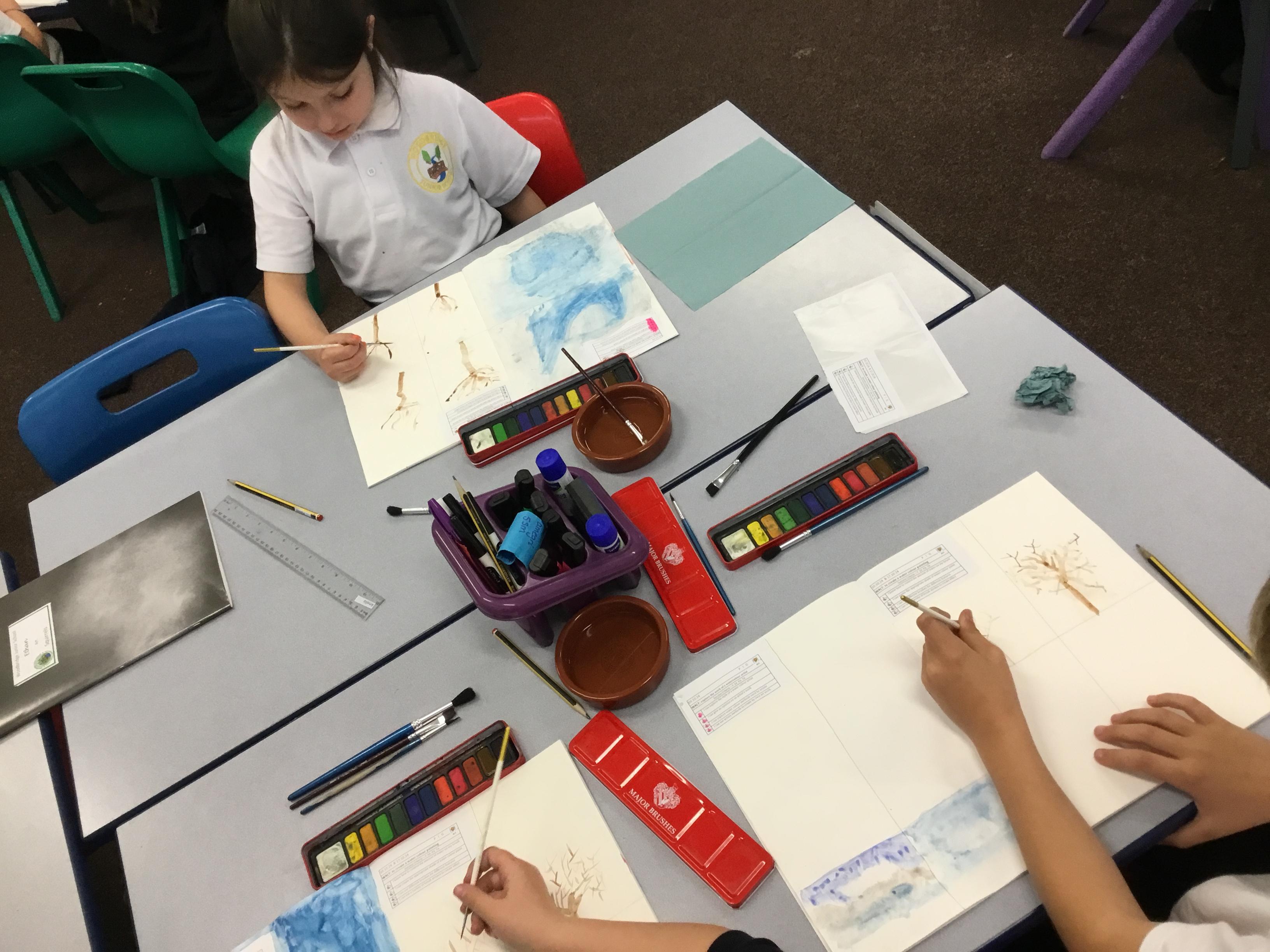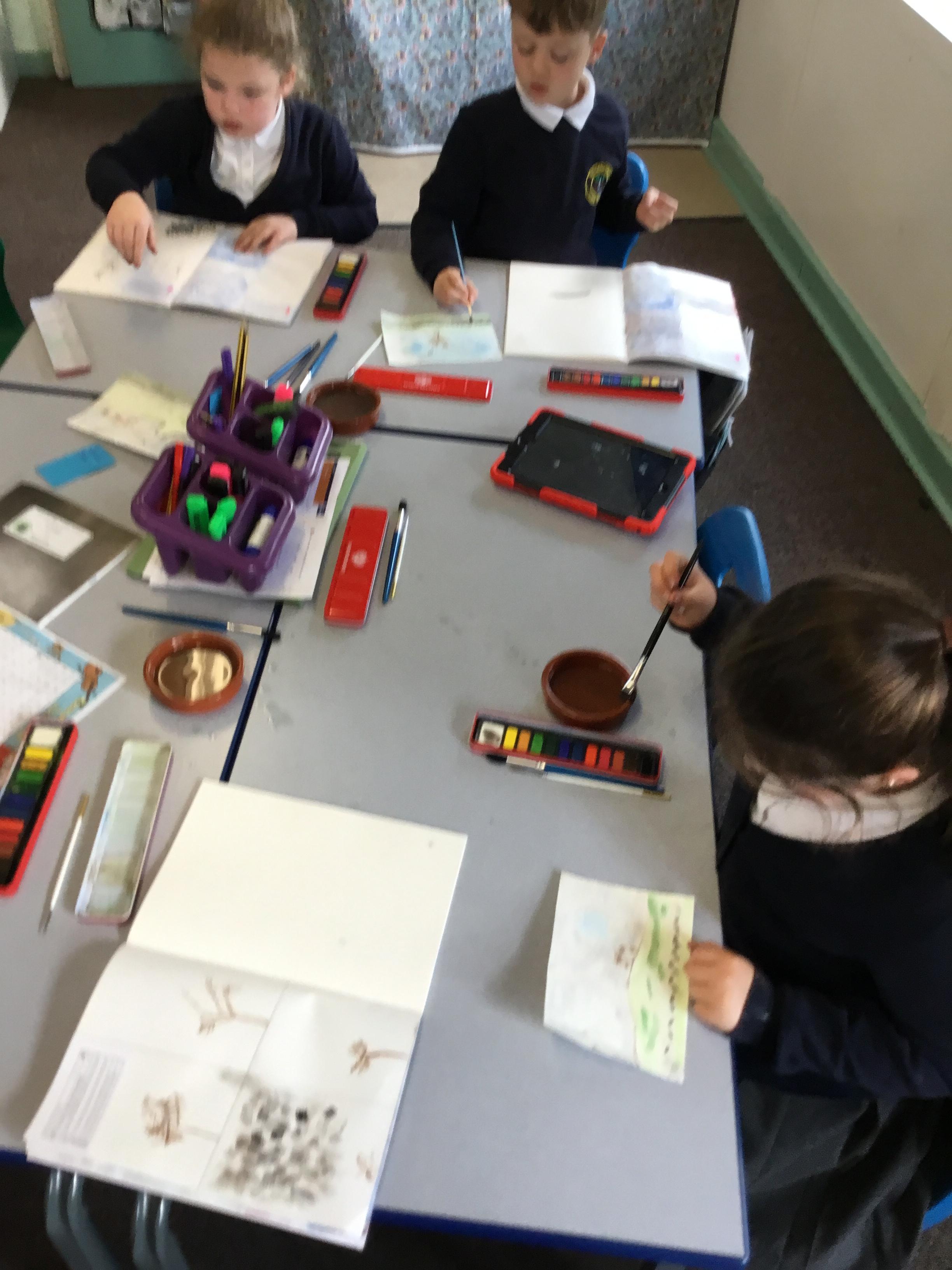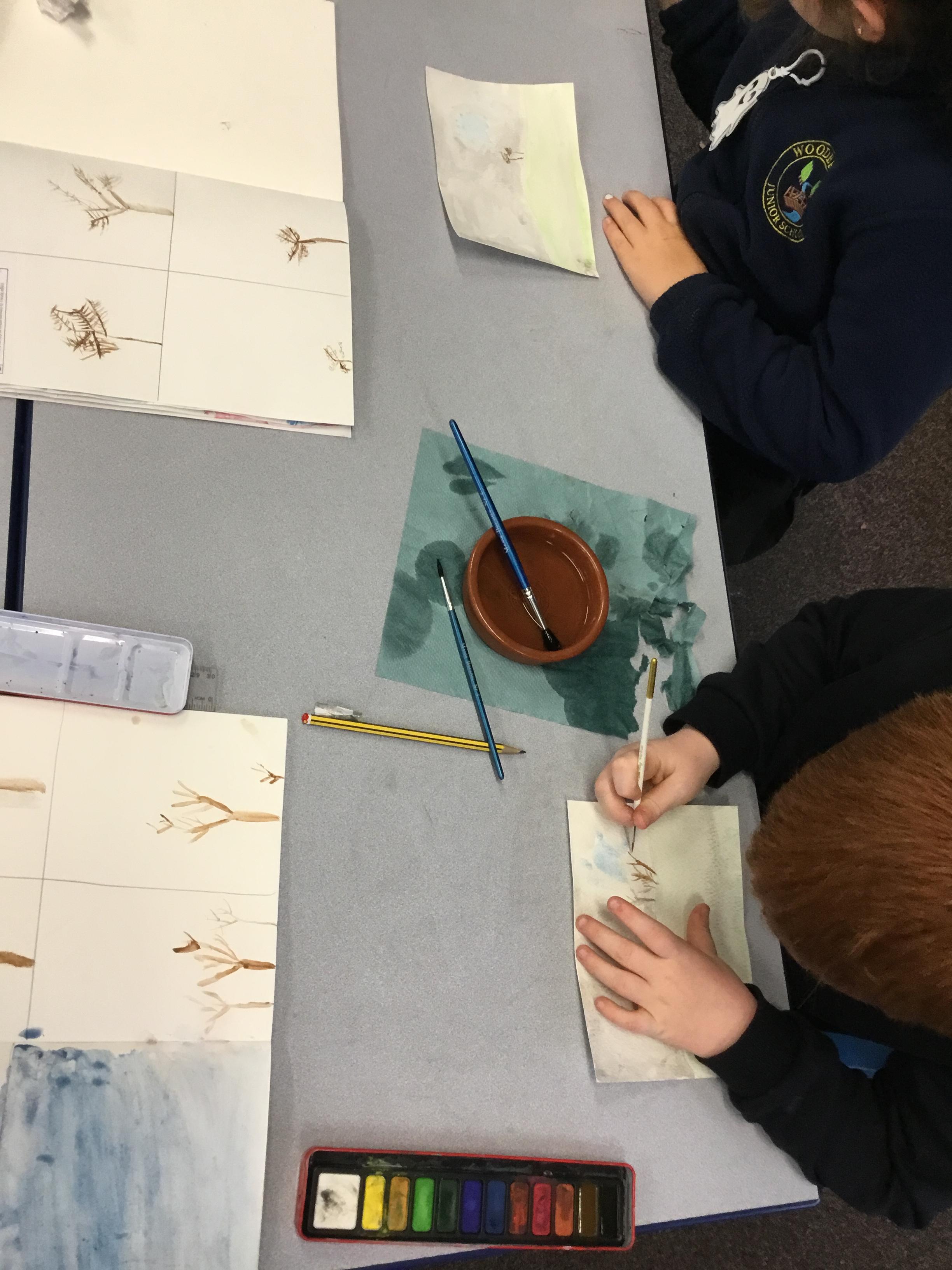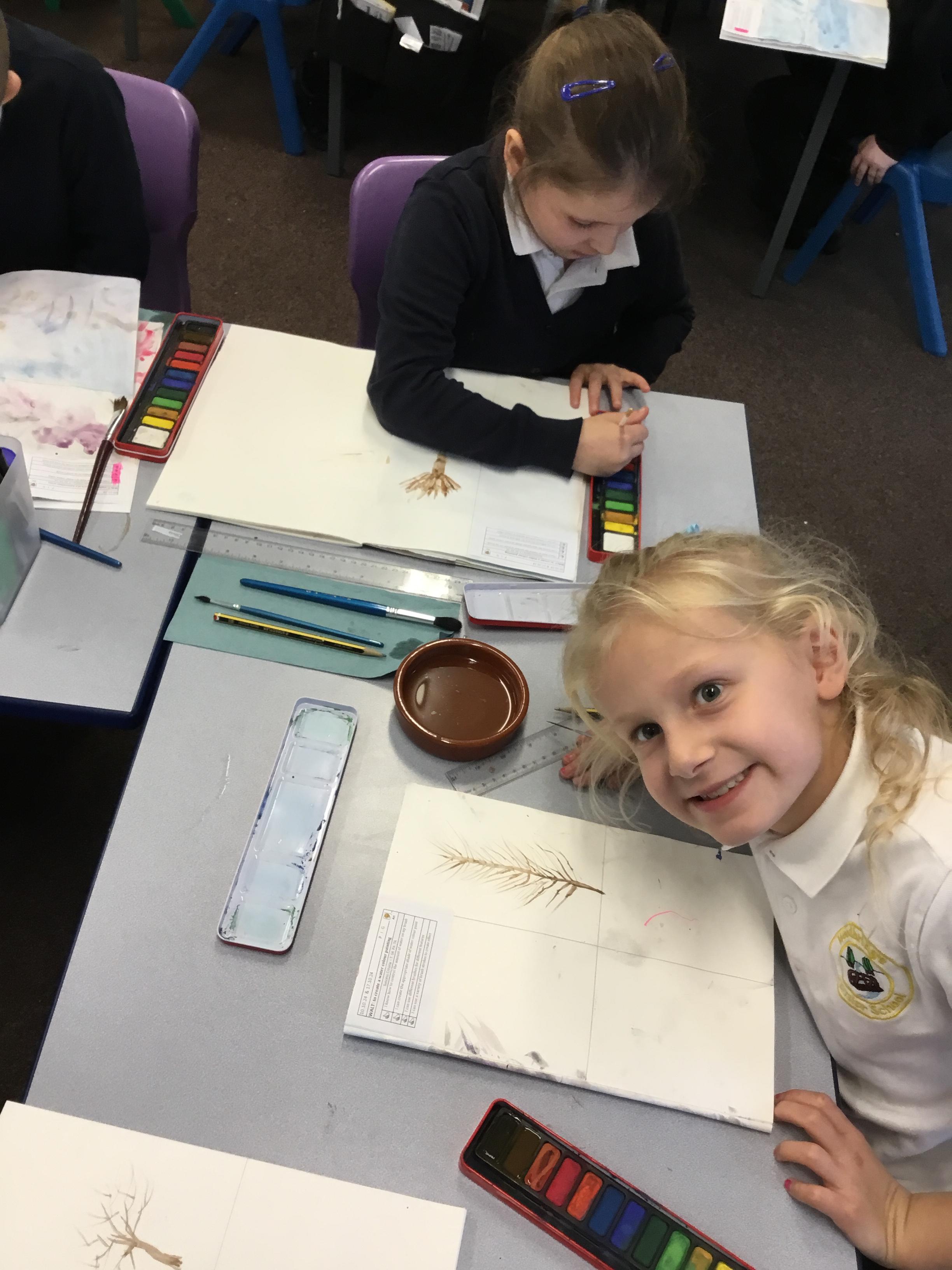 We perfected watercolour trees, before adding these to our backgrounds in Art.