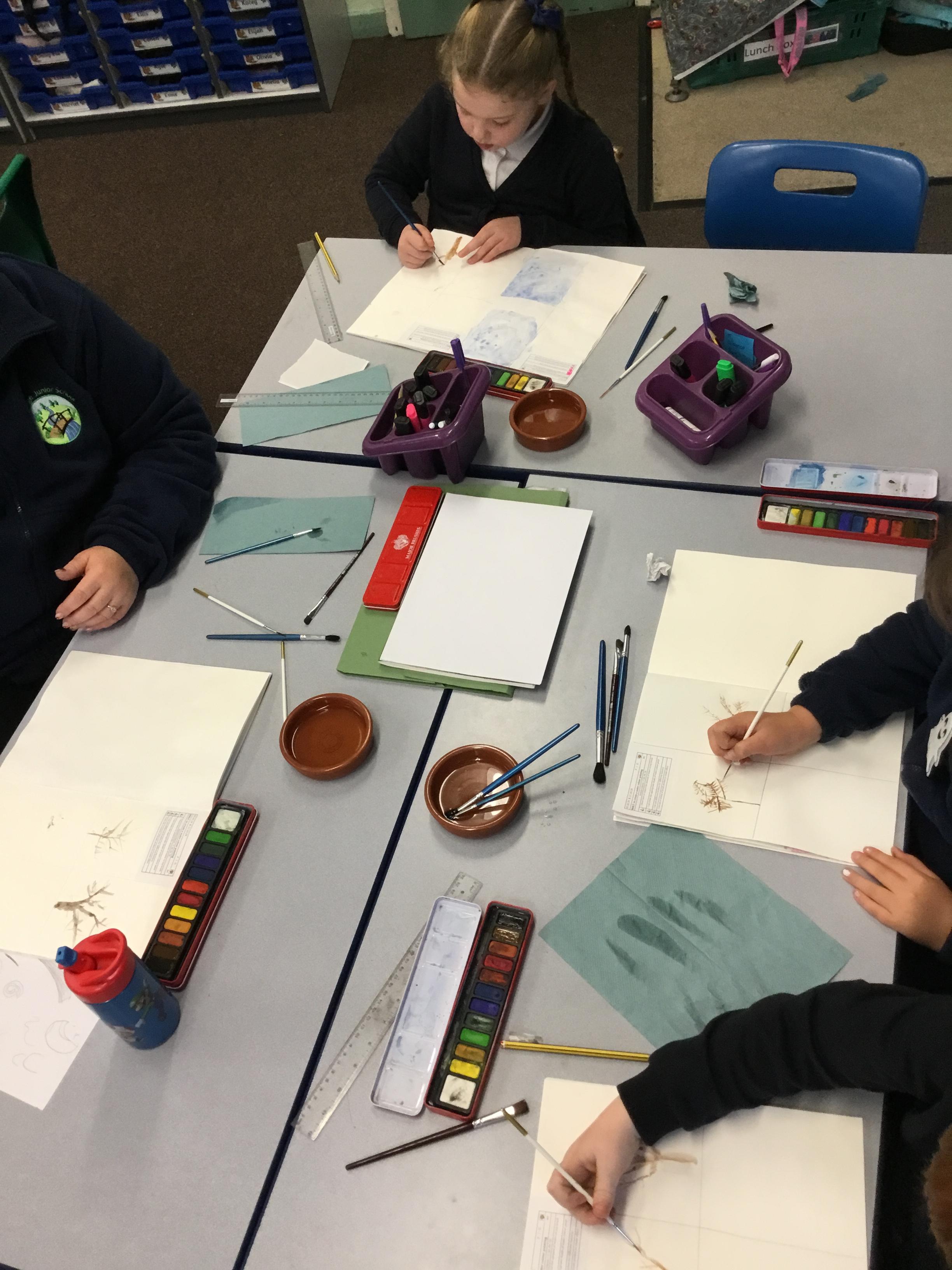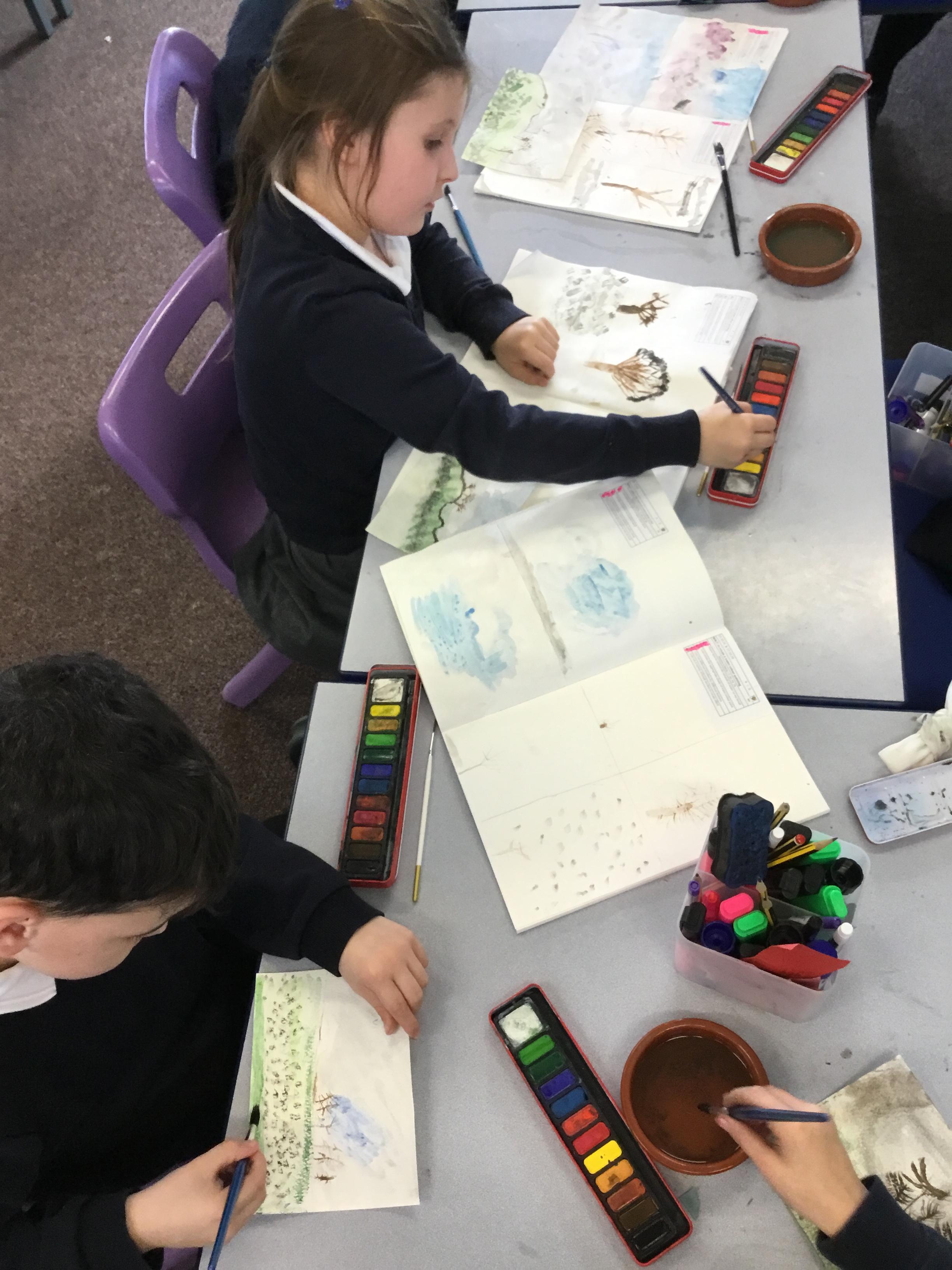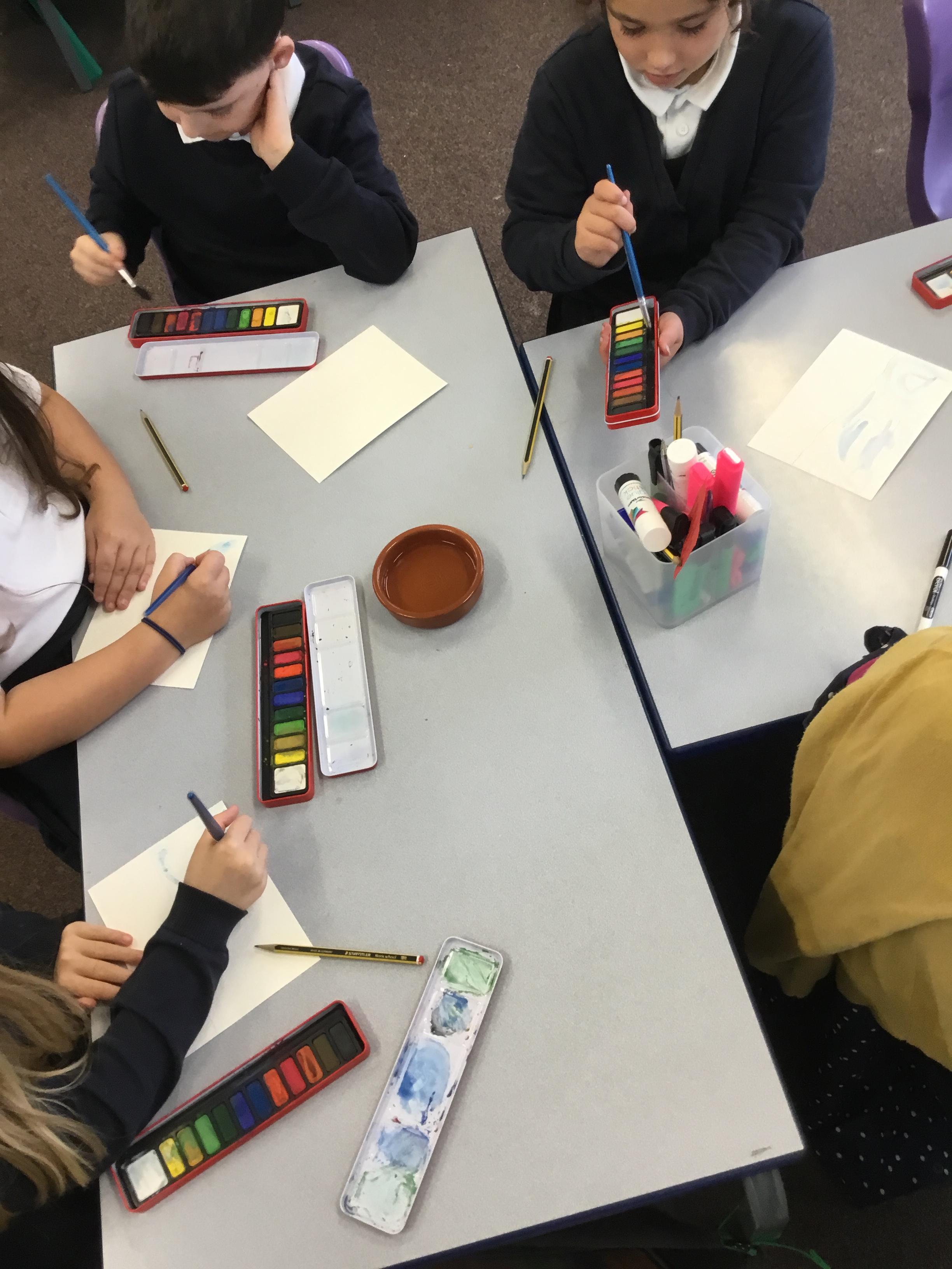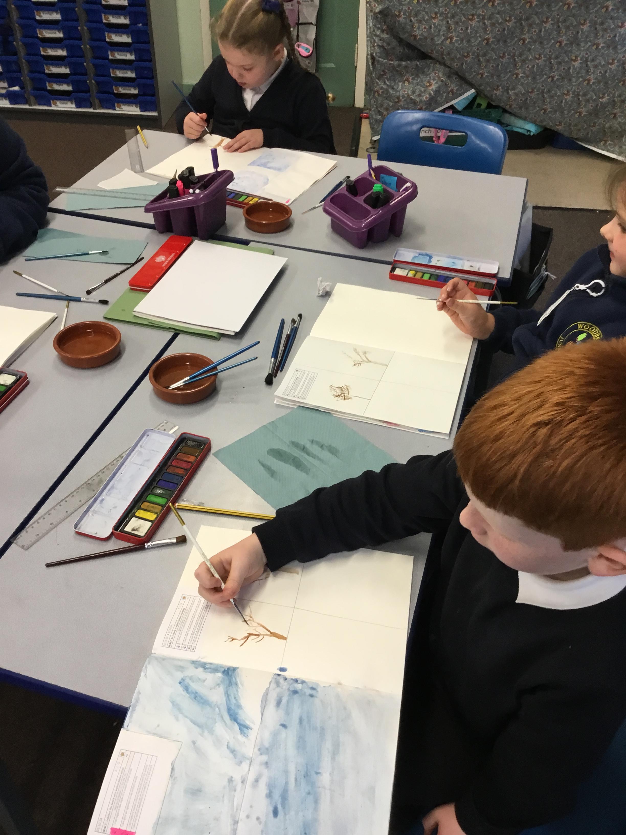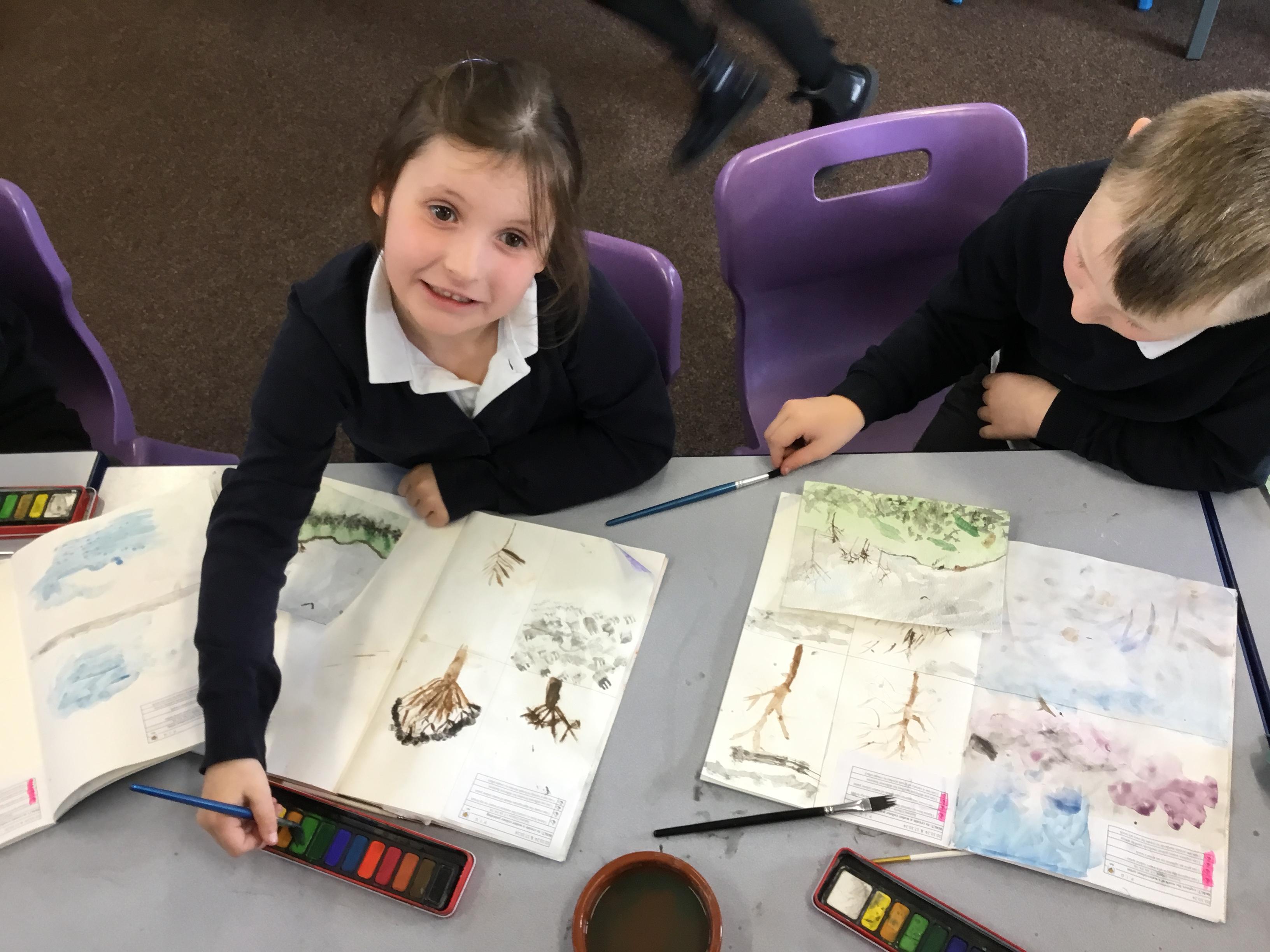 We perfected watercolour trees, before adding these to our backgrounds in Art.