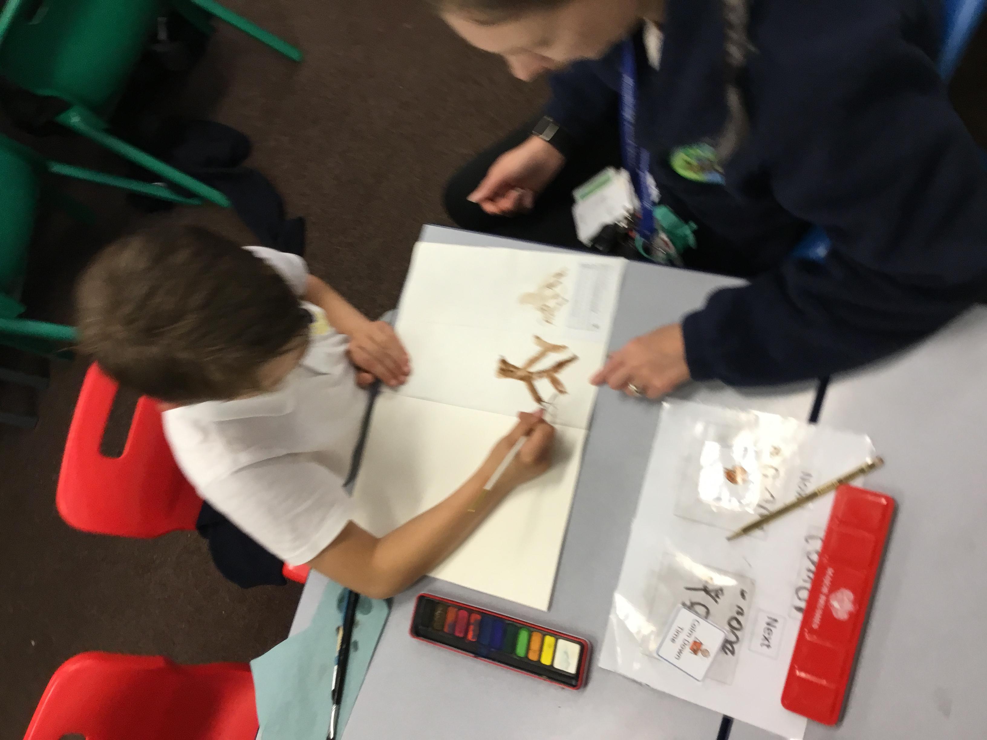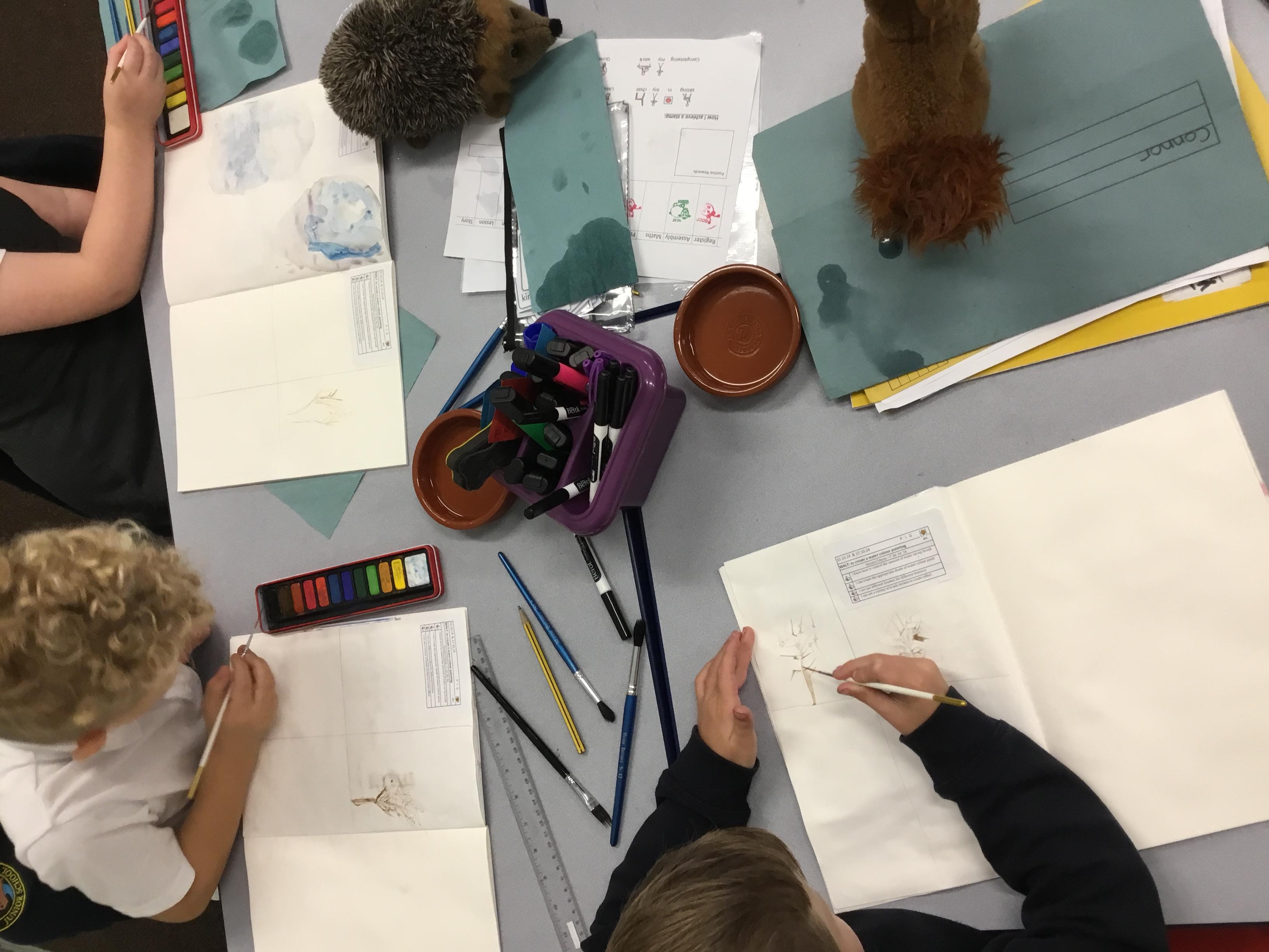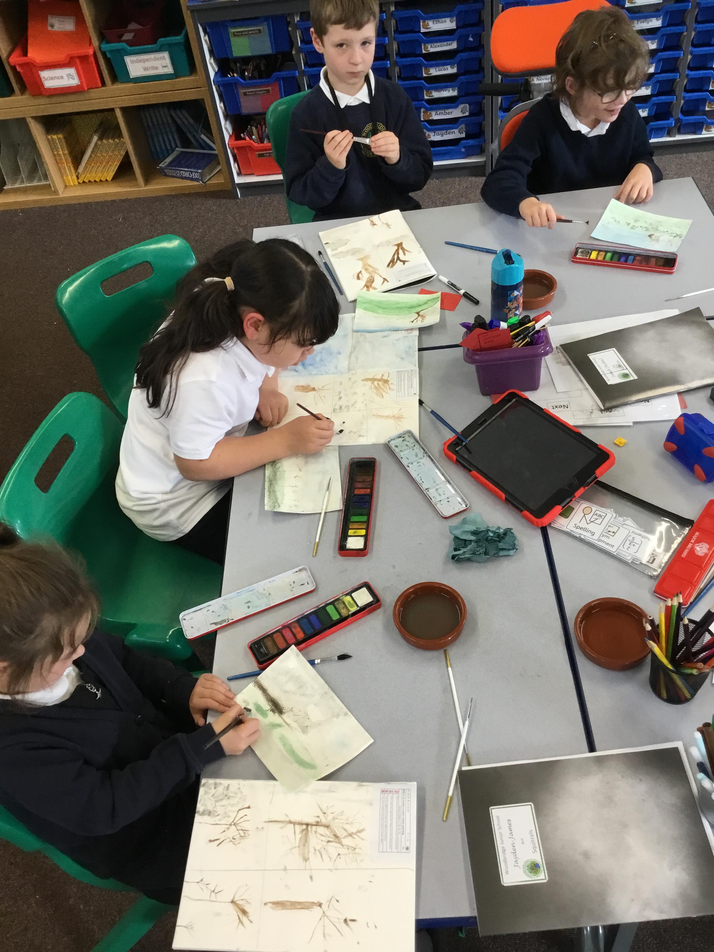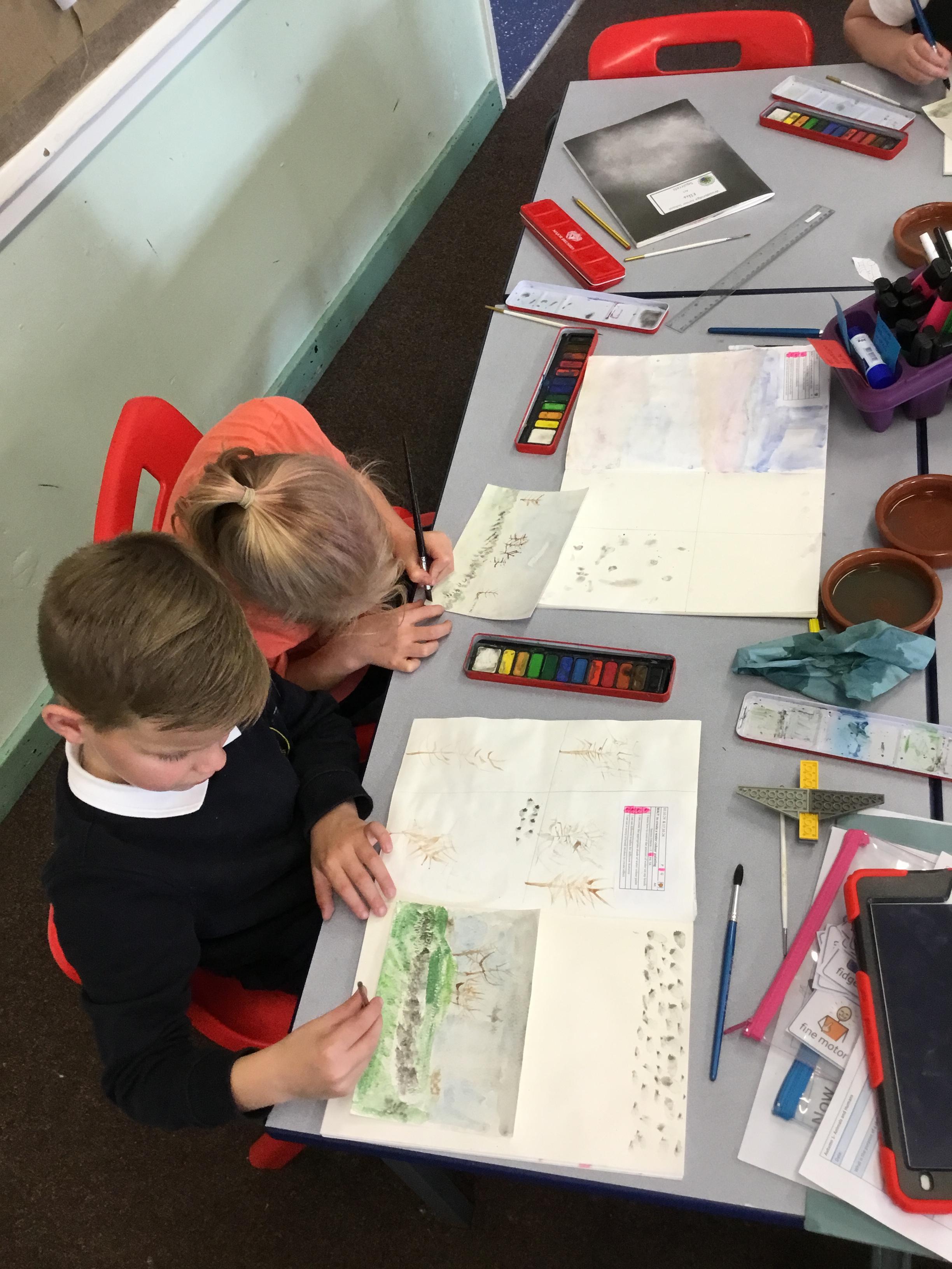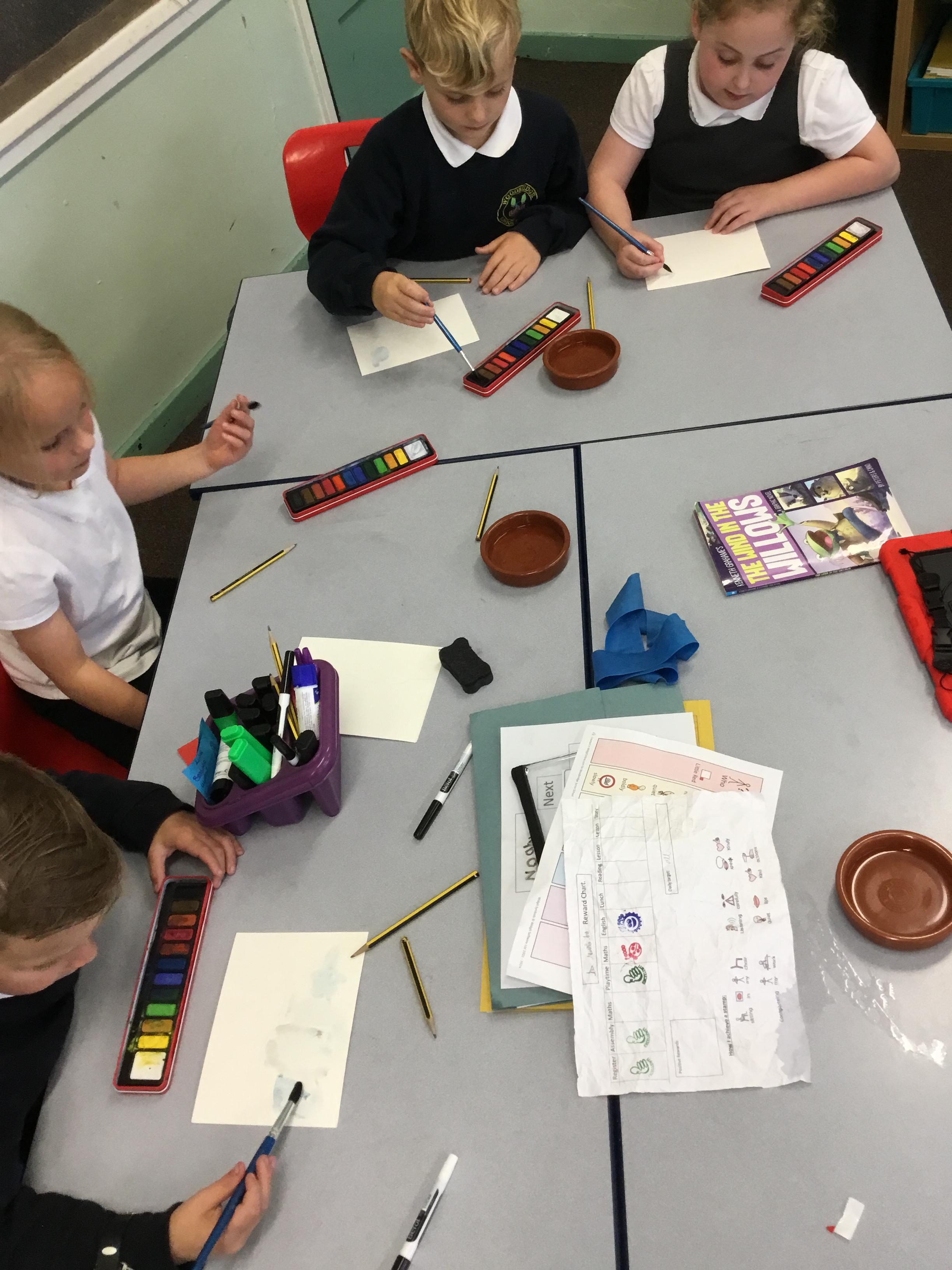 We perfected watercolour trees, before adding these to our backgrounds in Art.