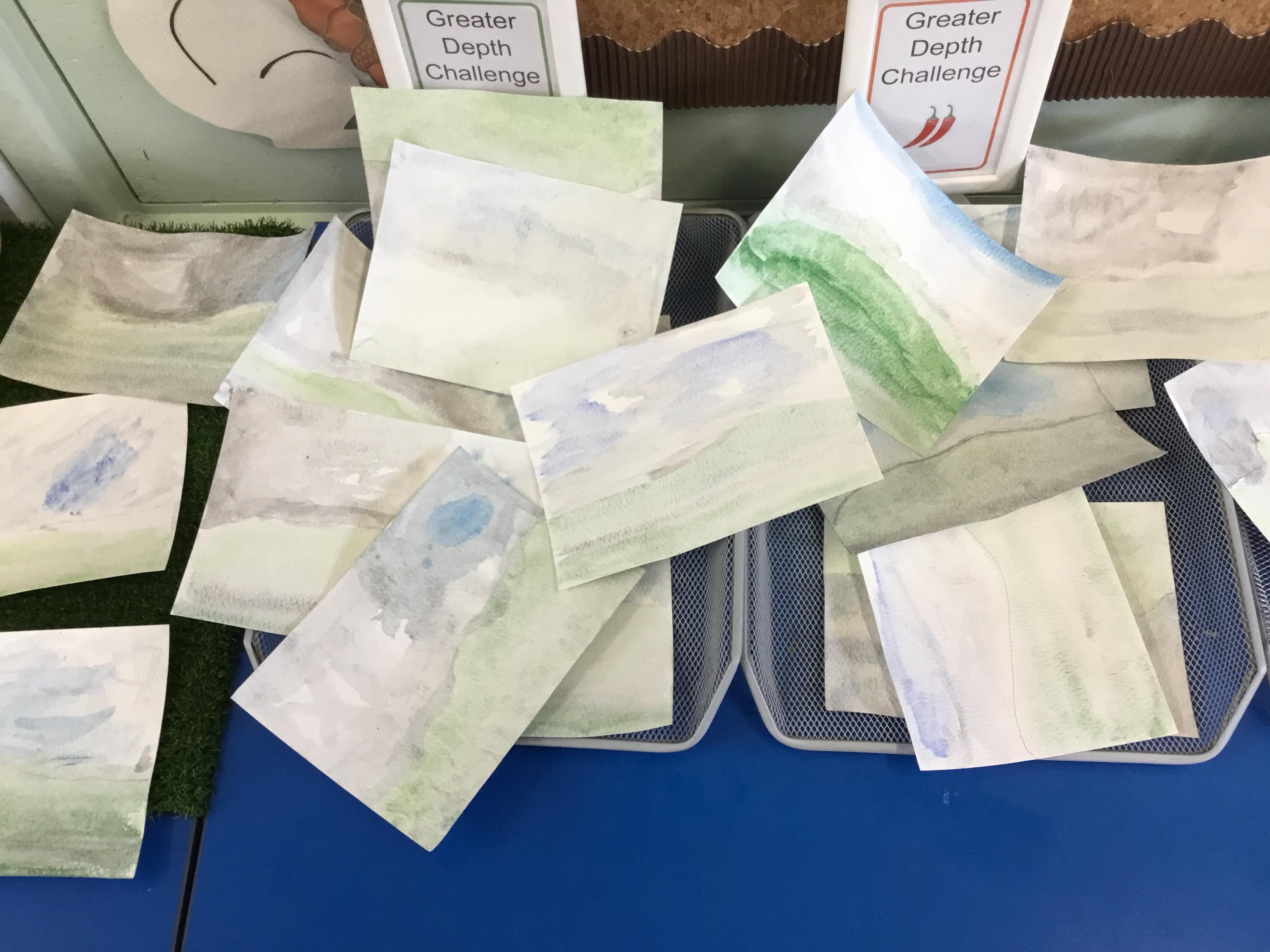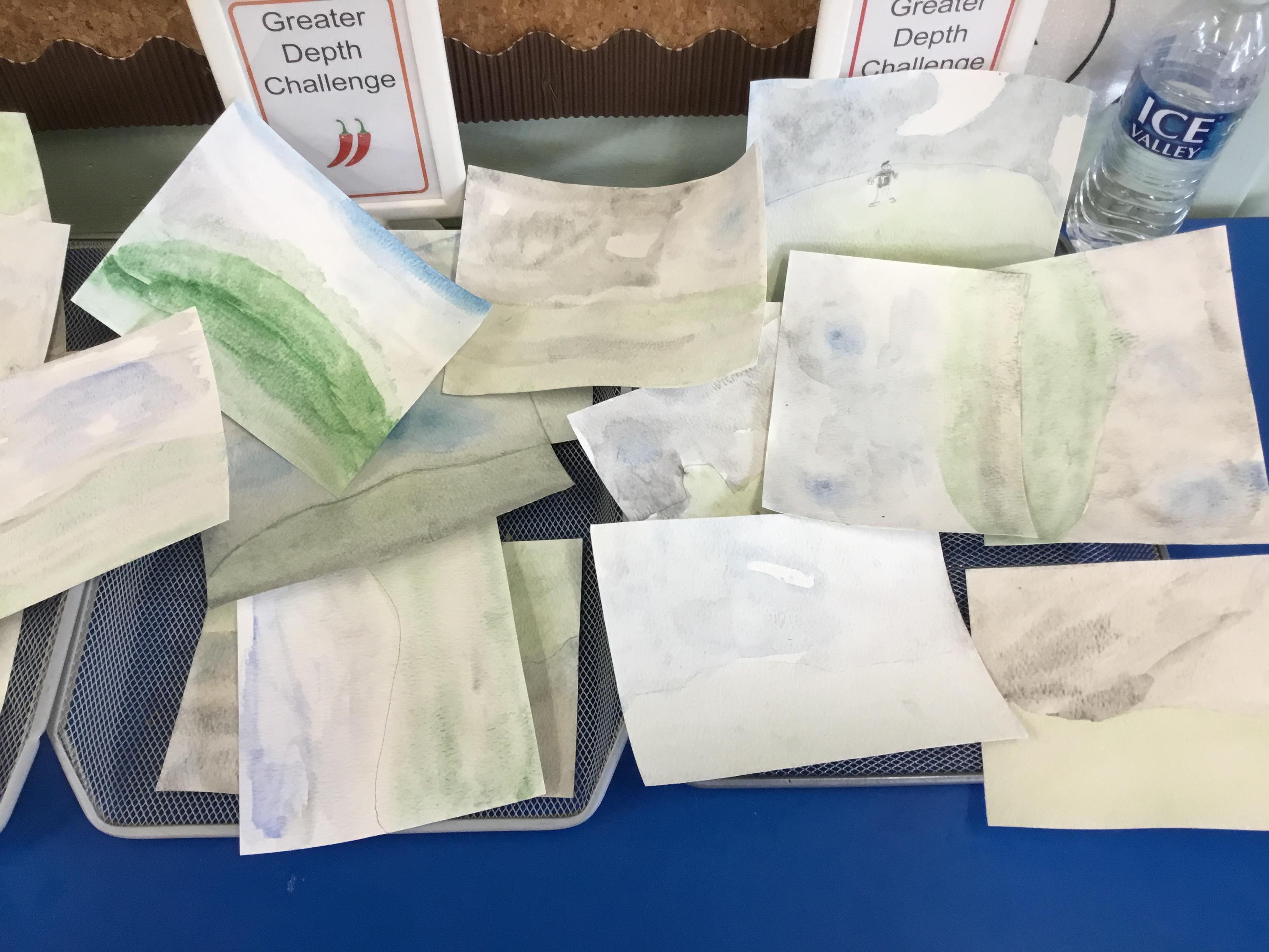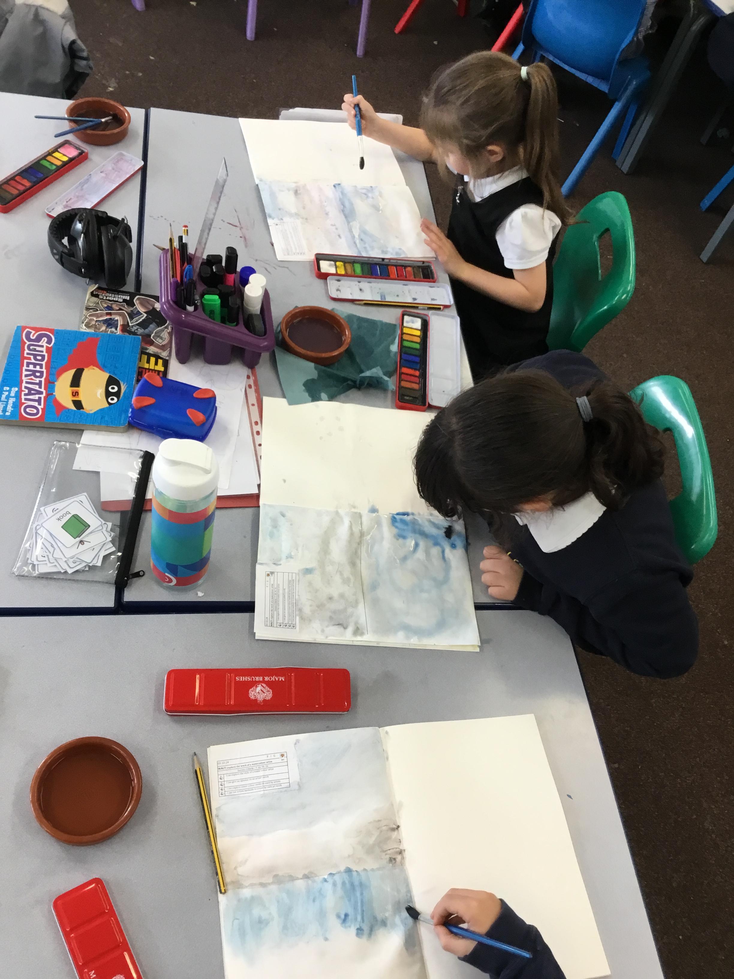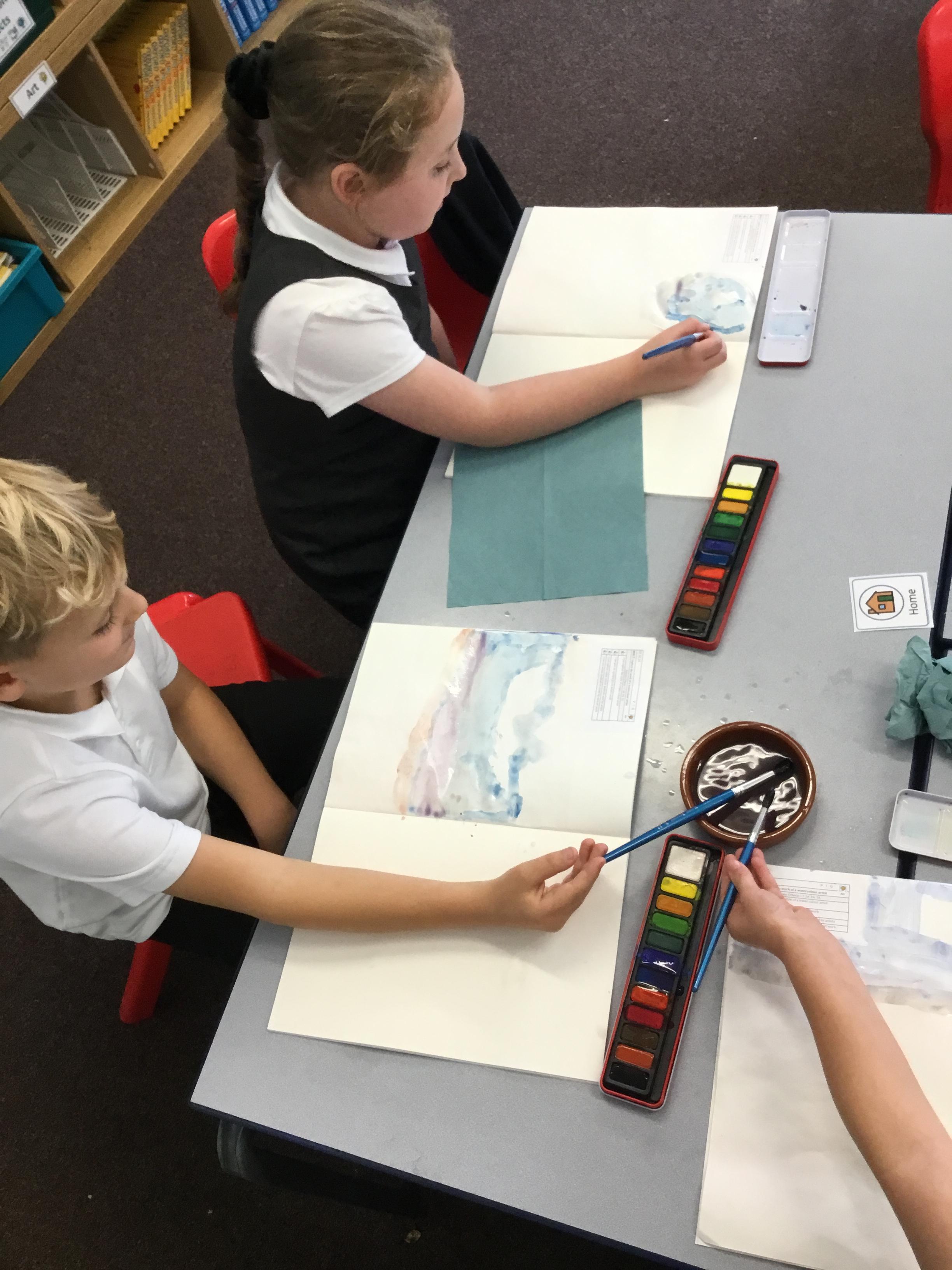 We began to paint our watercolour backgrounds this week in Art. We drew in the horizon line, then used the skills we had practiced to create a sky and a colour wash bottom half.
