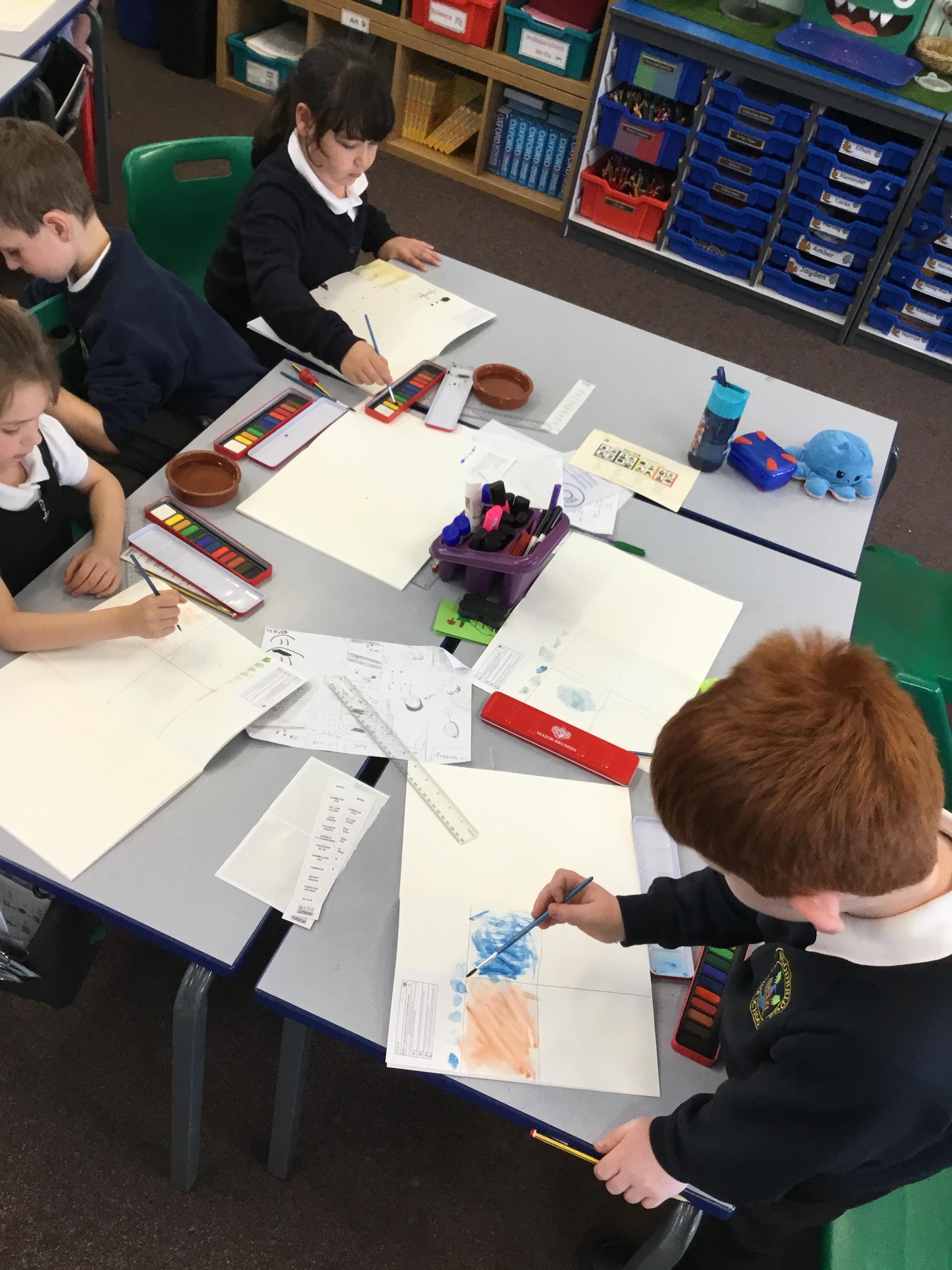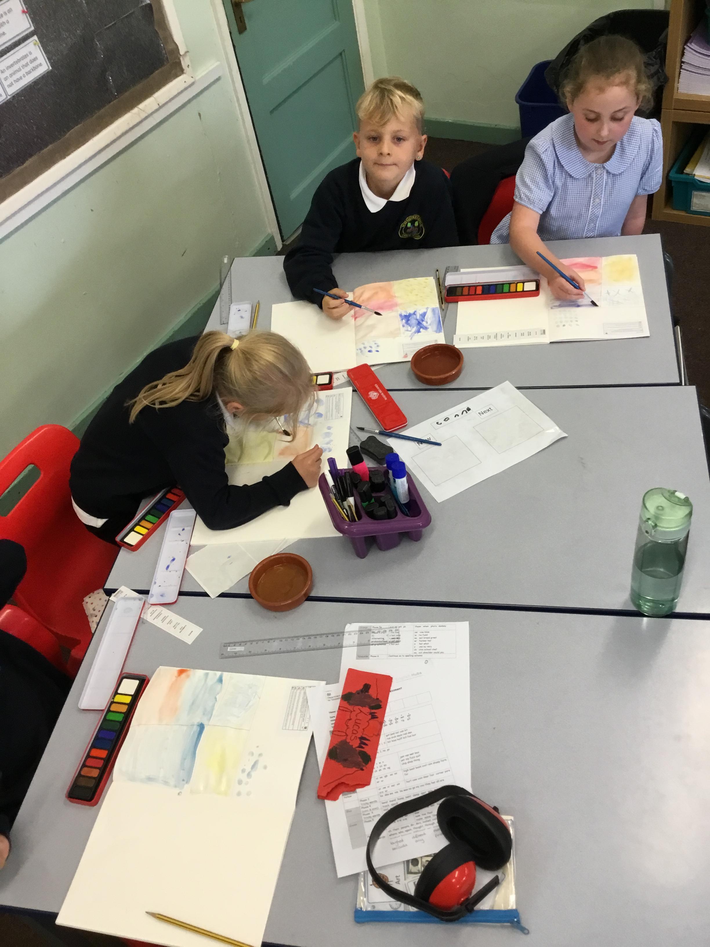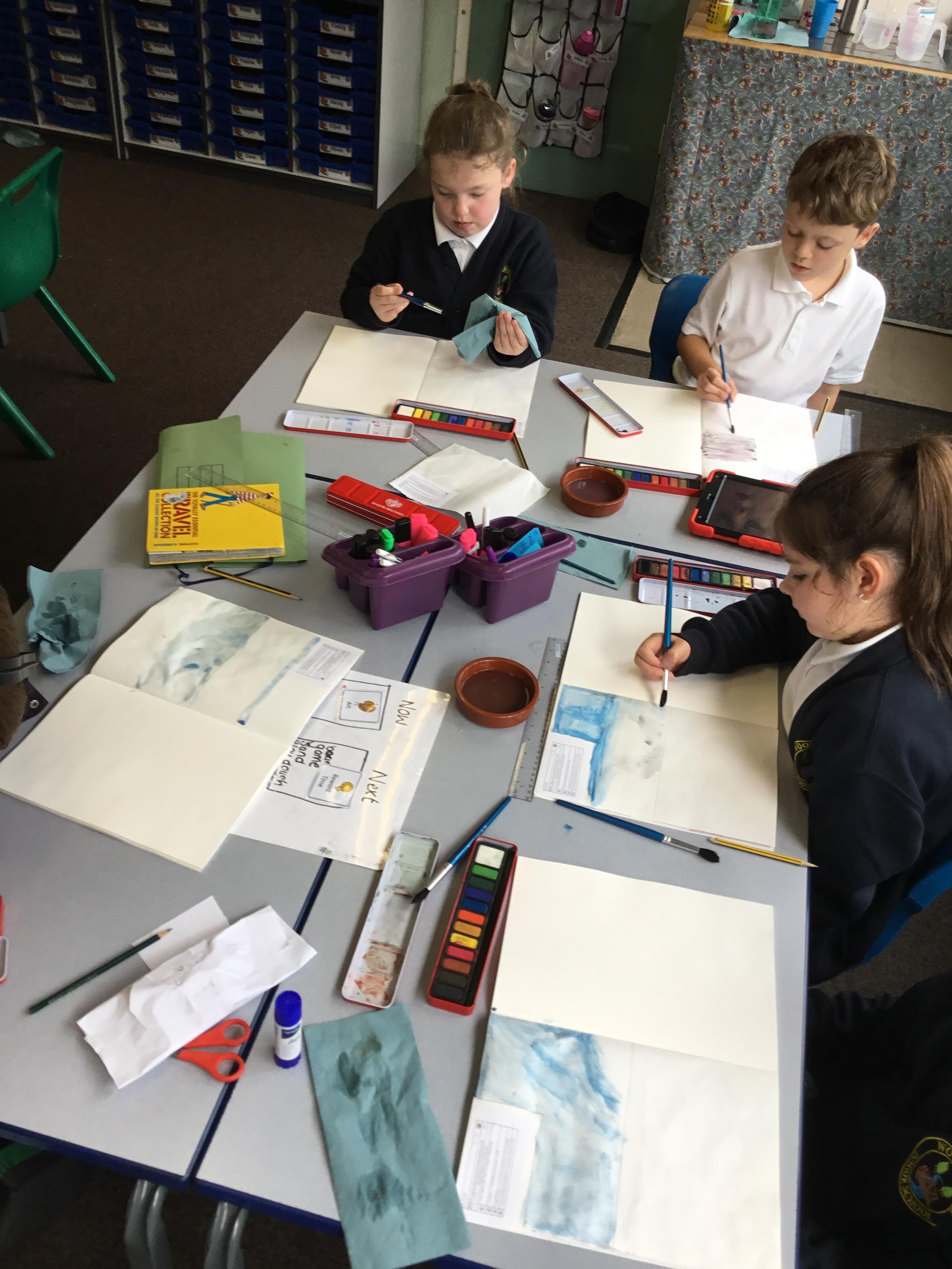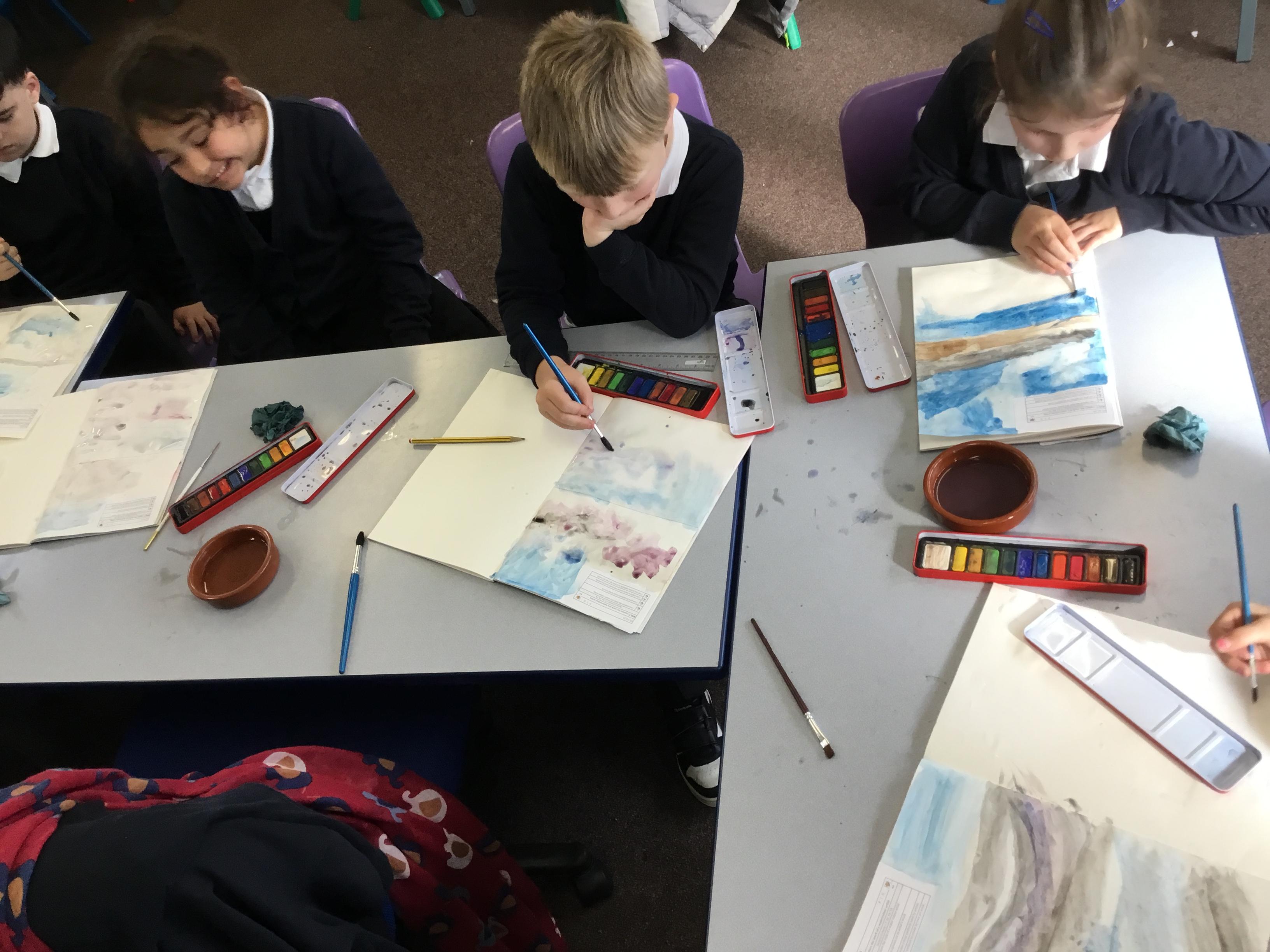 We began to paint our watercolour backgrounds this week in Art. We drew in the horizon line, then used the skills we had practiced to create a sky and a colour wash bottom half.