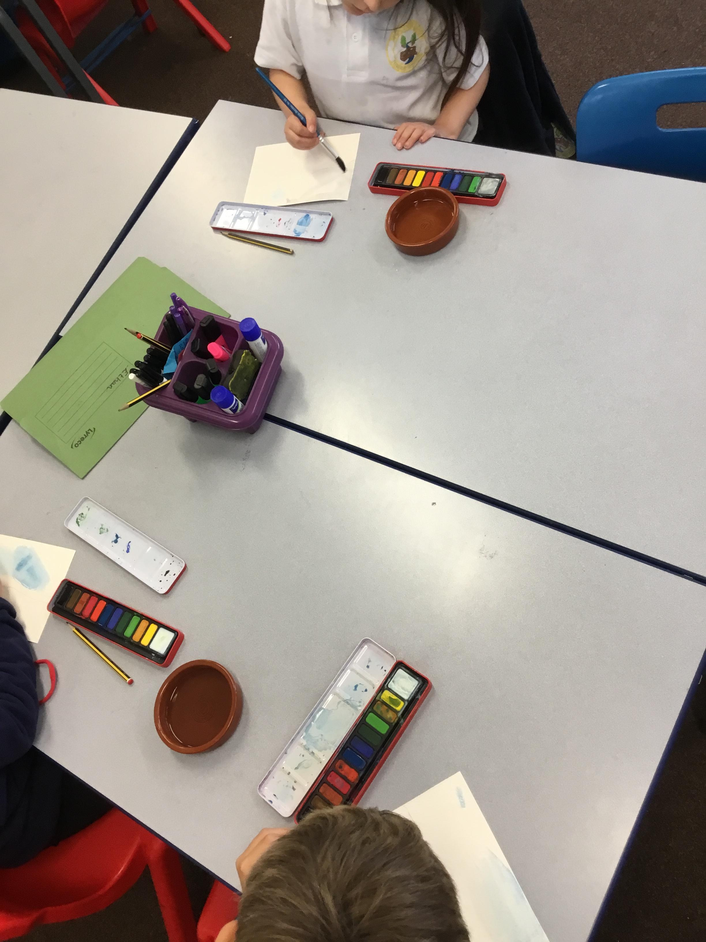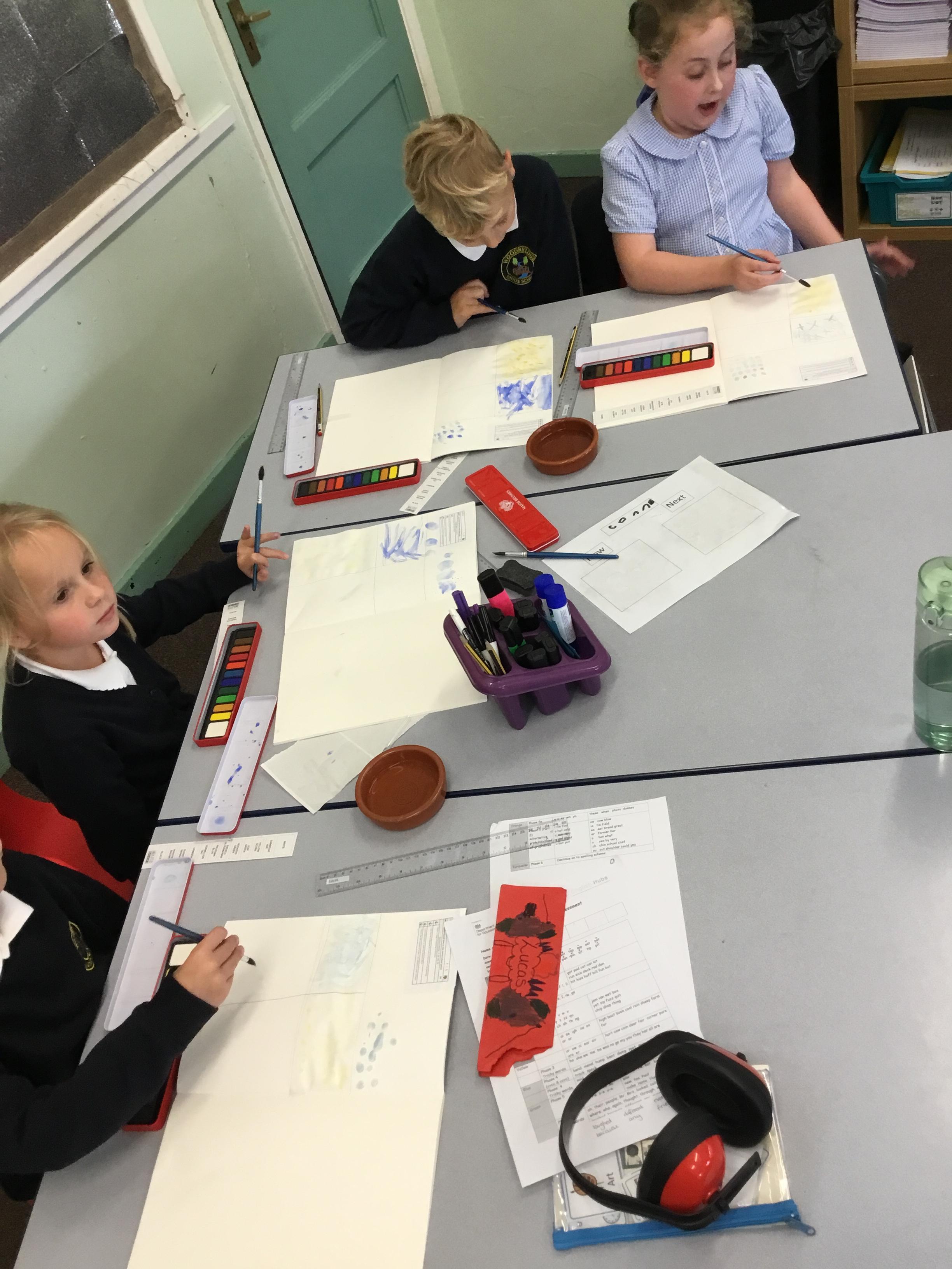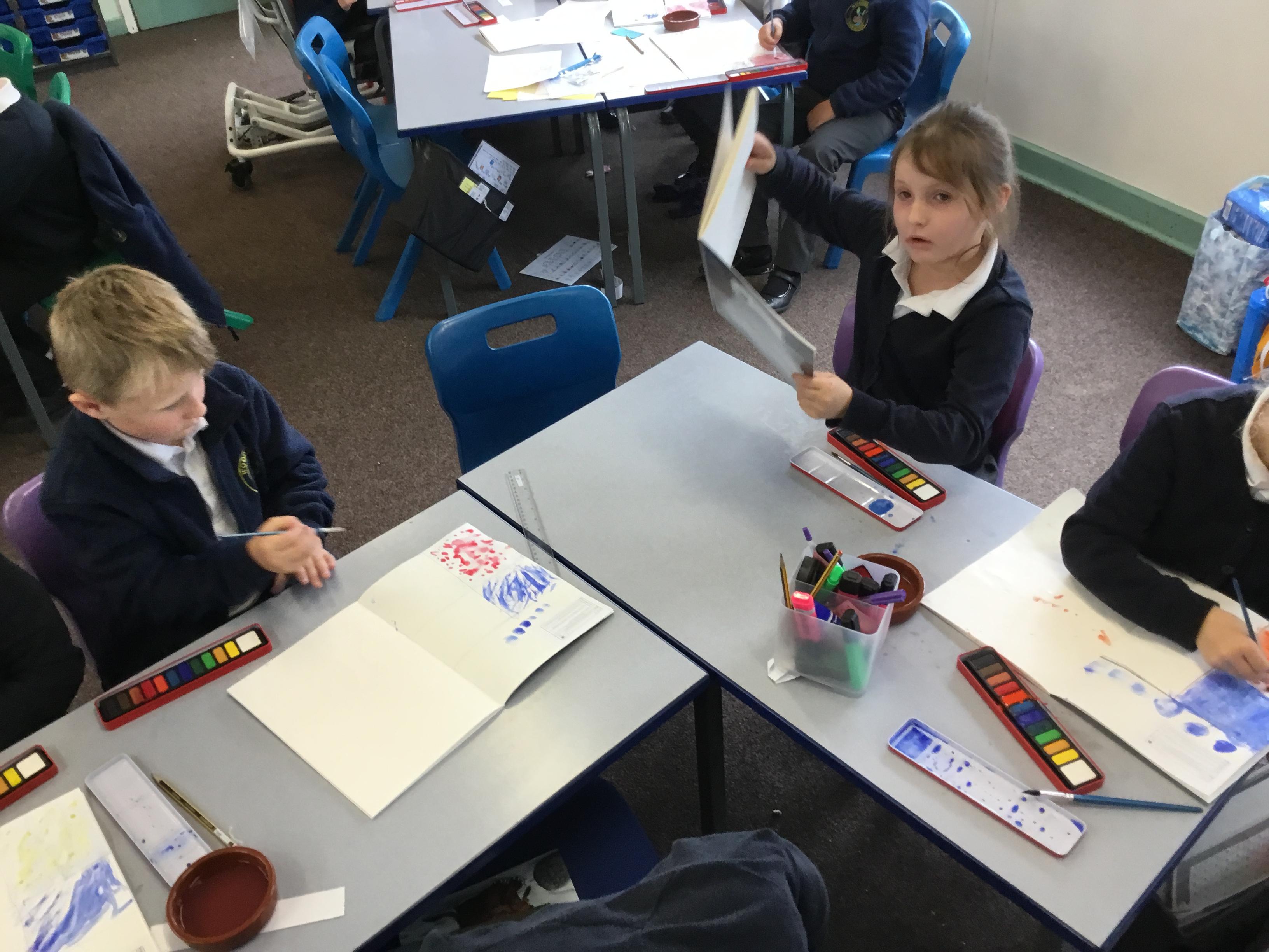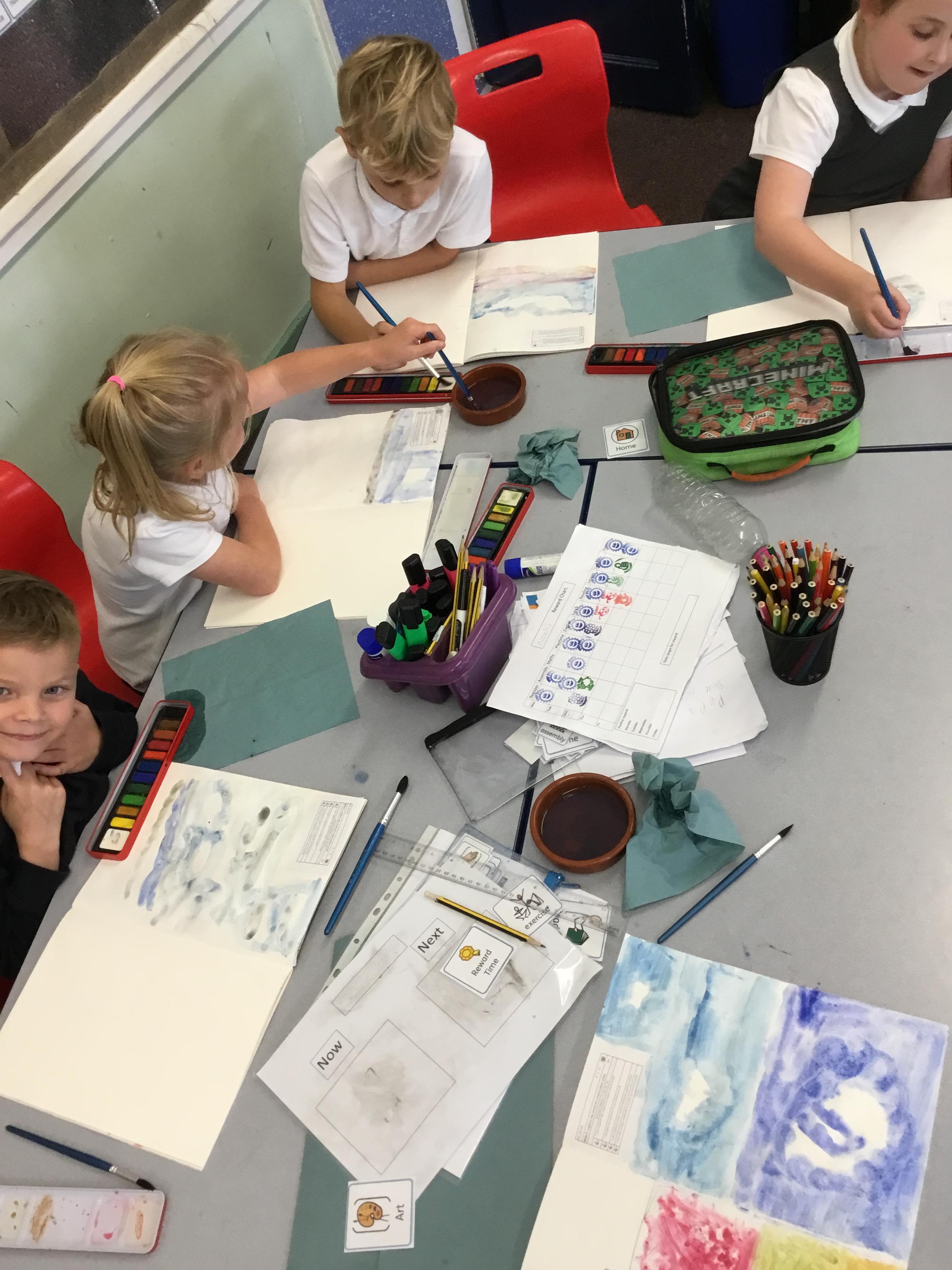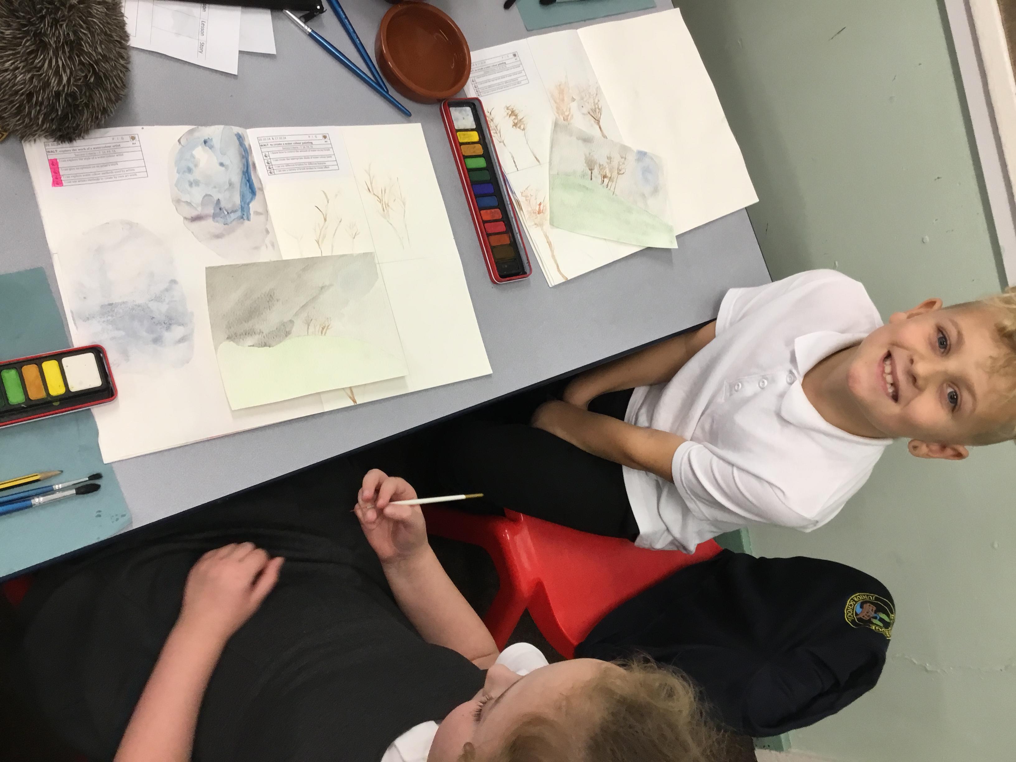 We began to paint our watercolour backgrounds this week in Art. We drew in the horizon line, then used the skills we had practiced to create a sky and a colour wash bottom half.