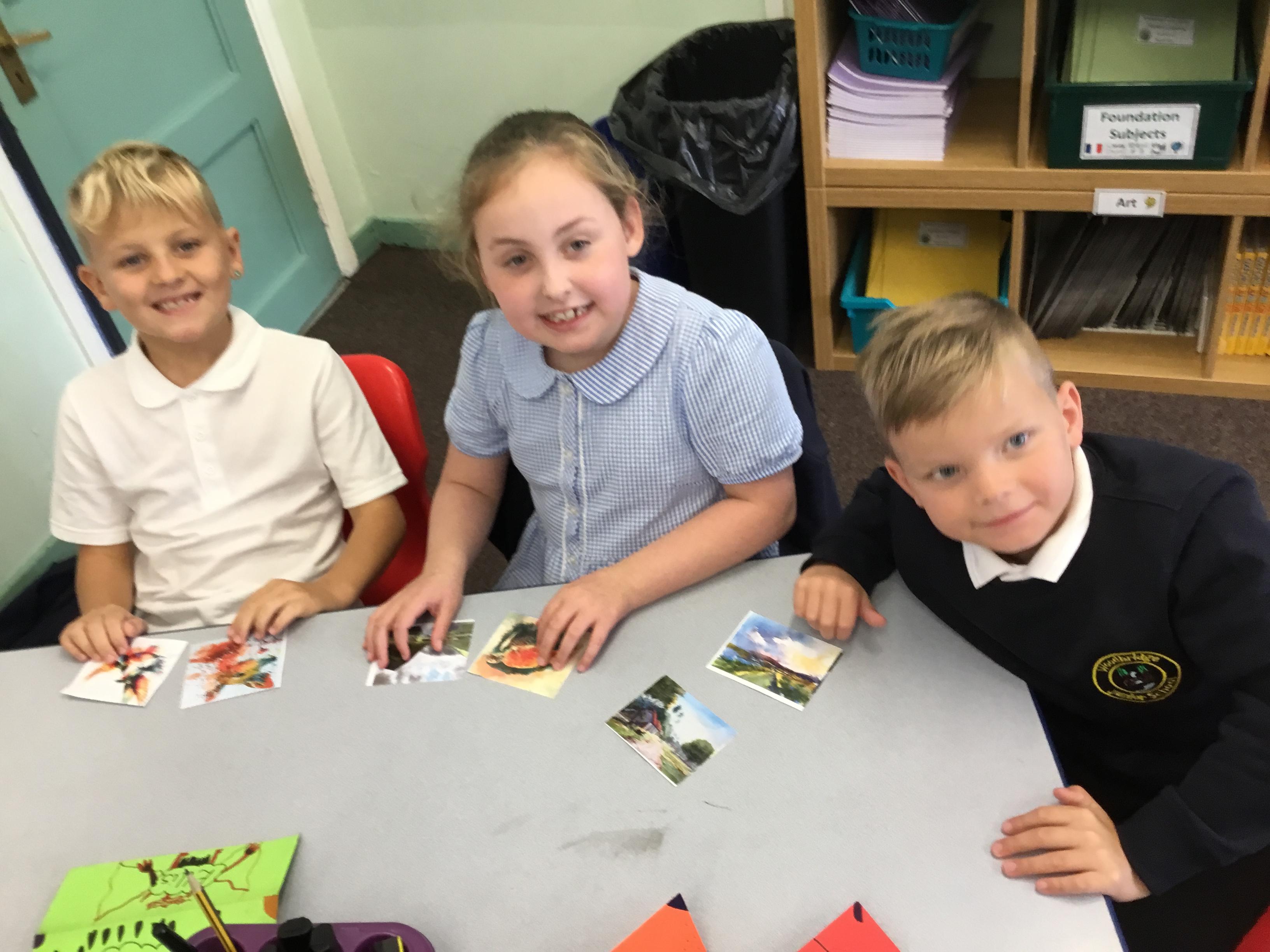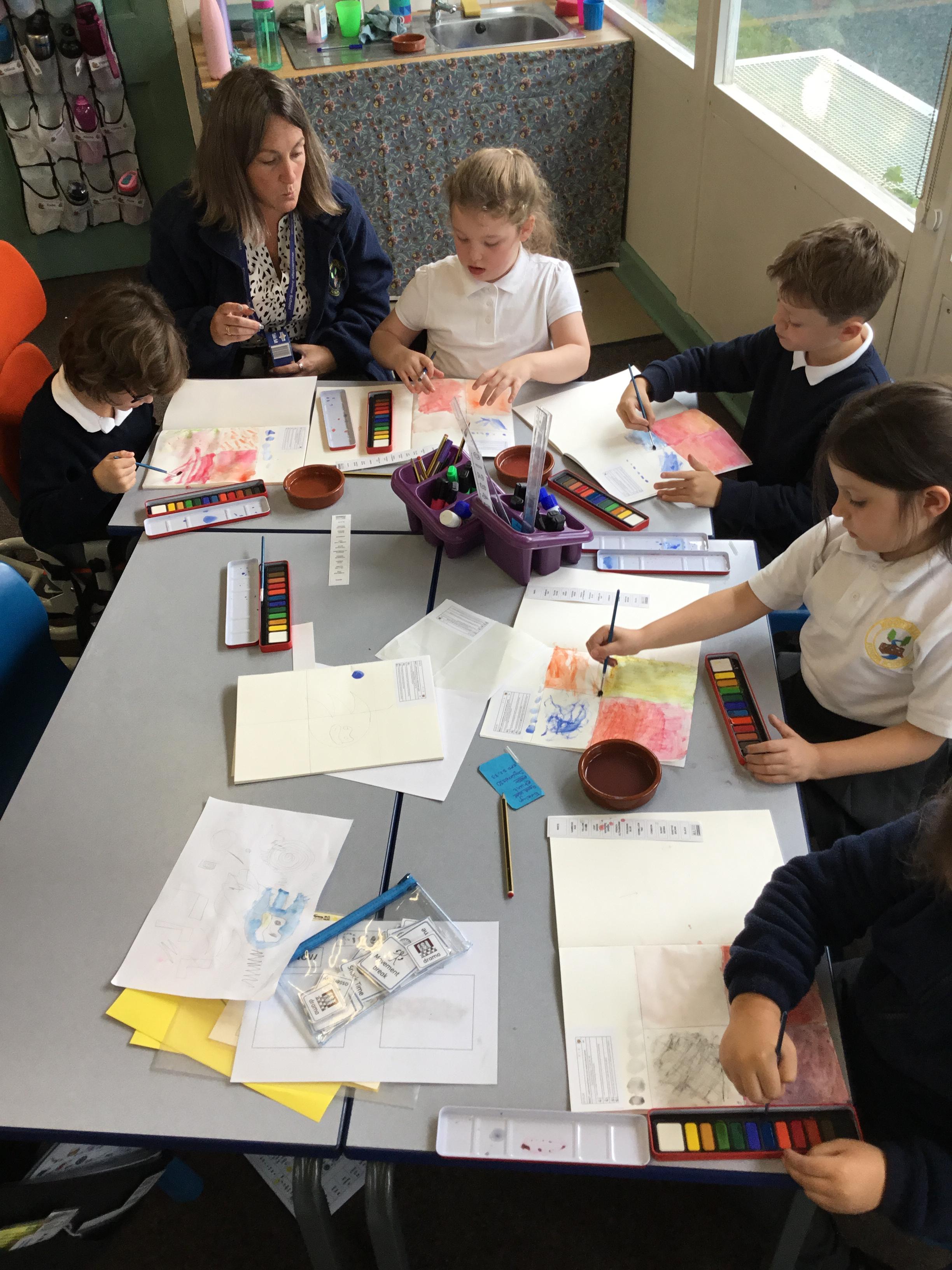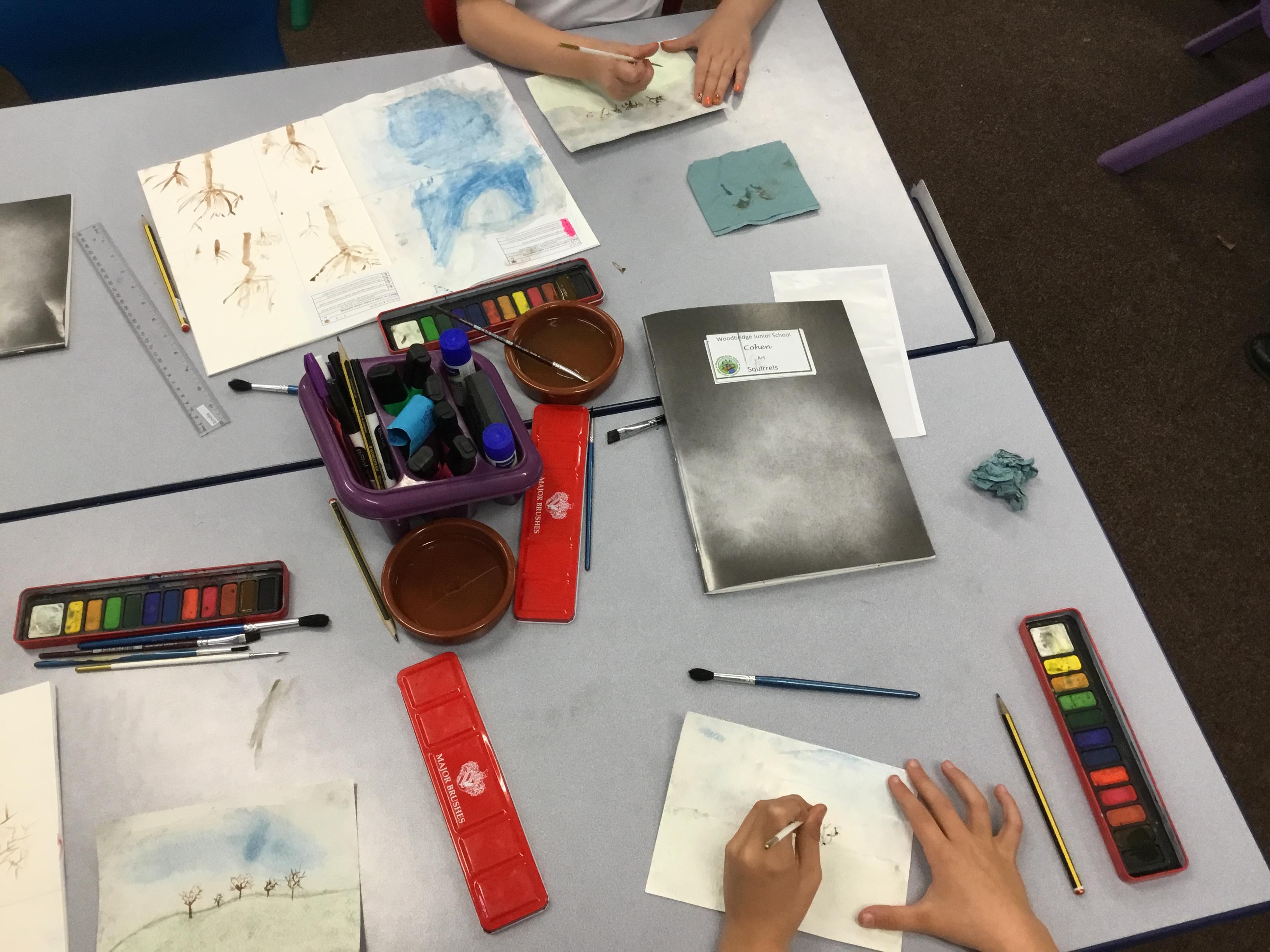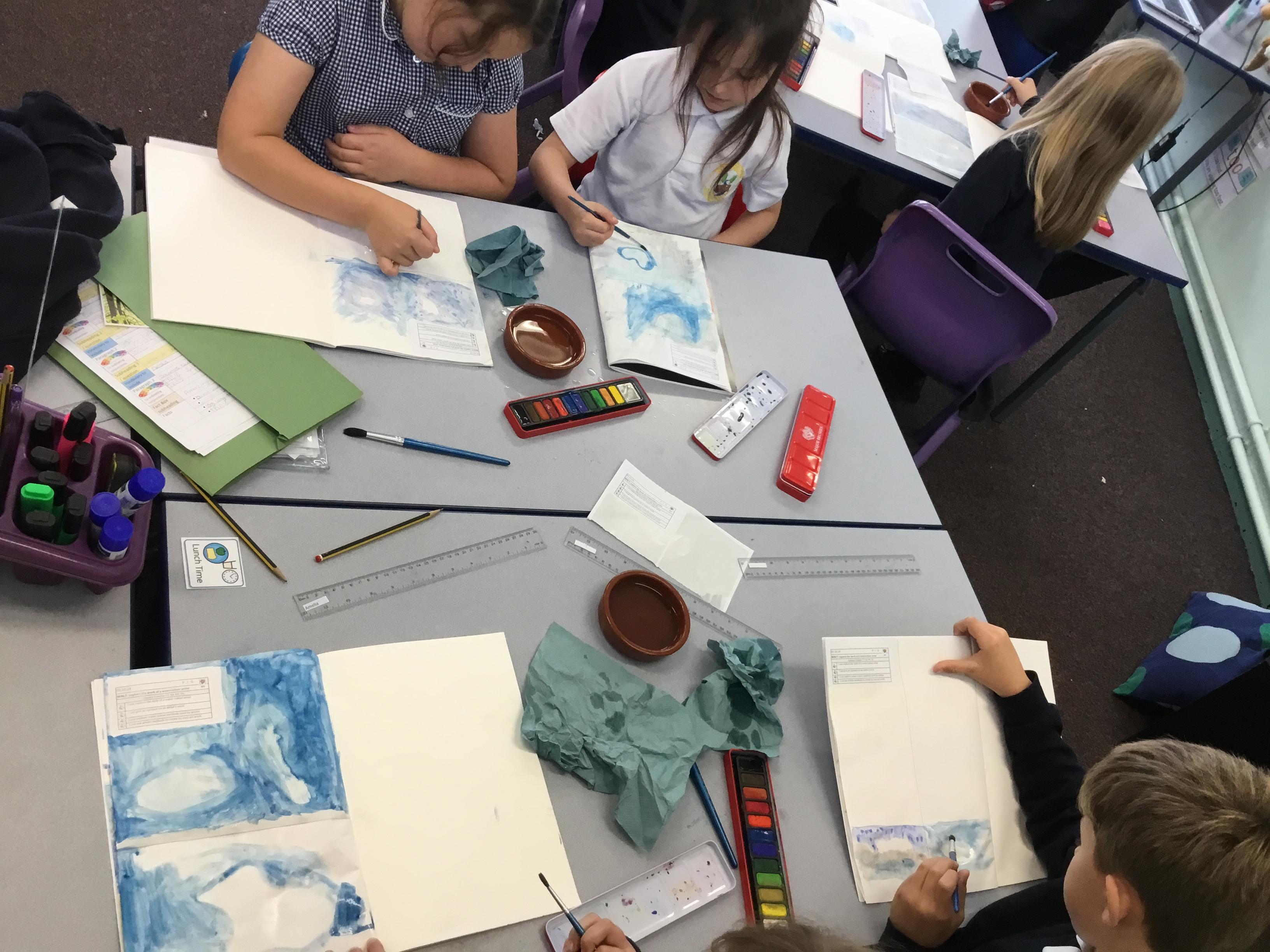 We began to paint our watercolour backgrounds this week in Art. We drew in the horizon line, then used the skills we had practiced to create a sky and a colour wash bottom half.