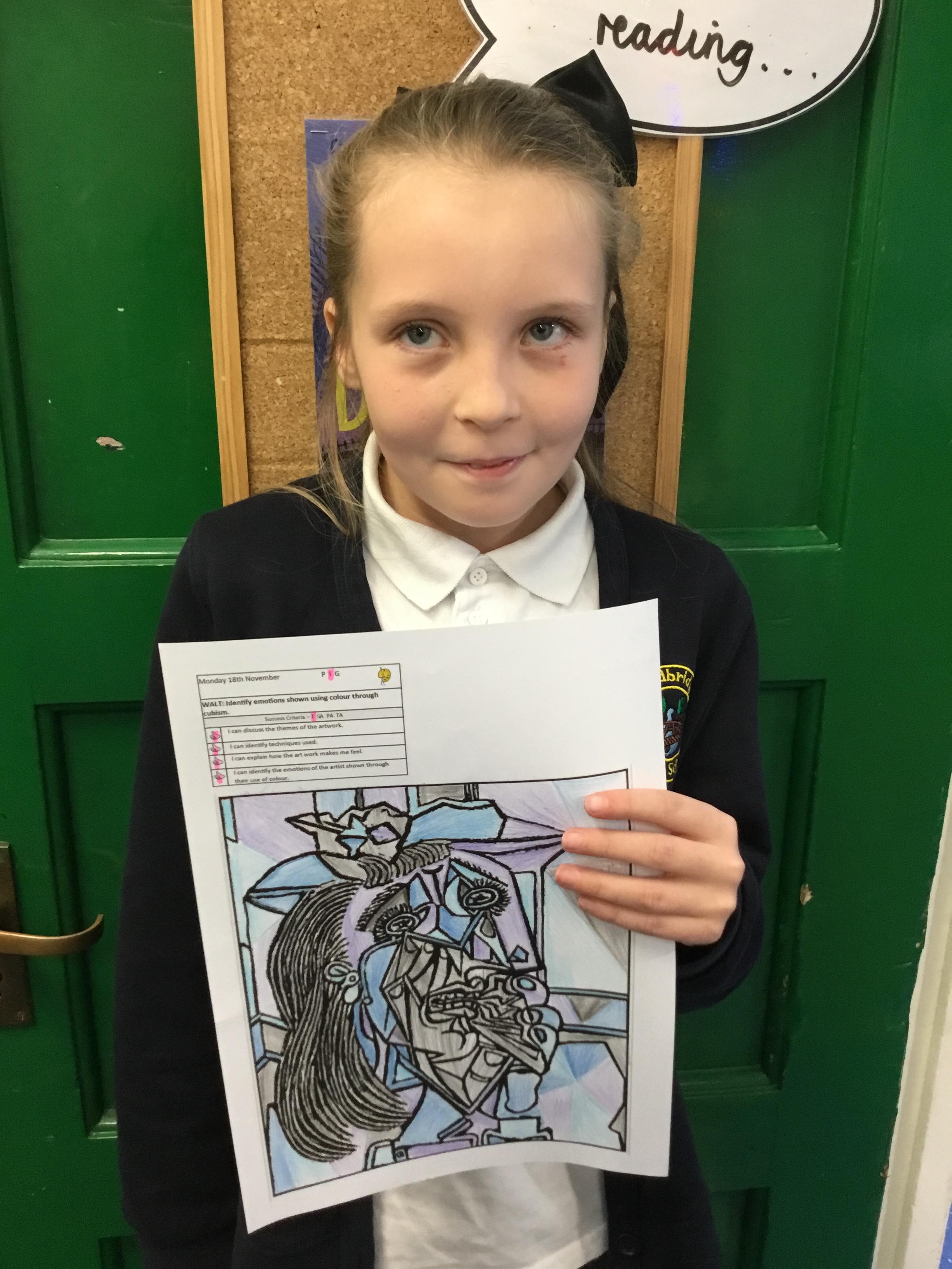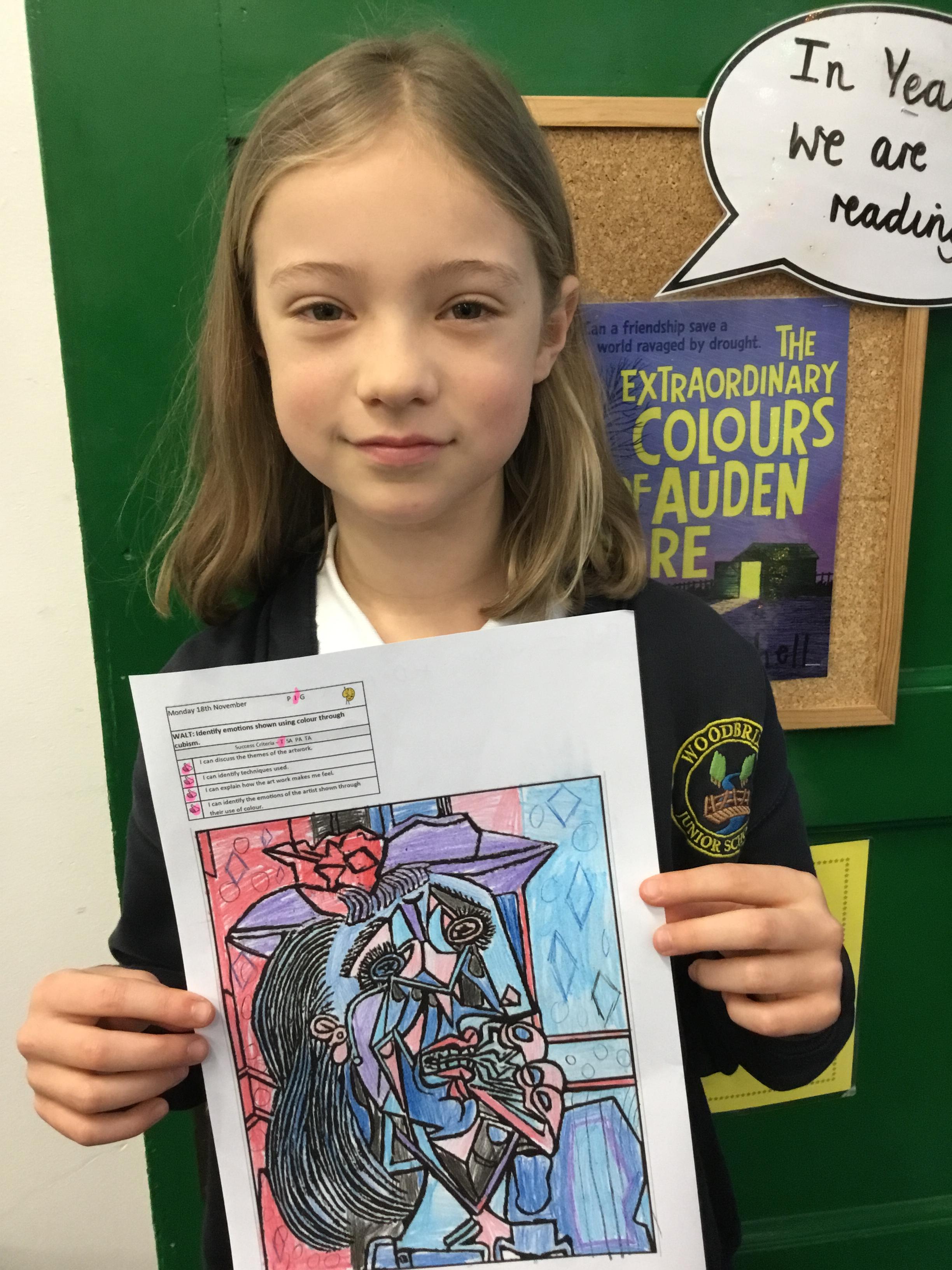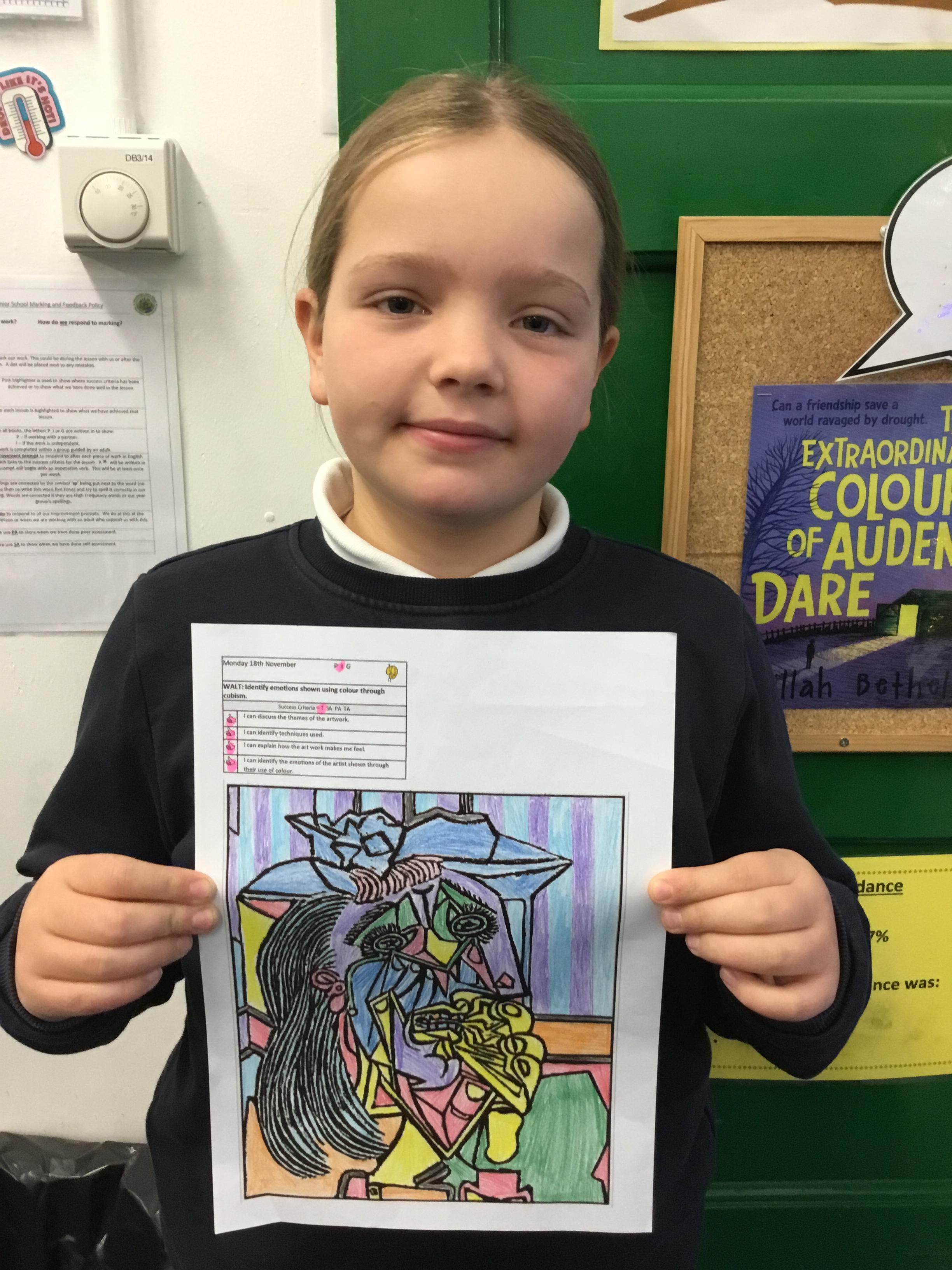 Wednesday 27th November - Art - We have been looking at how Picasso used colour to represent emotions. We tried out this skill on the 'Weeping Woman'. What emotions do you think our colours represent?