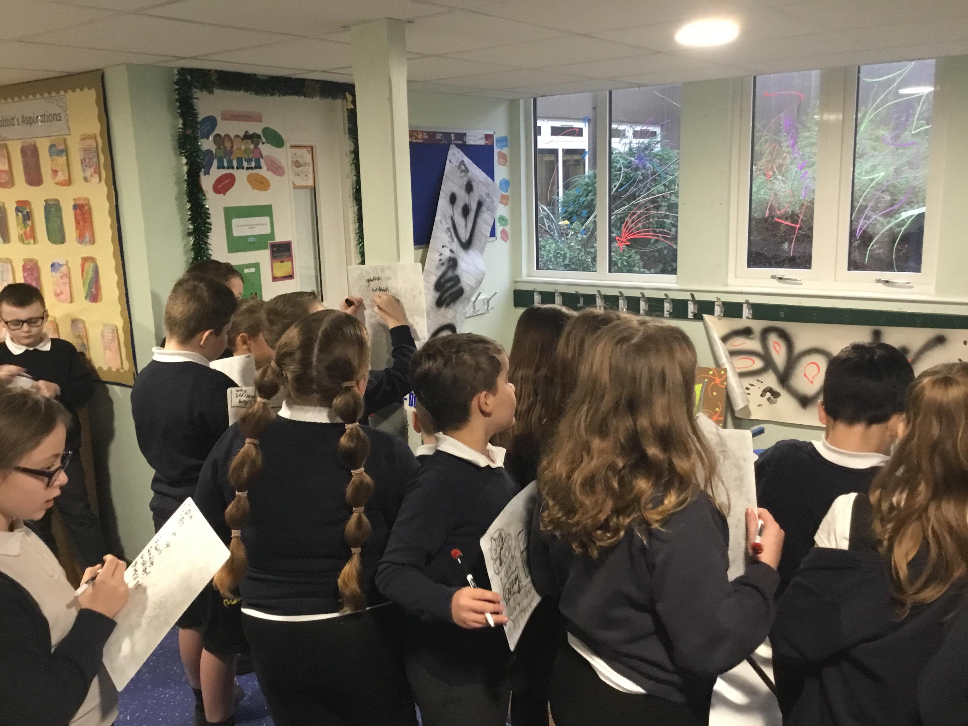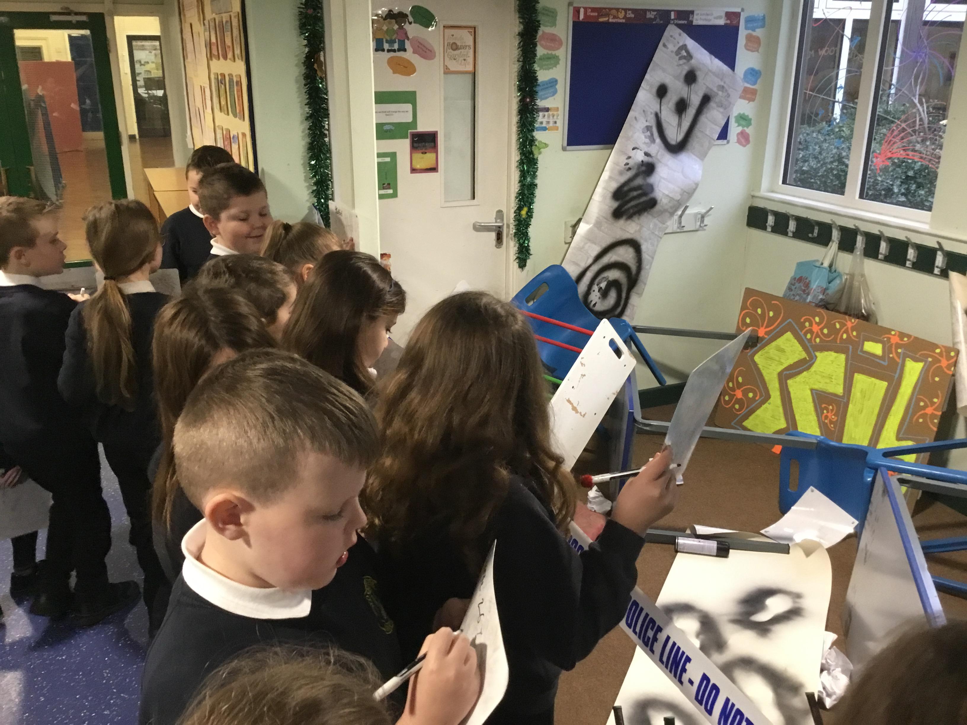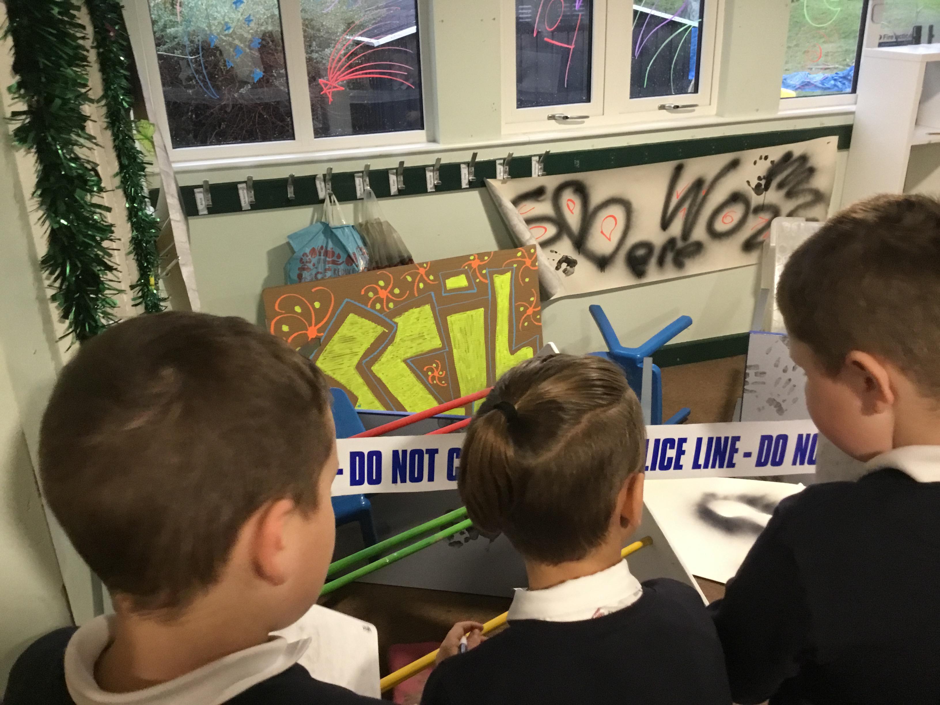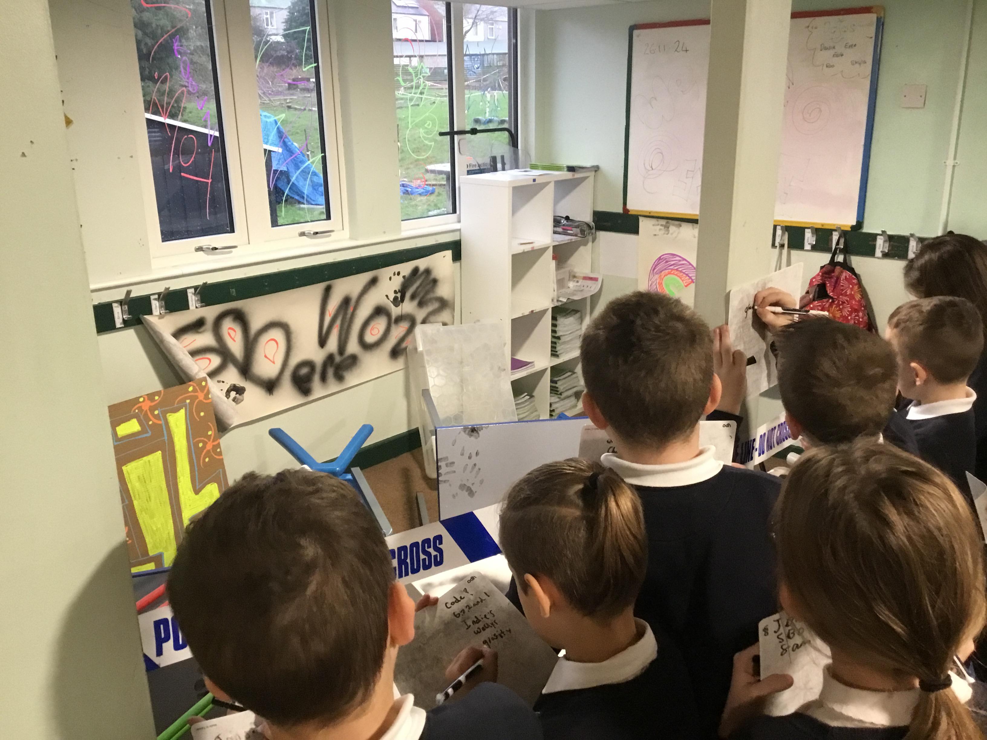 Year 4 journalists investigating a mysterious outbreak of Graffiti. Could it be Scribbleboy?