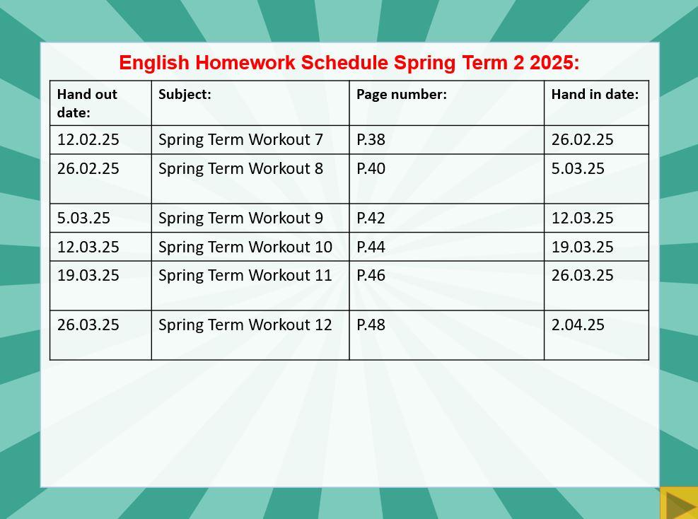 A Year 5 10 Minute Weekly Workout booklet based on Spelling and Vocabulary will be sent home. A page will be set each week and will be due in on the same day the following week. Homework will be due in on a Thursday. Please see the dates set below.
