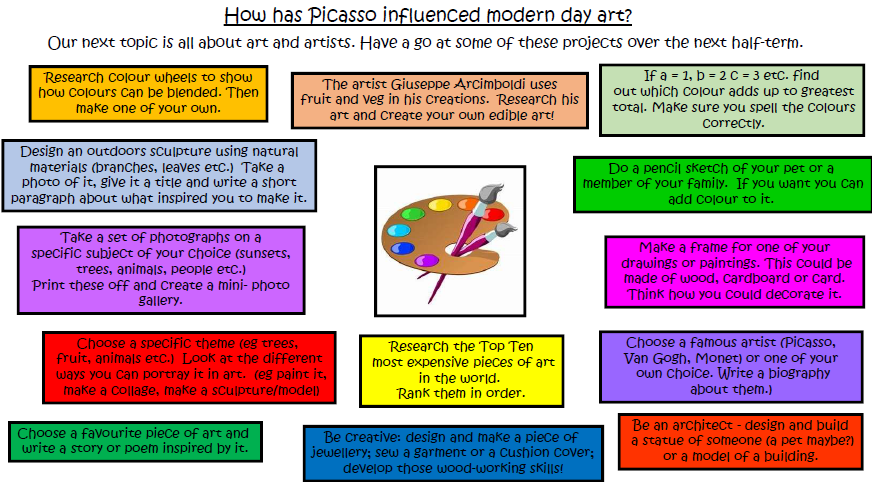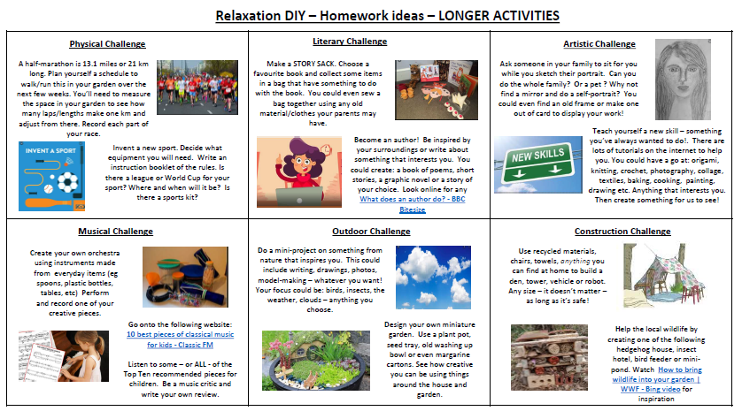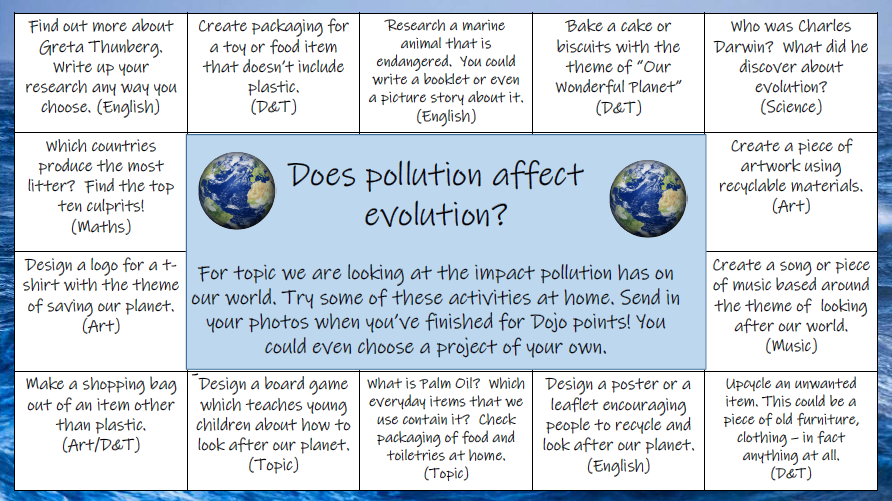 You will find a list of activities below to choose from. These can be completed during the term and brought into class to be shared and celebrated. Children will be rewarded Dojos for their efforts.