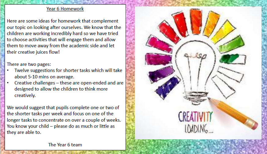 A Year 6, a homework booklet based on Spelling and Vocabulary will be sent home. A page will be set each Wednesday (look at the list below which is also stuck at the front of the book) to be completed by the following Wednesday.