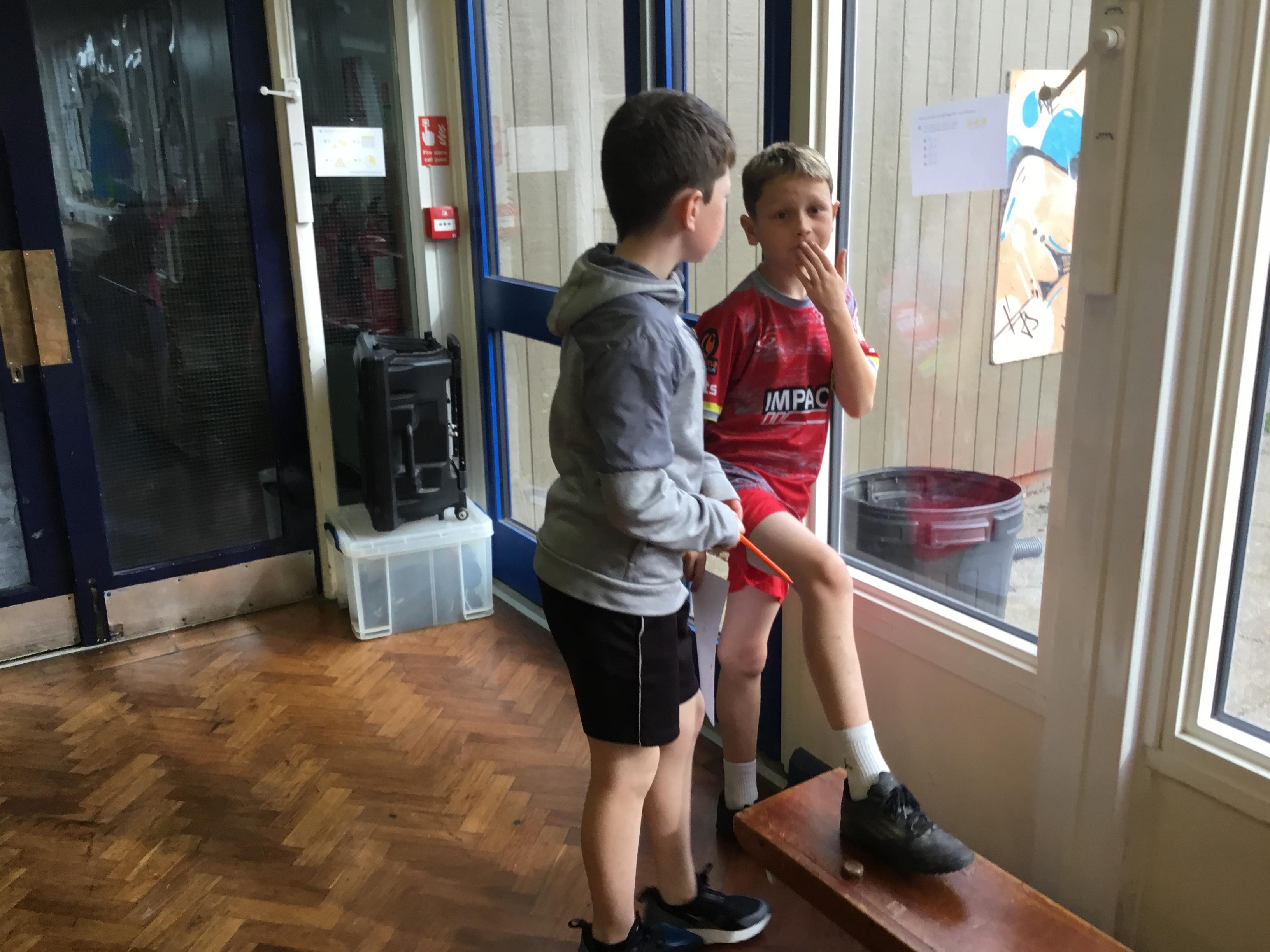 Year 6 - Here we are running around the hall solving Maths problems on Red Nose Day.