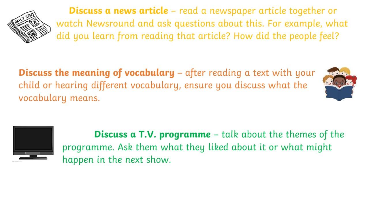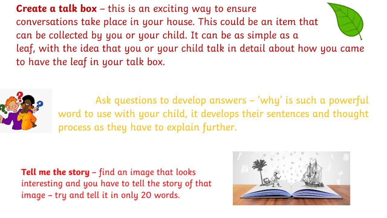 • Having regular conversations with your child in your home language is also very valuable in terms of developing your child’s oracy skills so please do not worry if your first language is not English.