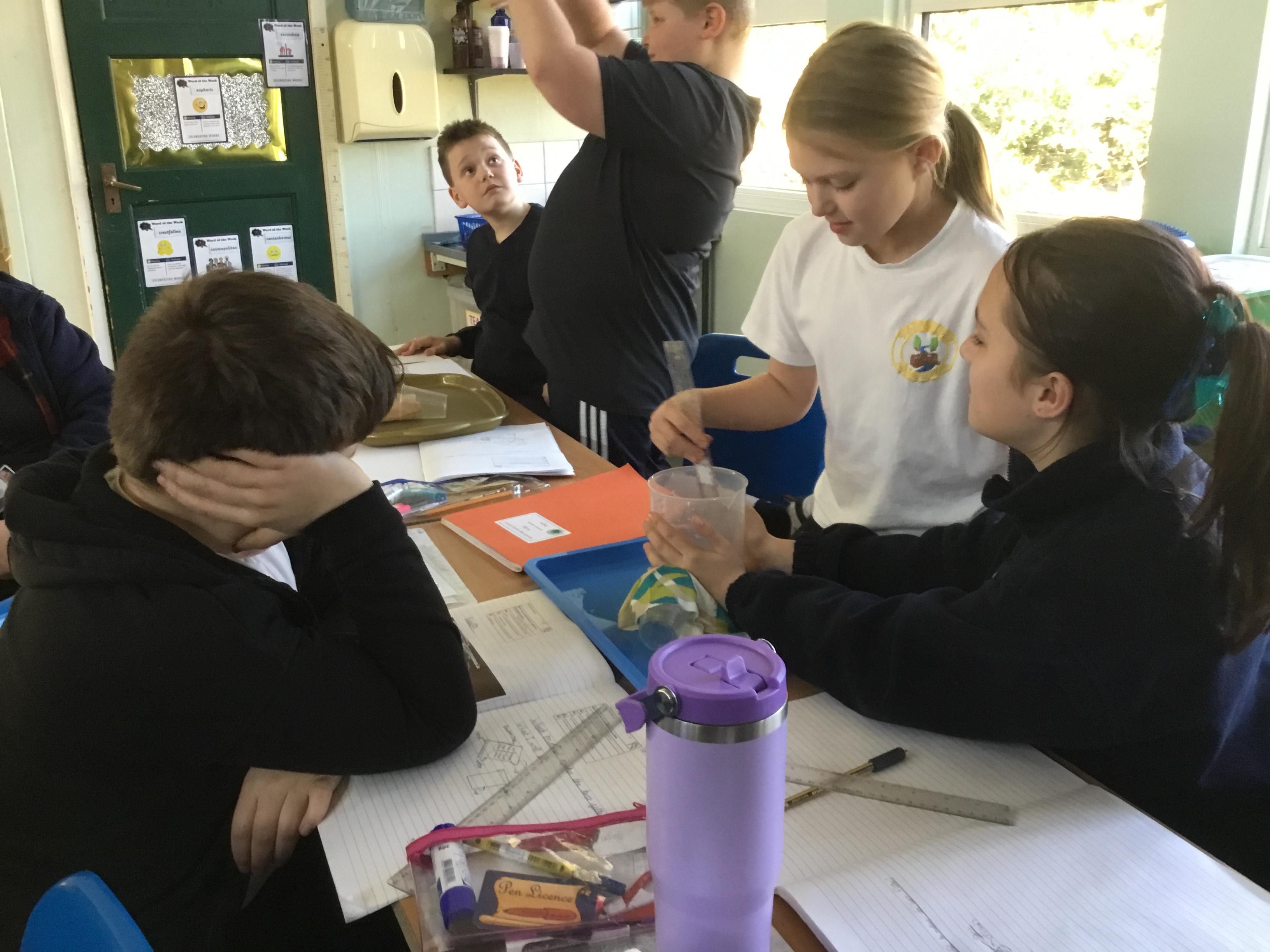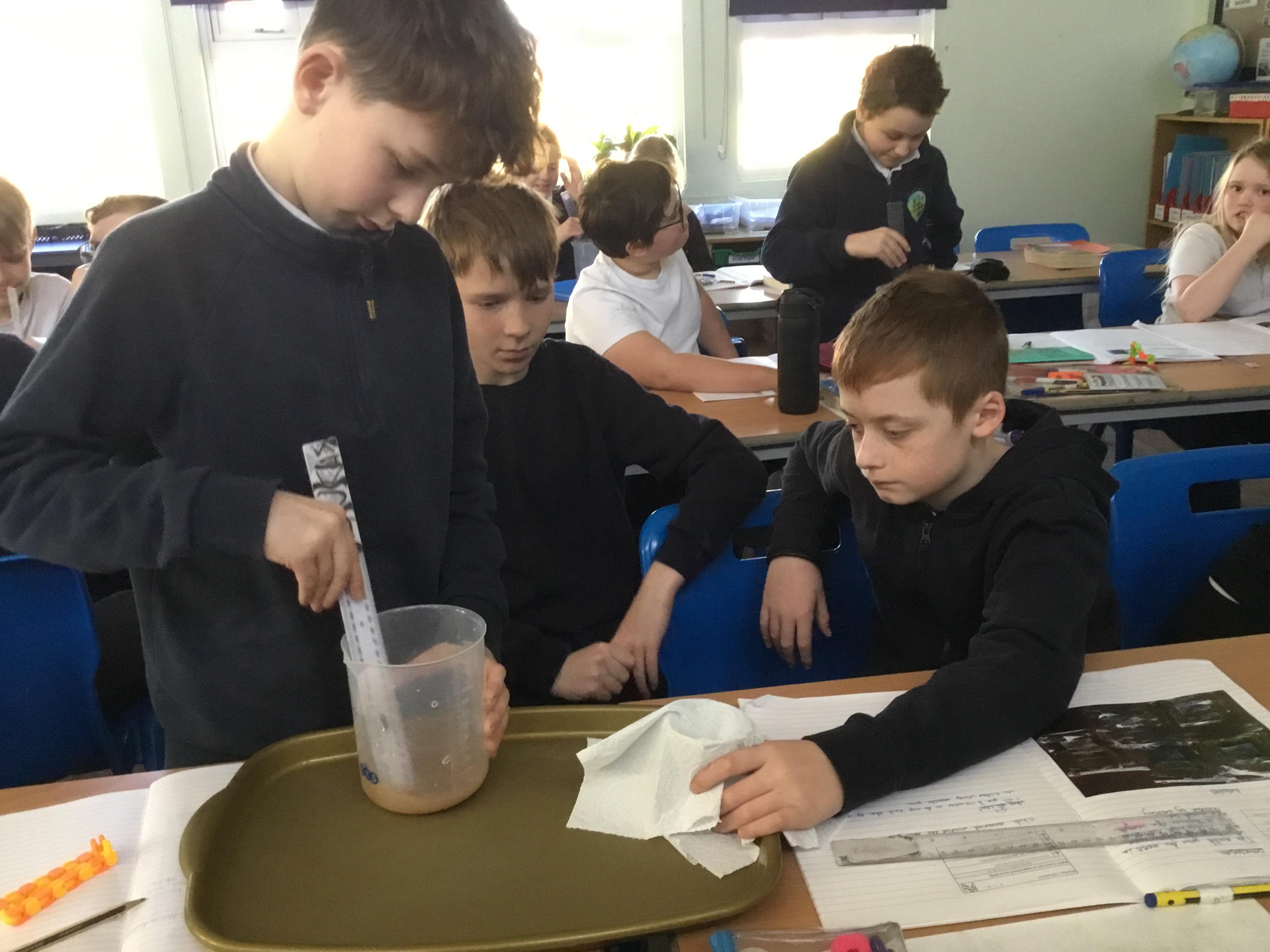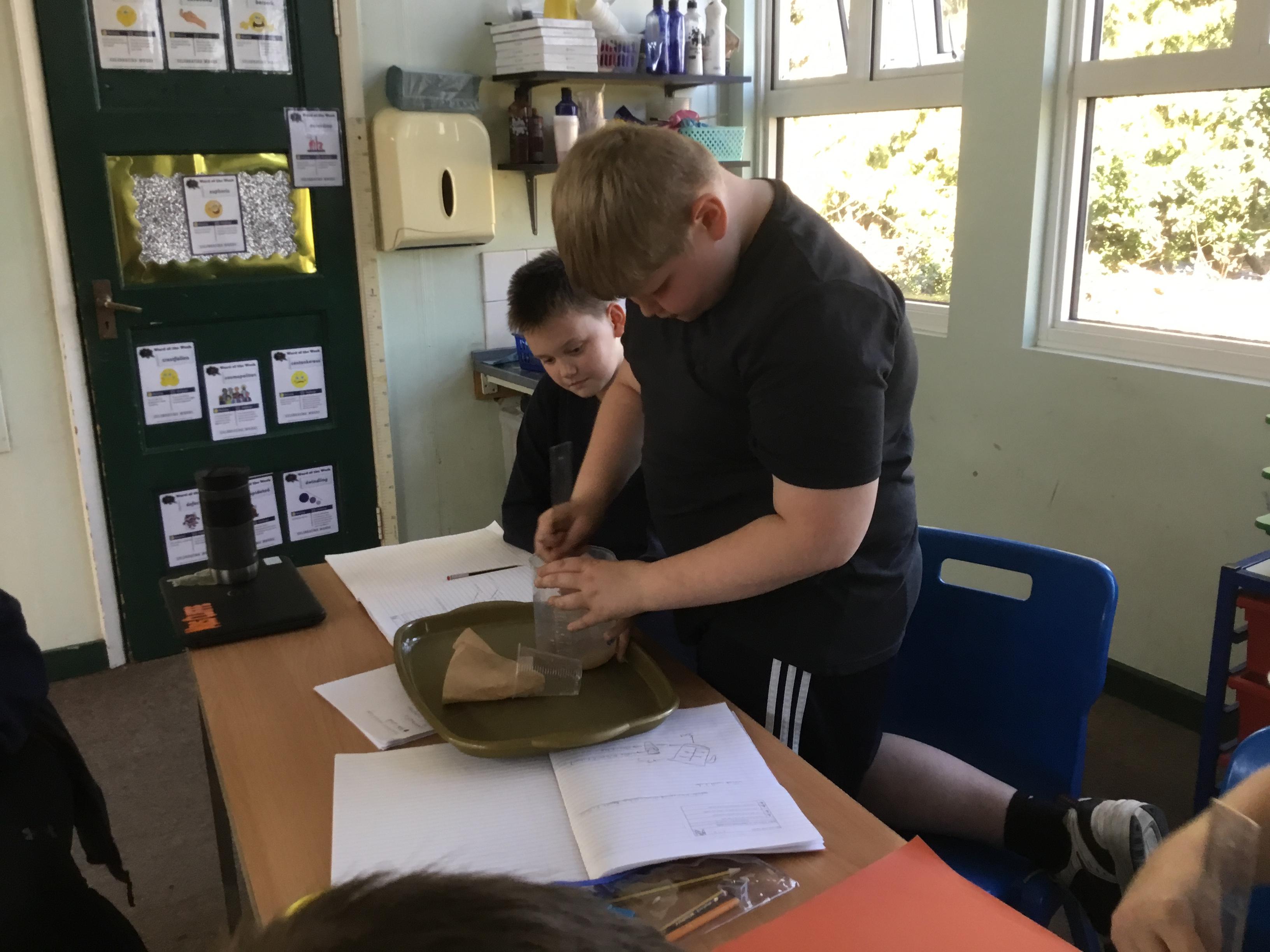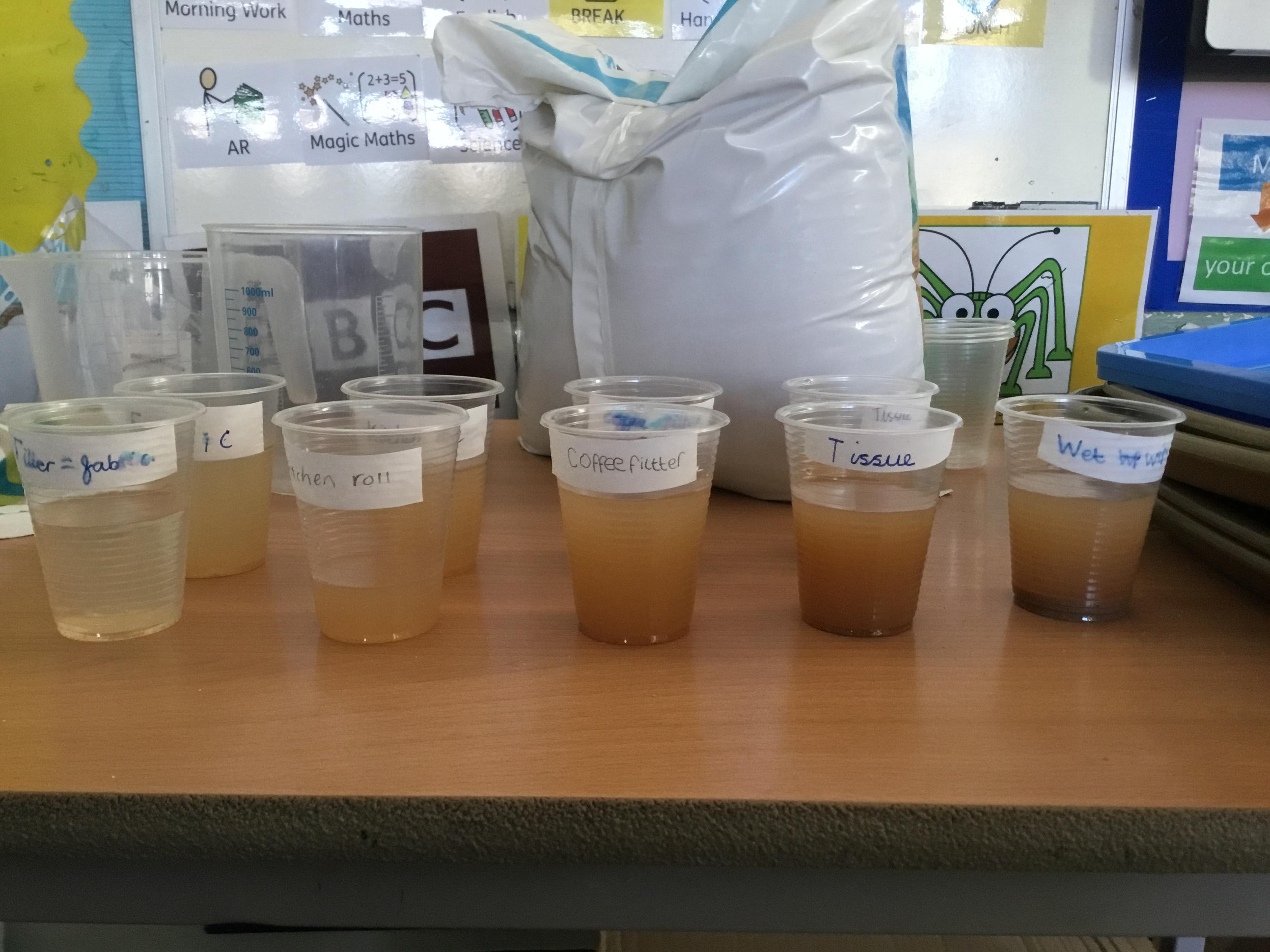 Tuesday 18th March - Enjoying a filtering experiment, finding out which material would be the best to filter micro- plastics in the oceans.