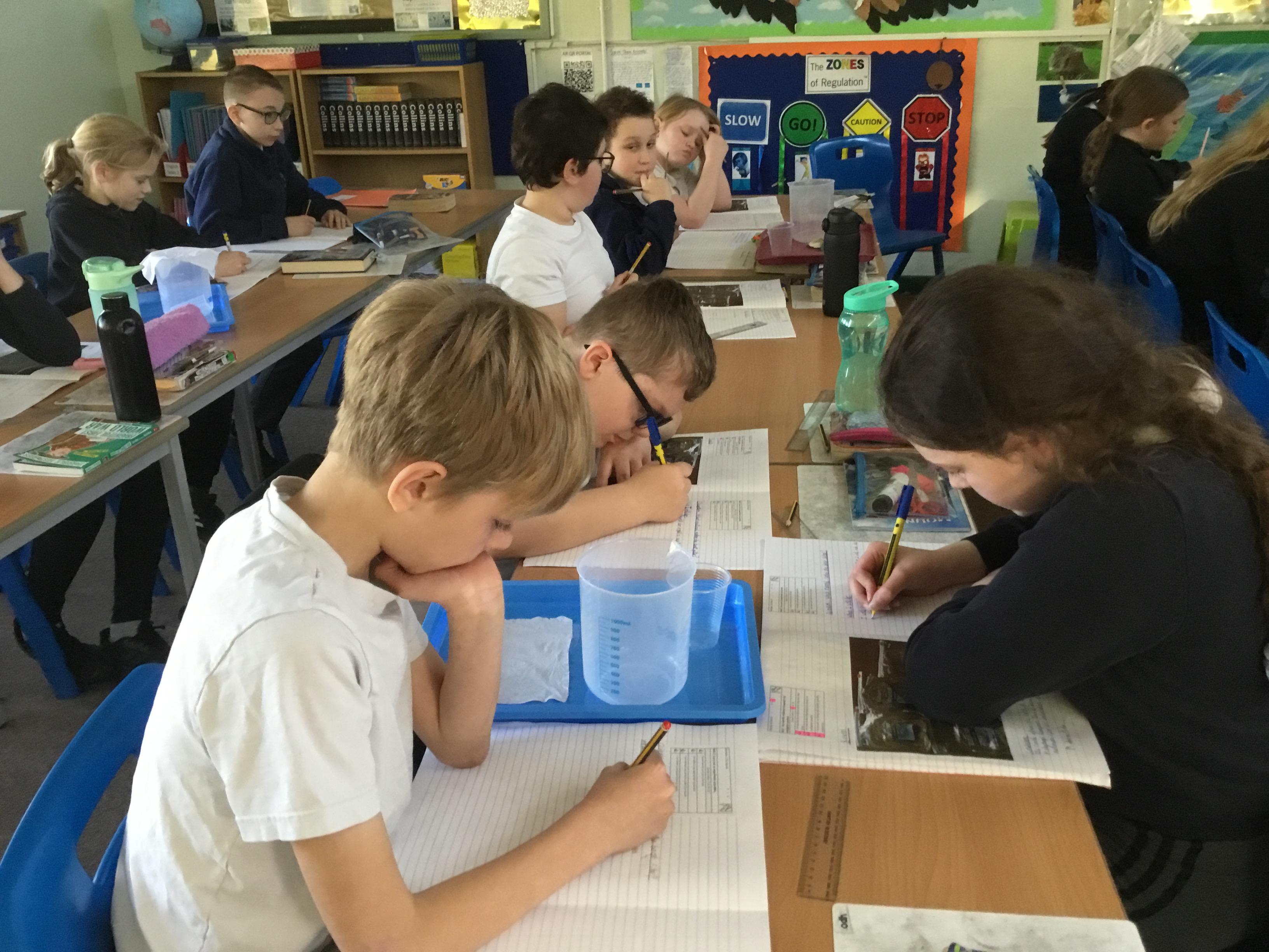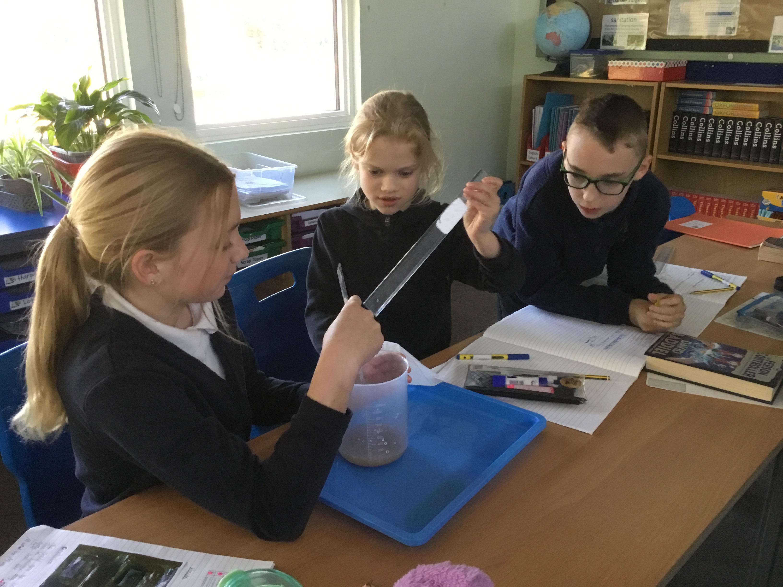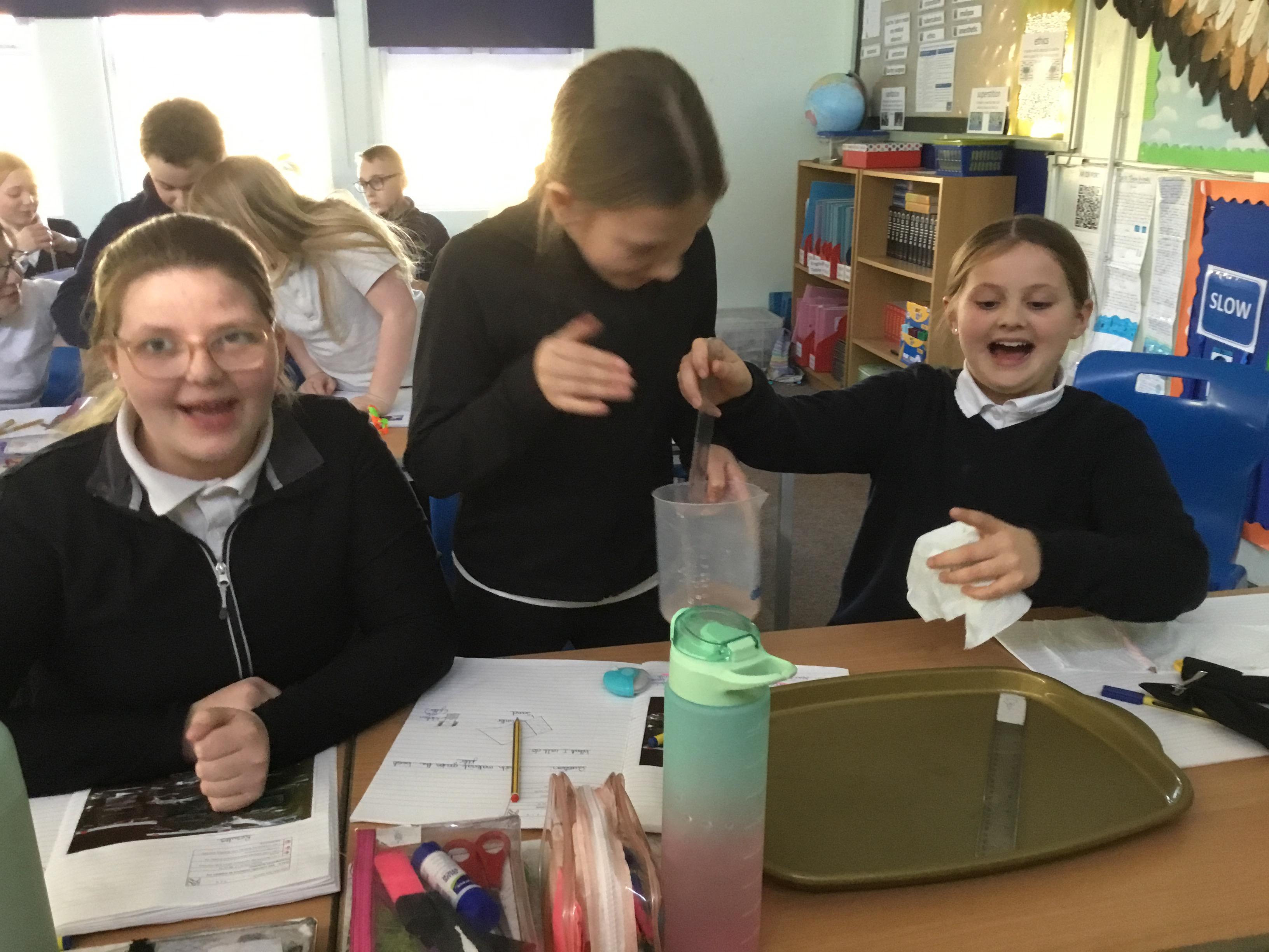 Tuesday 18th March - Enjoying a filtering experiment, finding out which material would be the best to filter micro- plastics in the oceans.