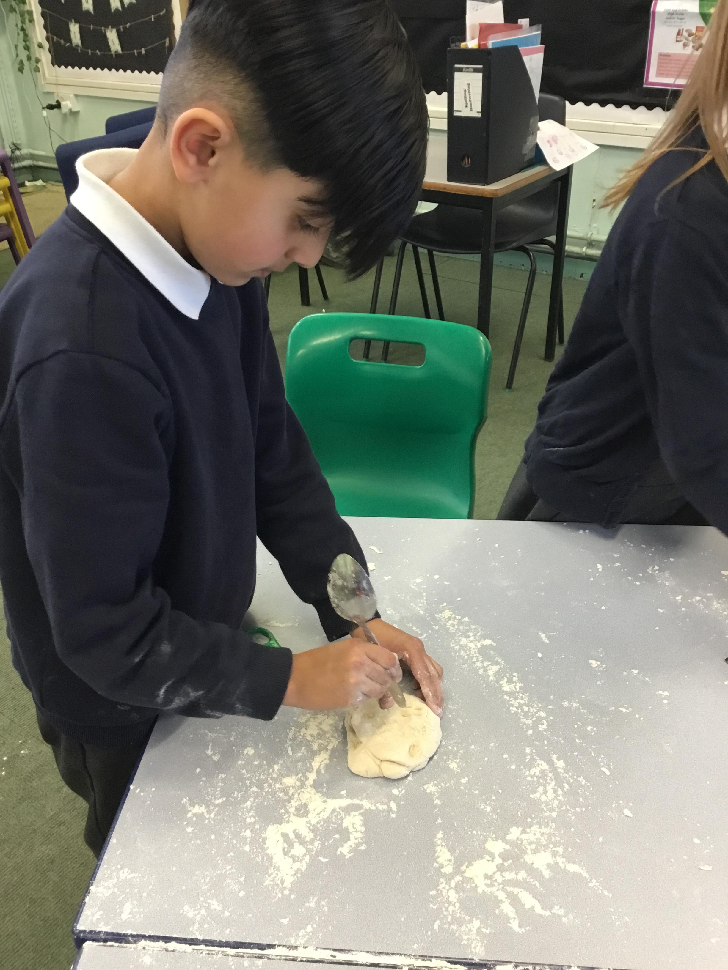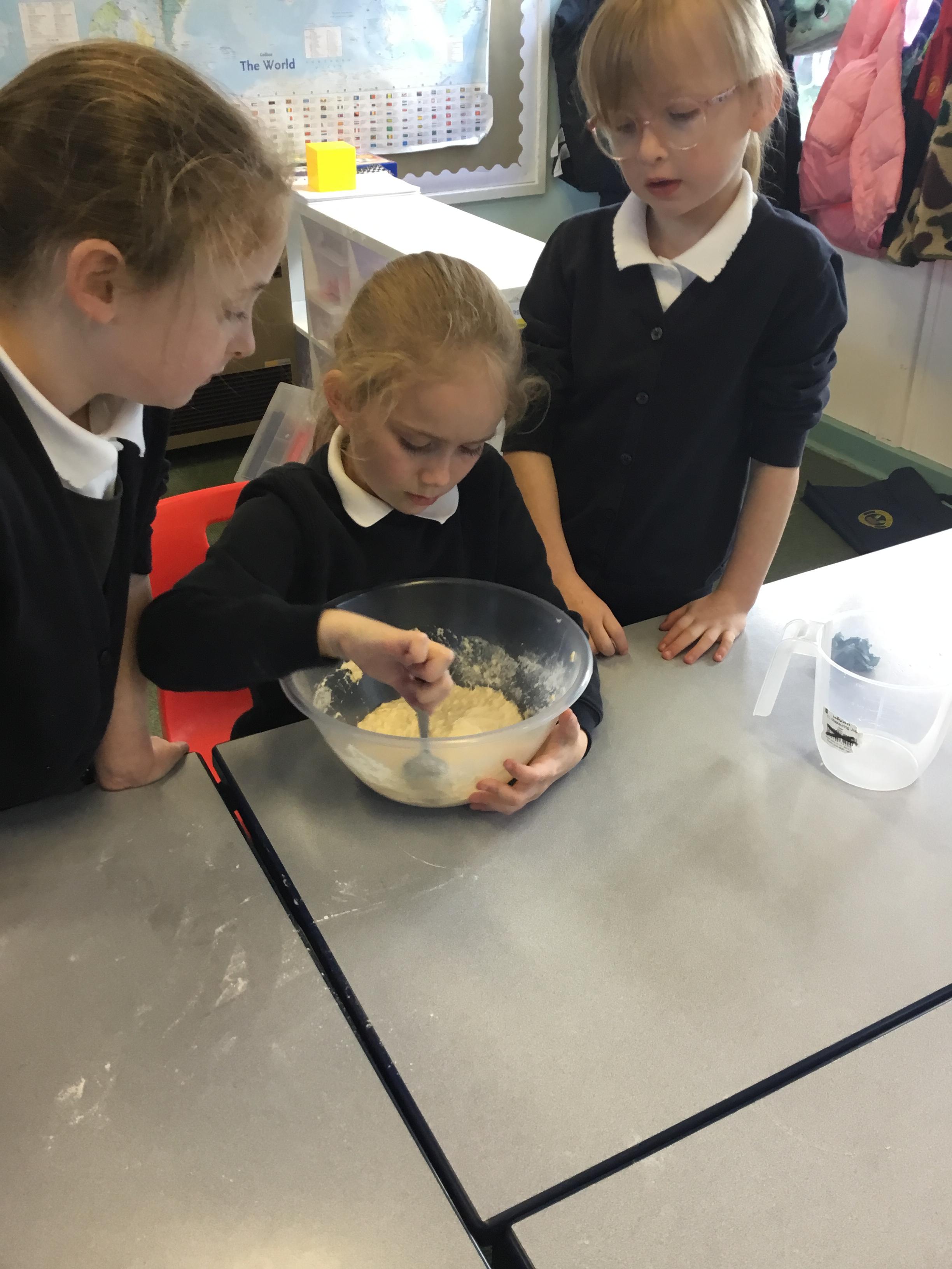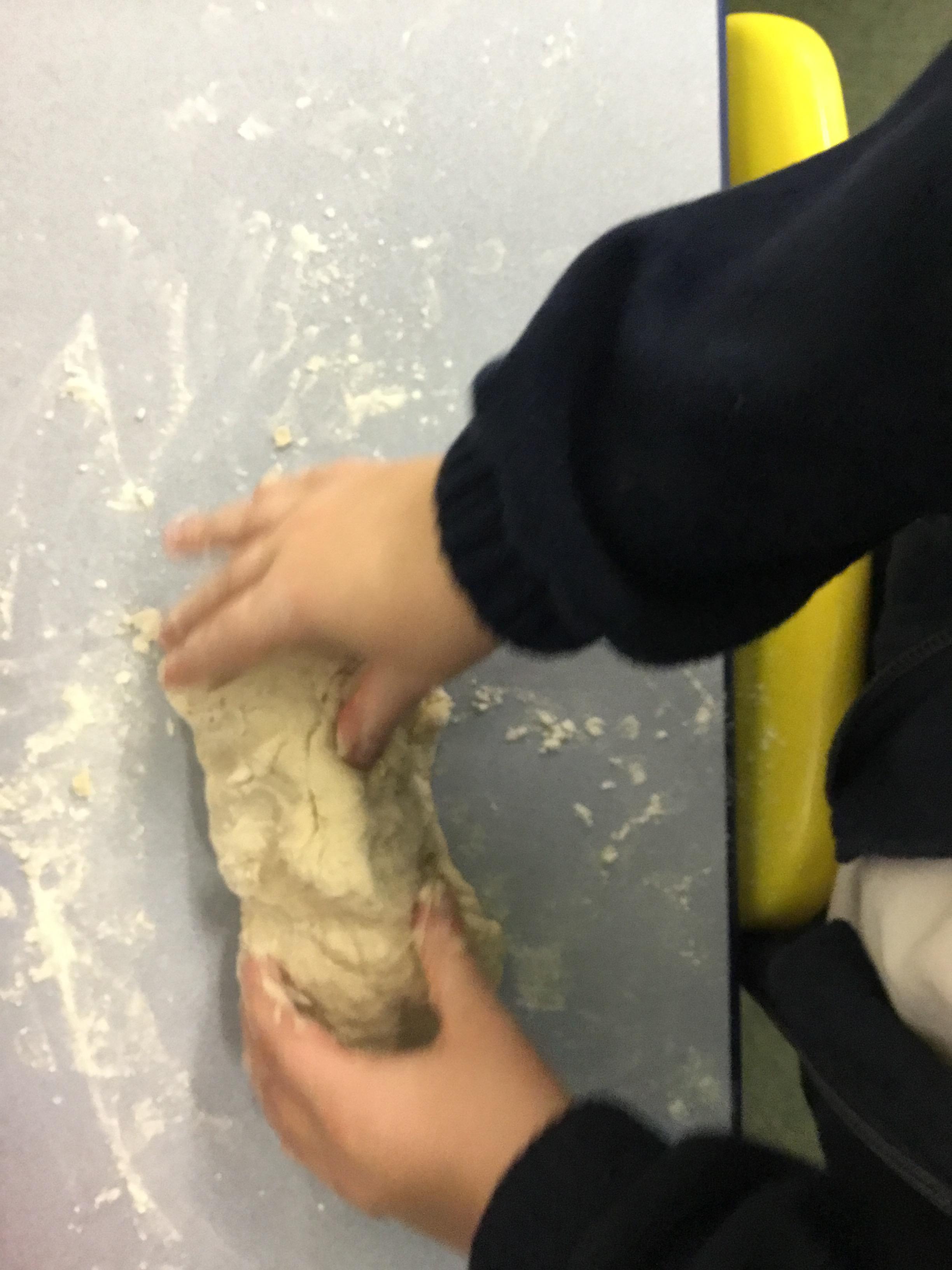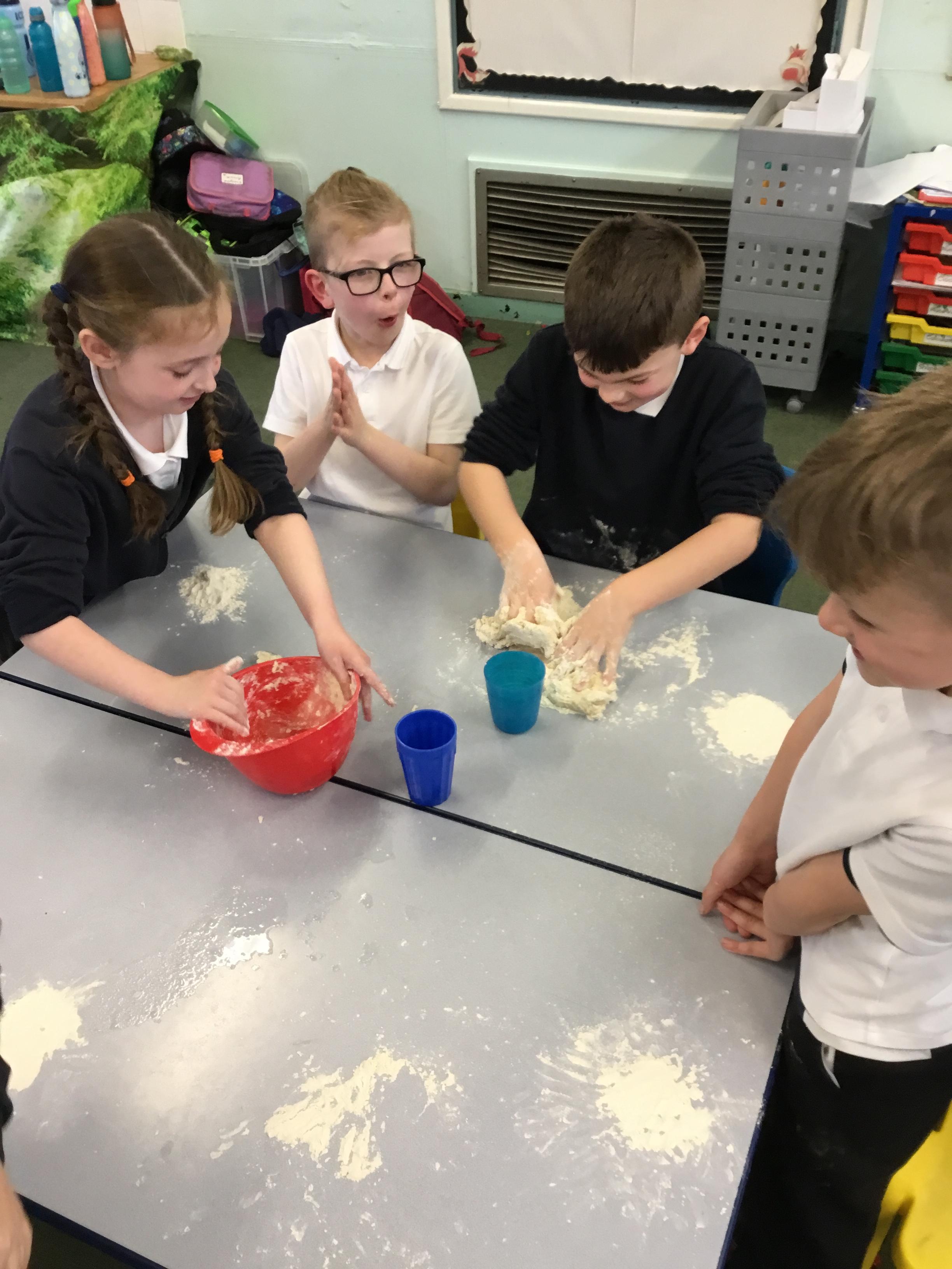 Spring 2, Week 3. The class made play-dough to practise the skills and techniques needed for making bread dough.