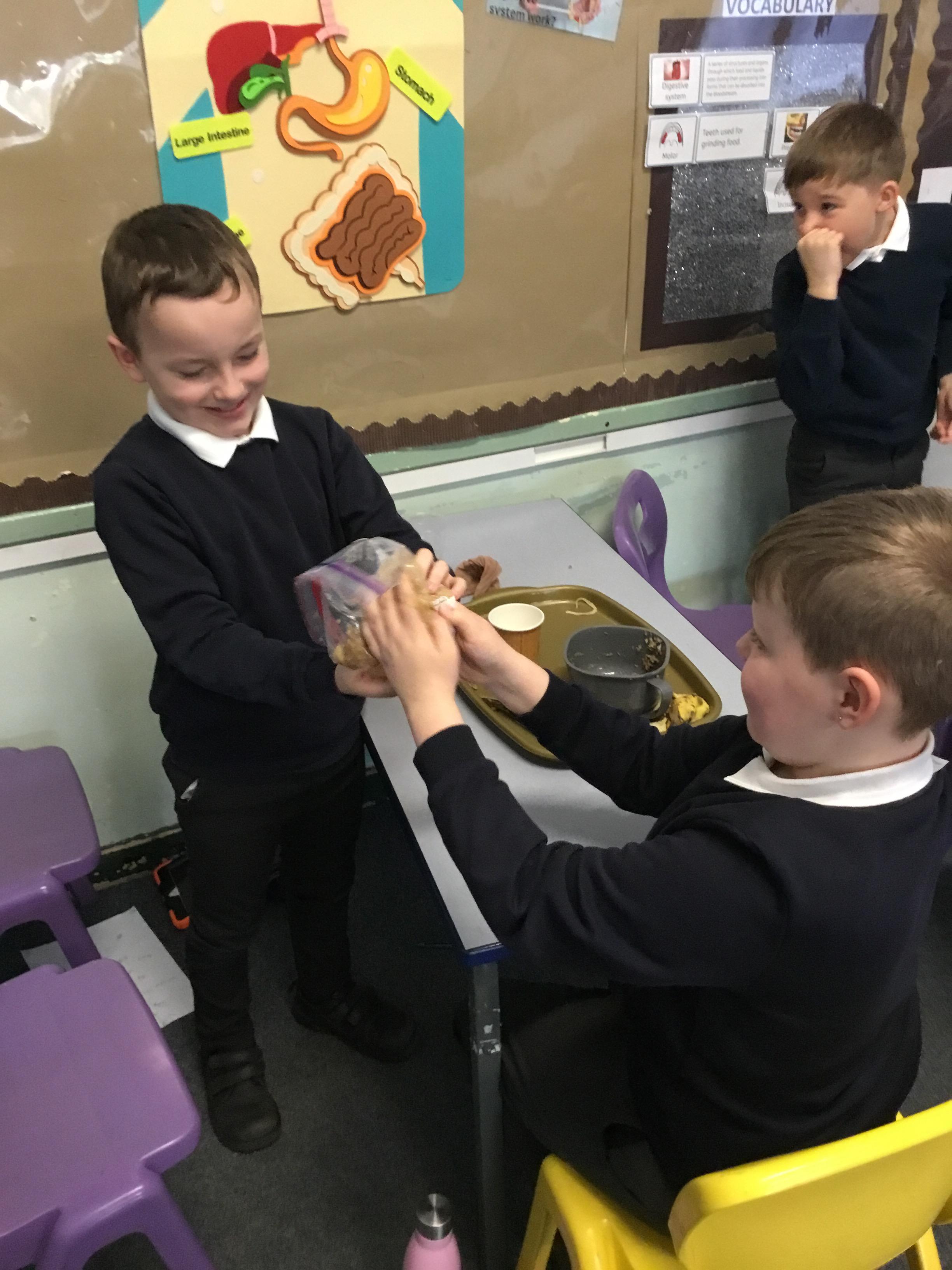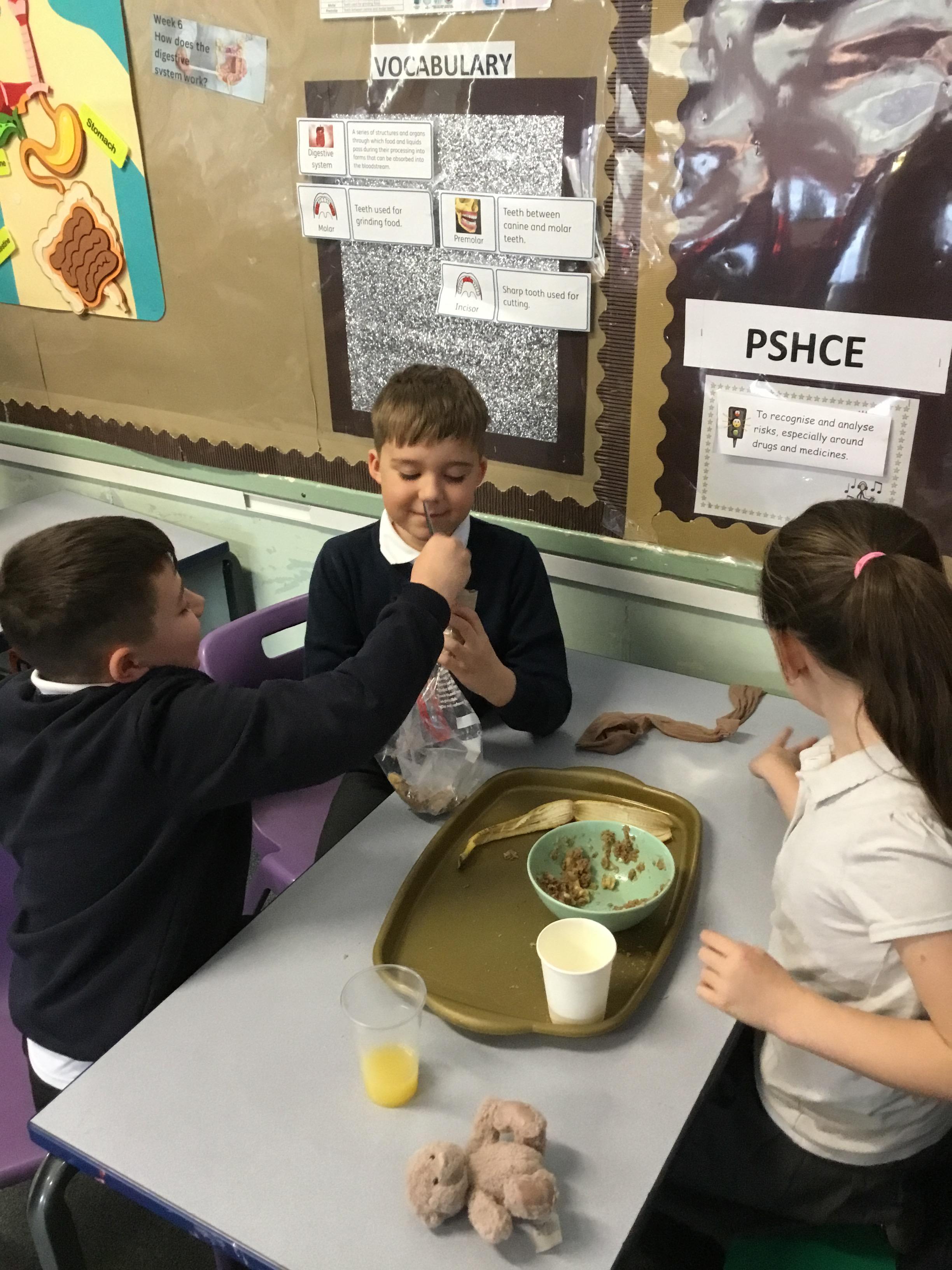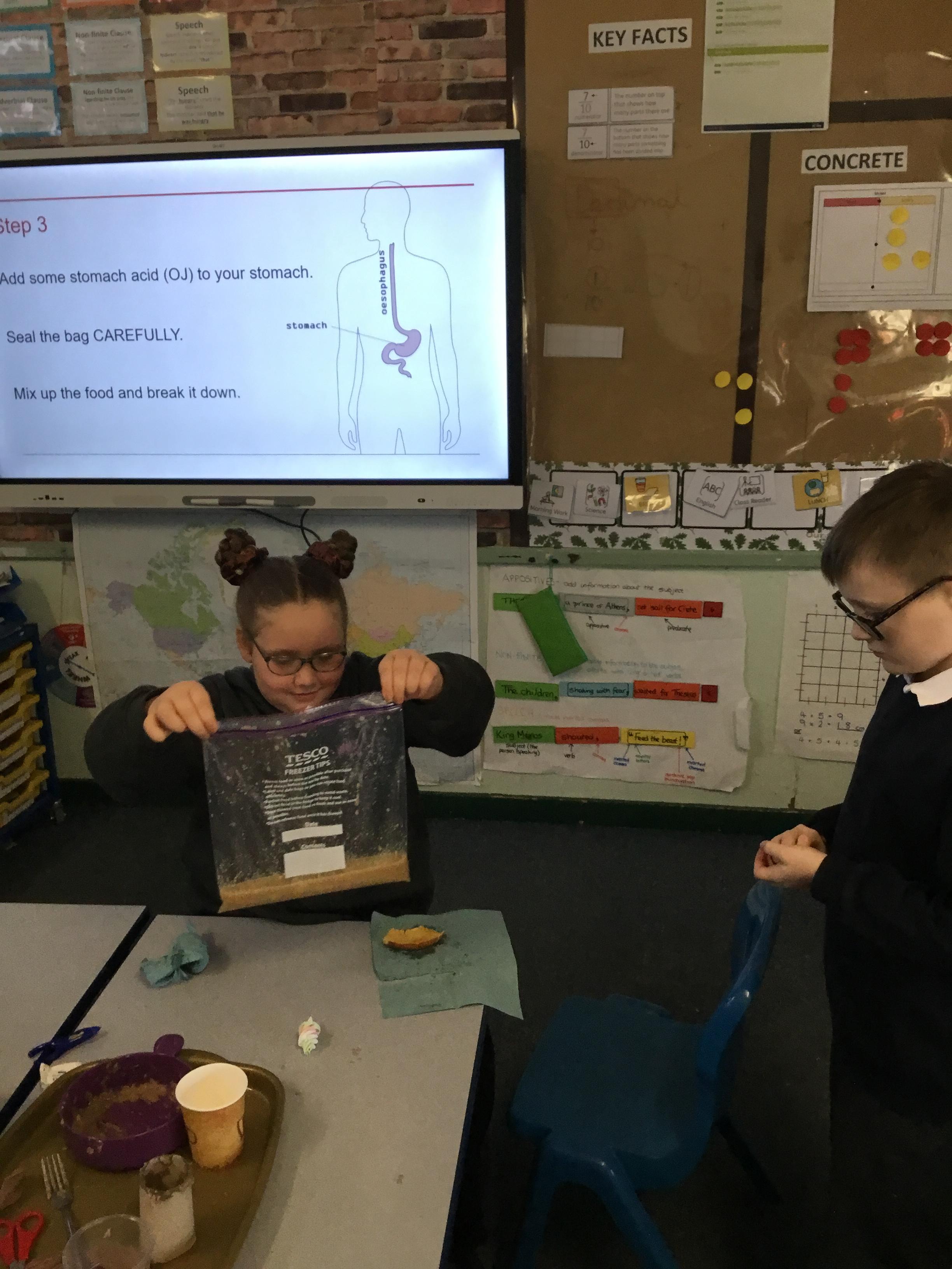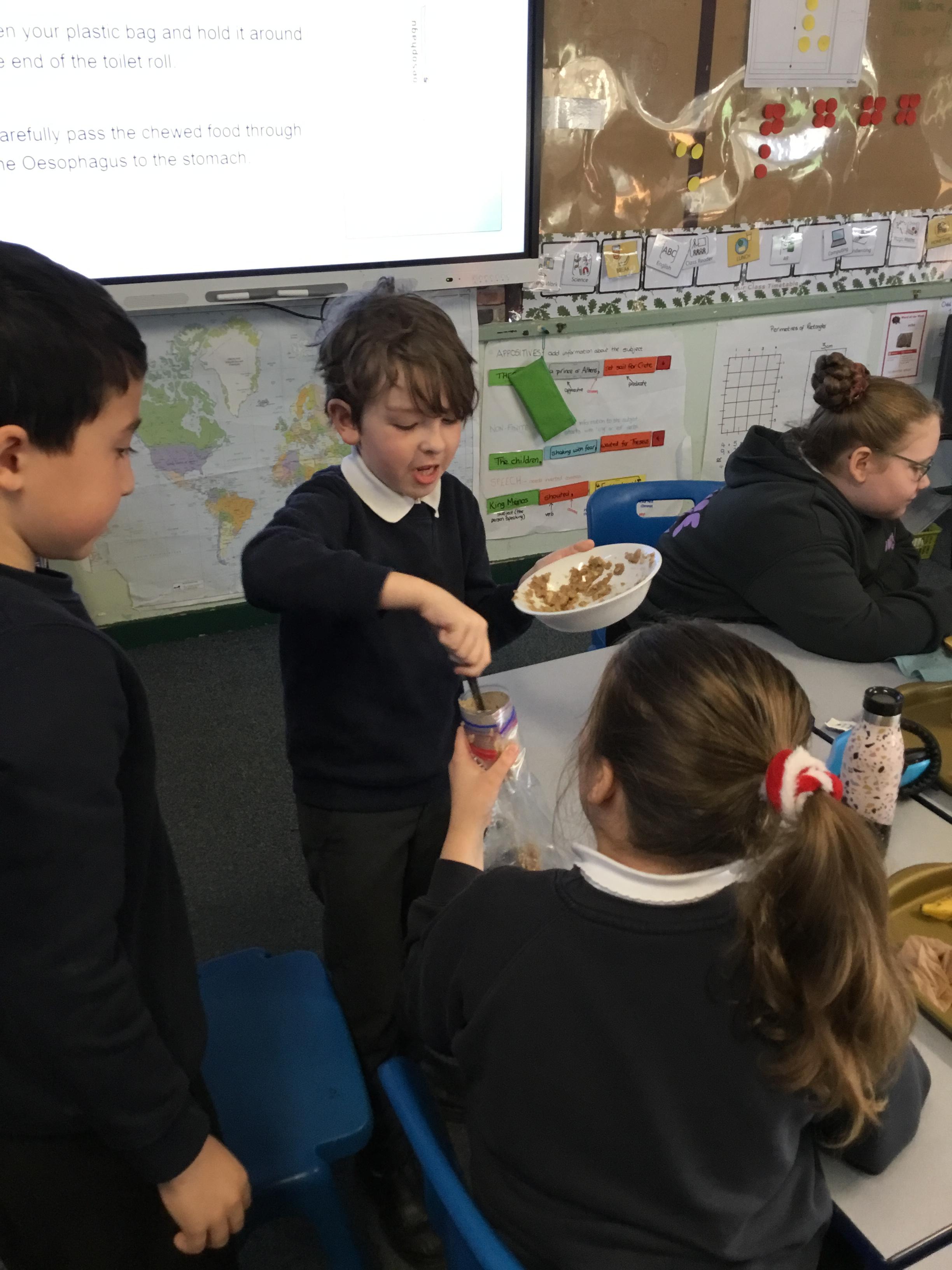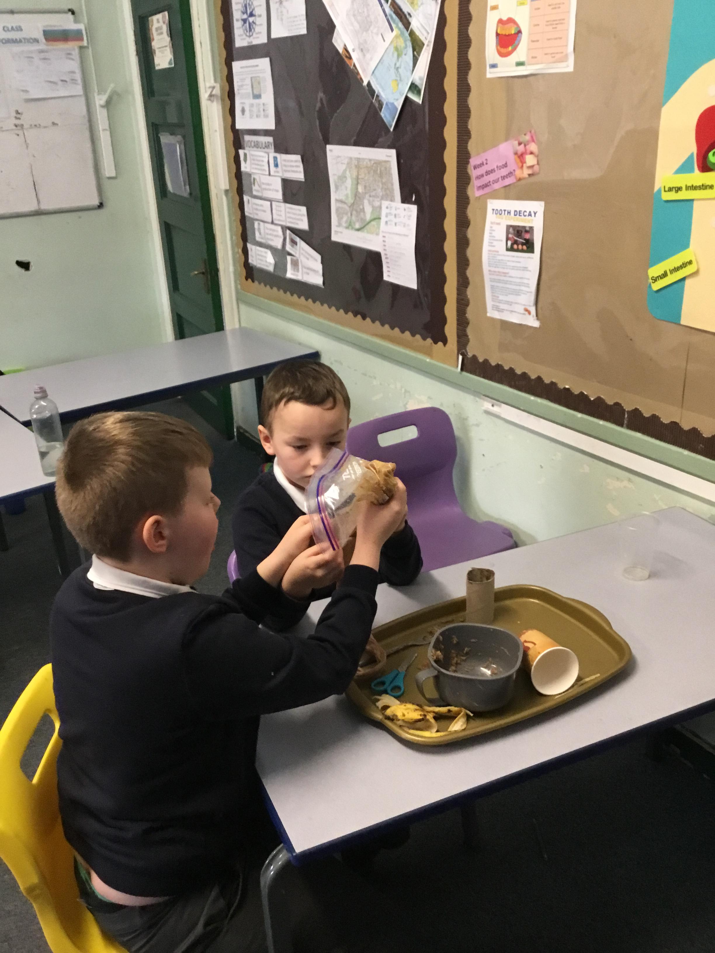 In Science, we have been learning all about the amazing digestive system. We have found out what happens to our food from the moment we eat it to the moment it exits our body at the the end of the process. Today we got practical and made our own version of the digestive system using bananas and wheatabix, with a little help from tights, tubes, bags and orange juice!