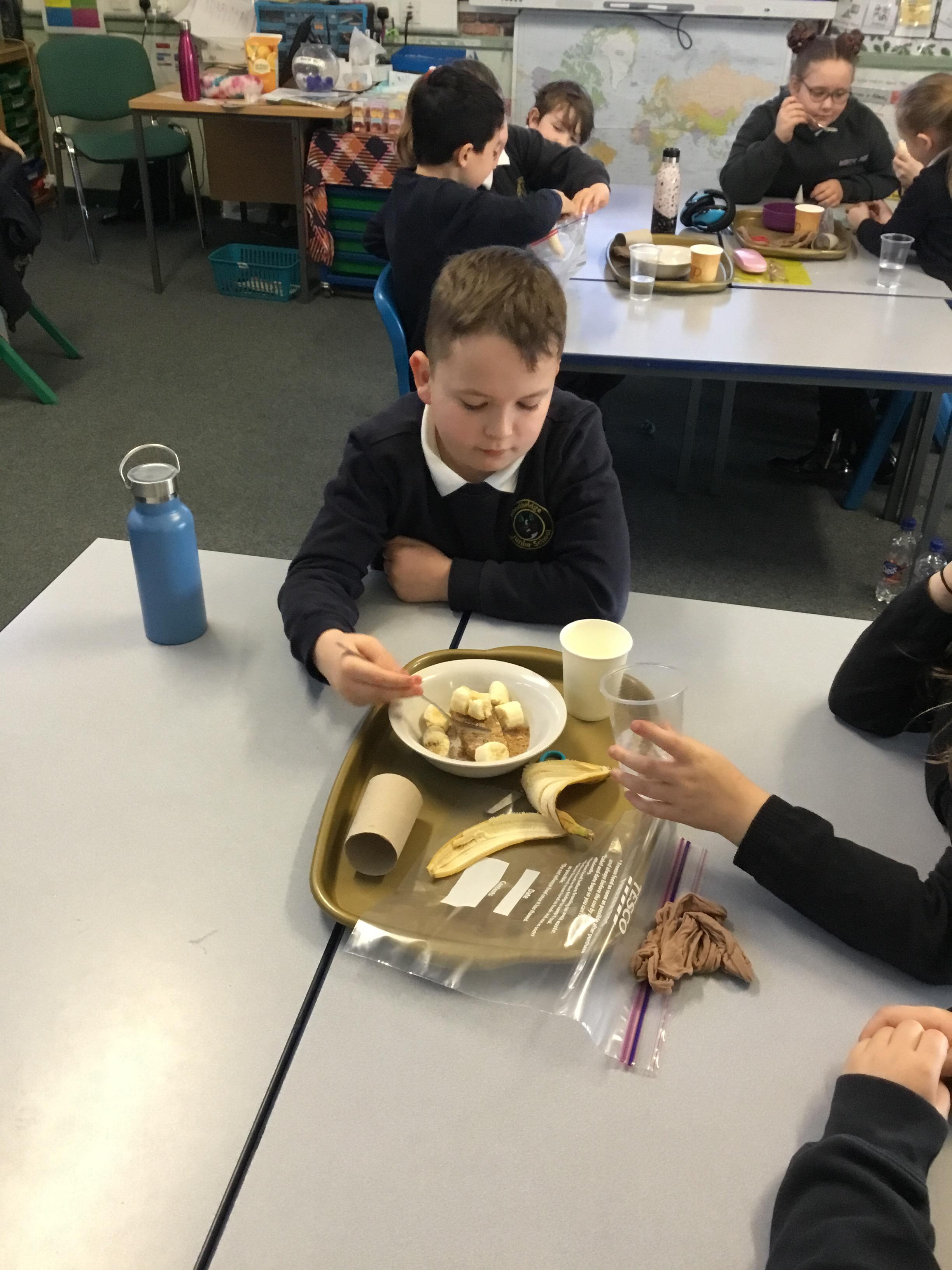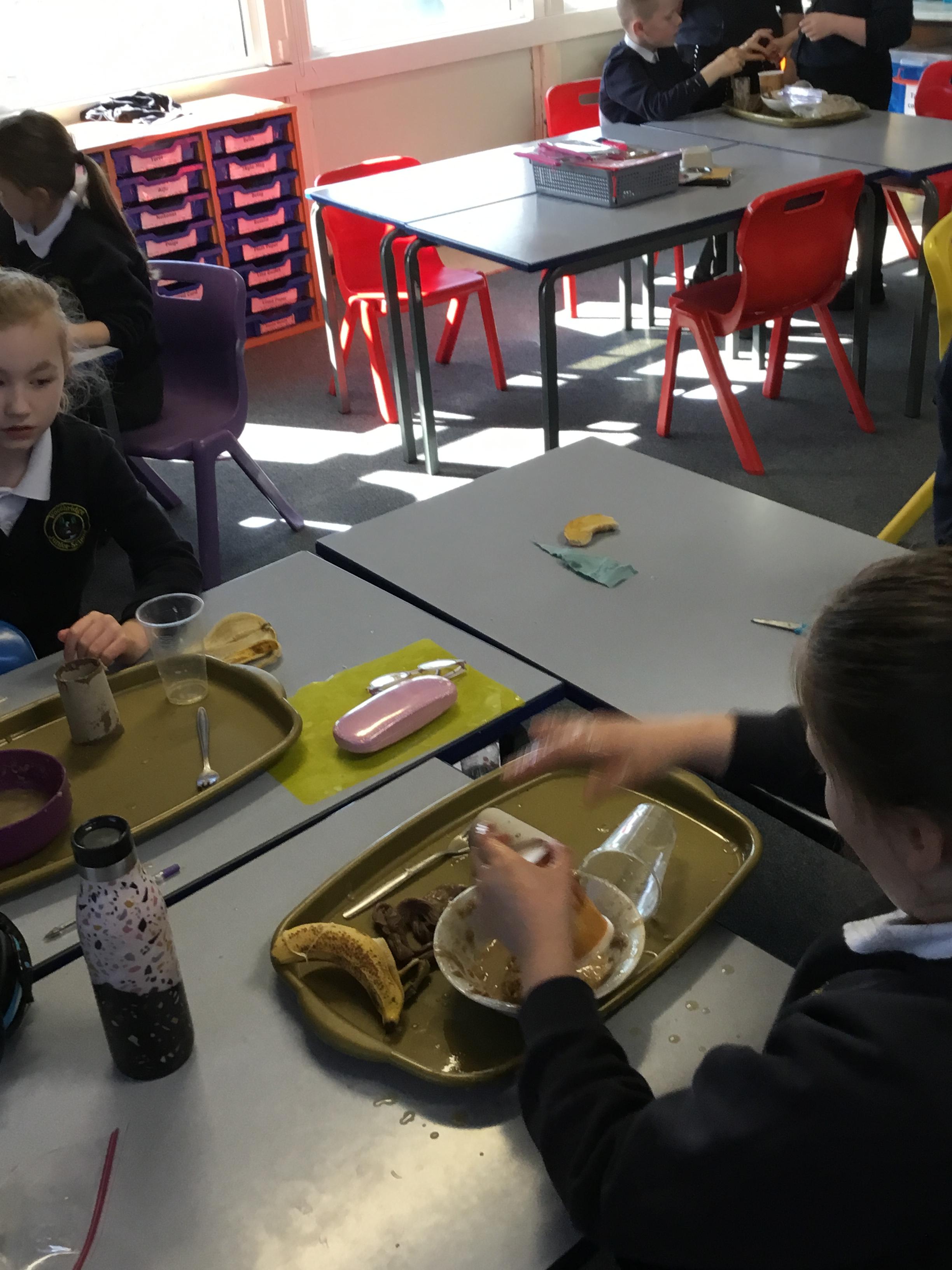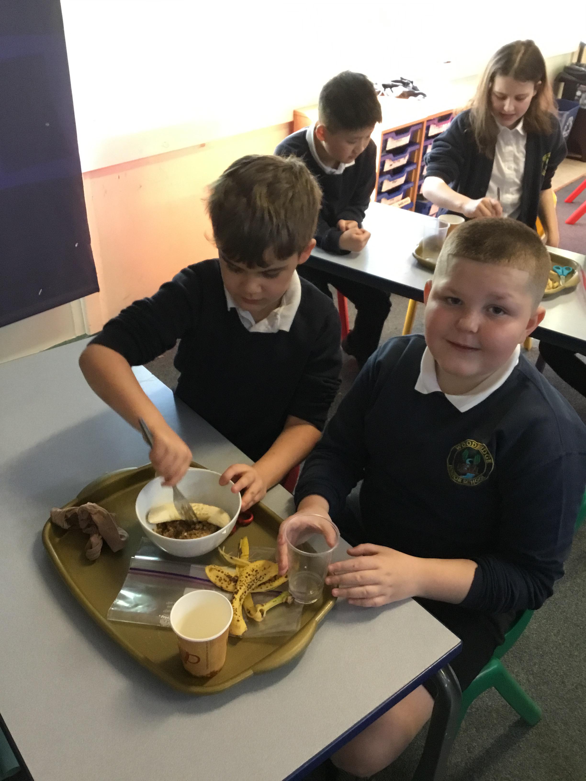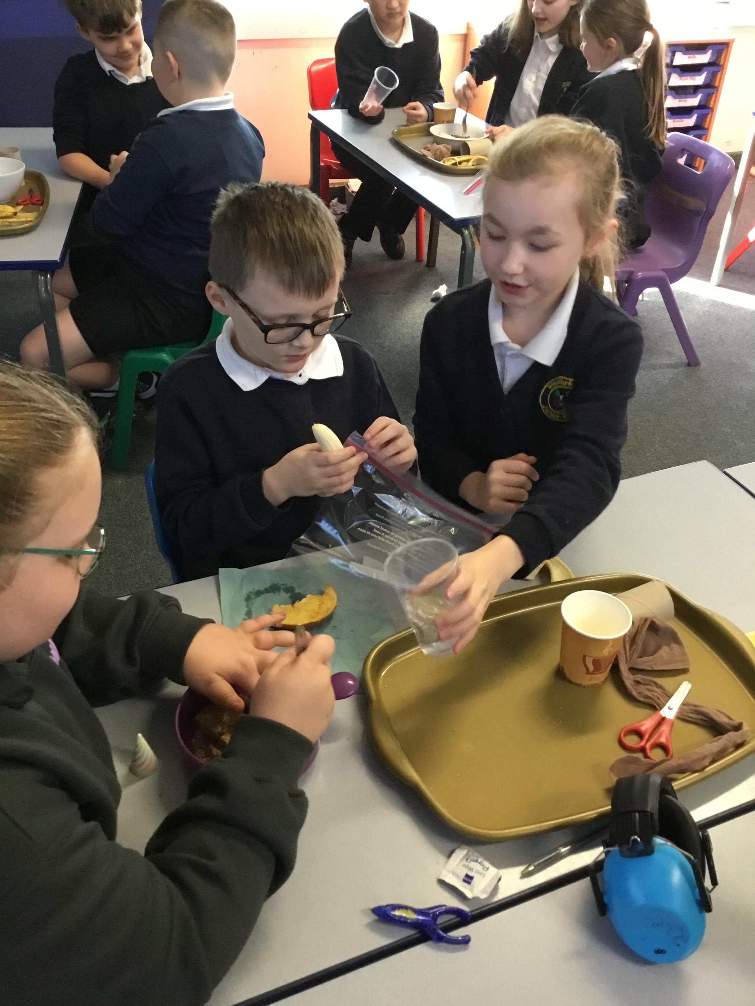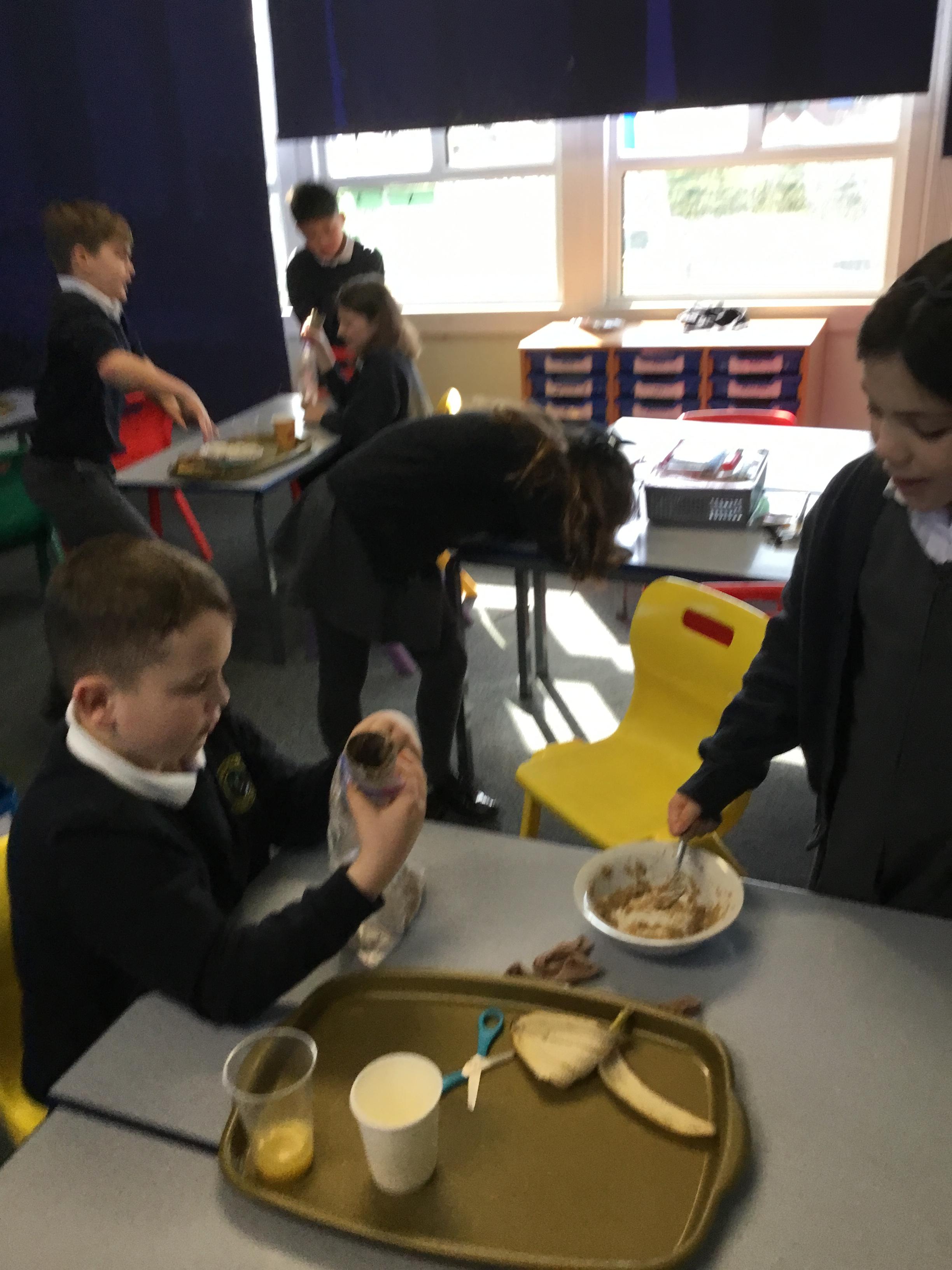 In Science, we have been learning all about the amazing digestive system. We have found out what happens to our food from the moment we eat it to the moment it exits our body at the the end of the process. Today we got practical and made our own version of the digestive system using bananas and wheatabix, with a little help from tights, tubes, bags and orange juice!