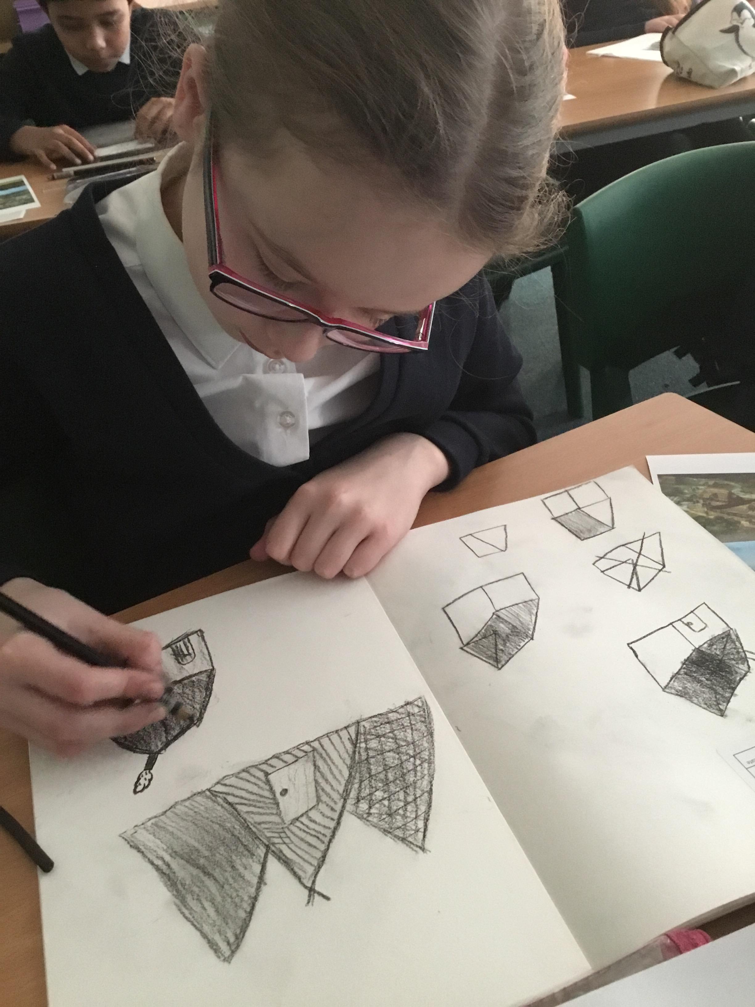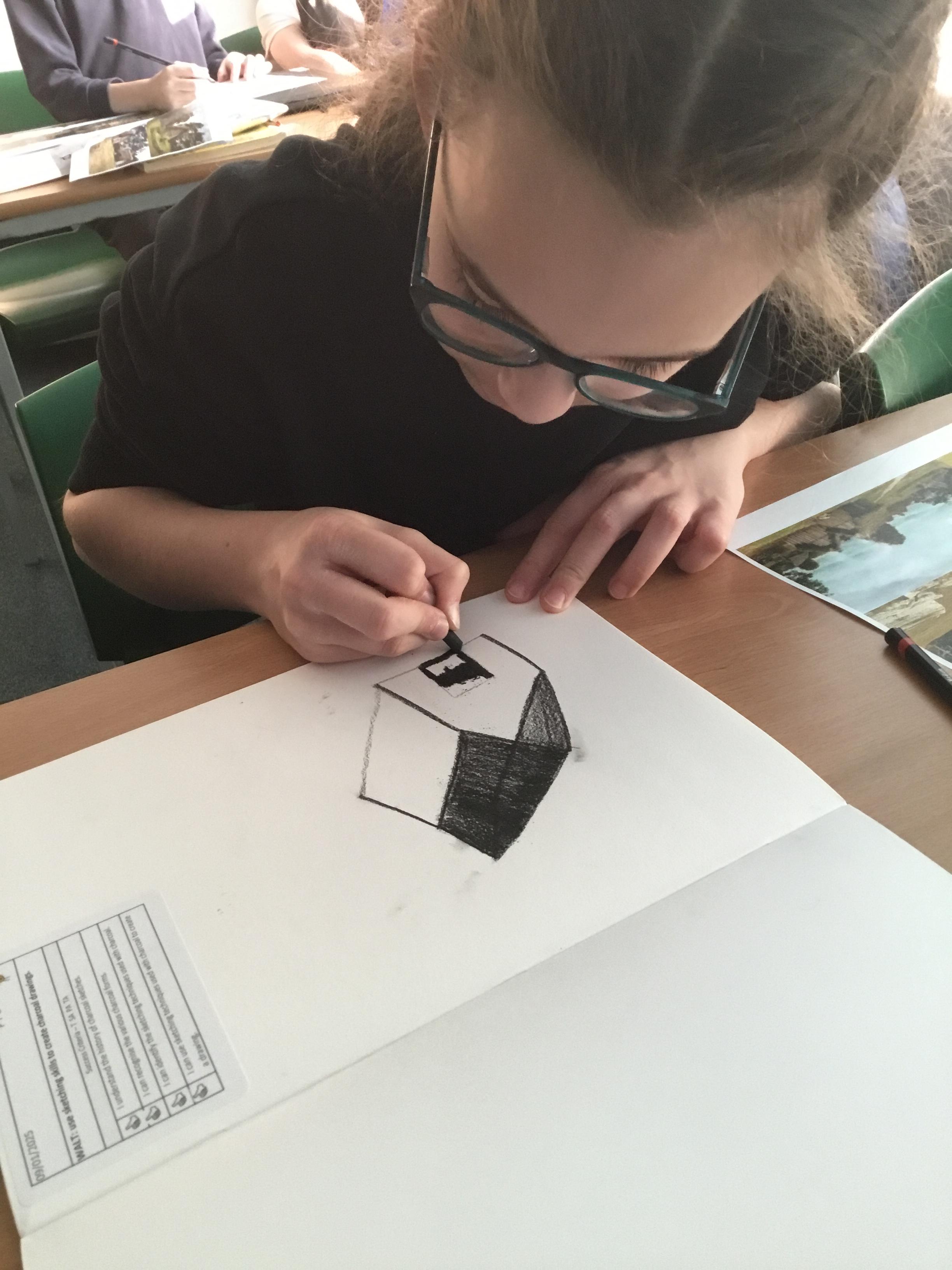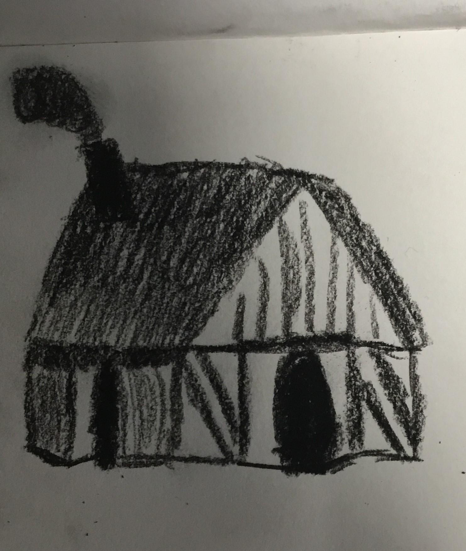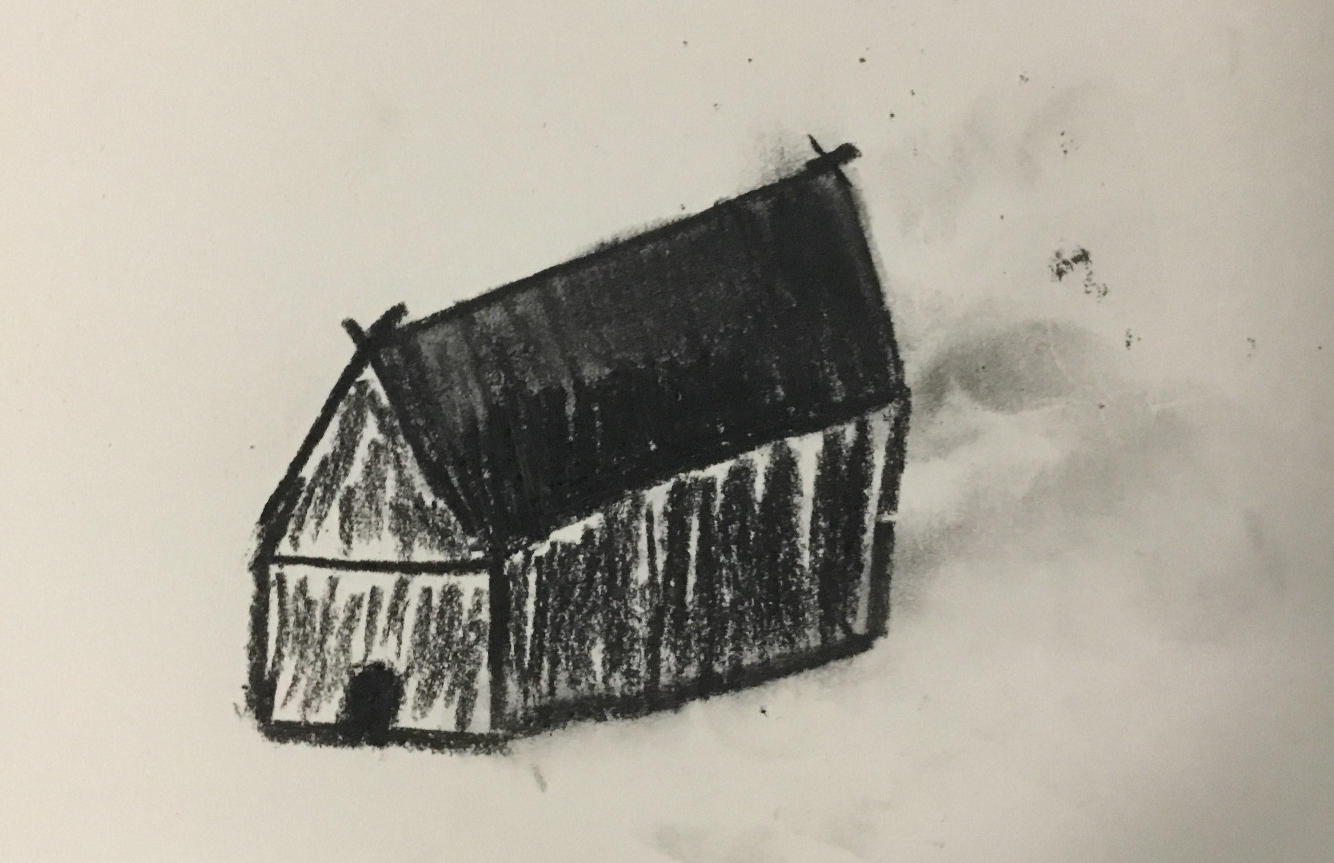 Art - using charcoal to draw our Anglo-Saxon 3D homes
