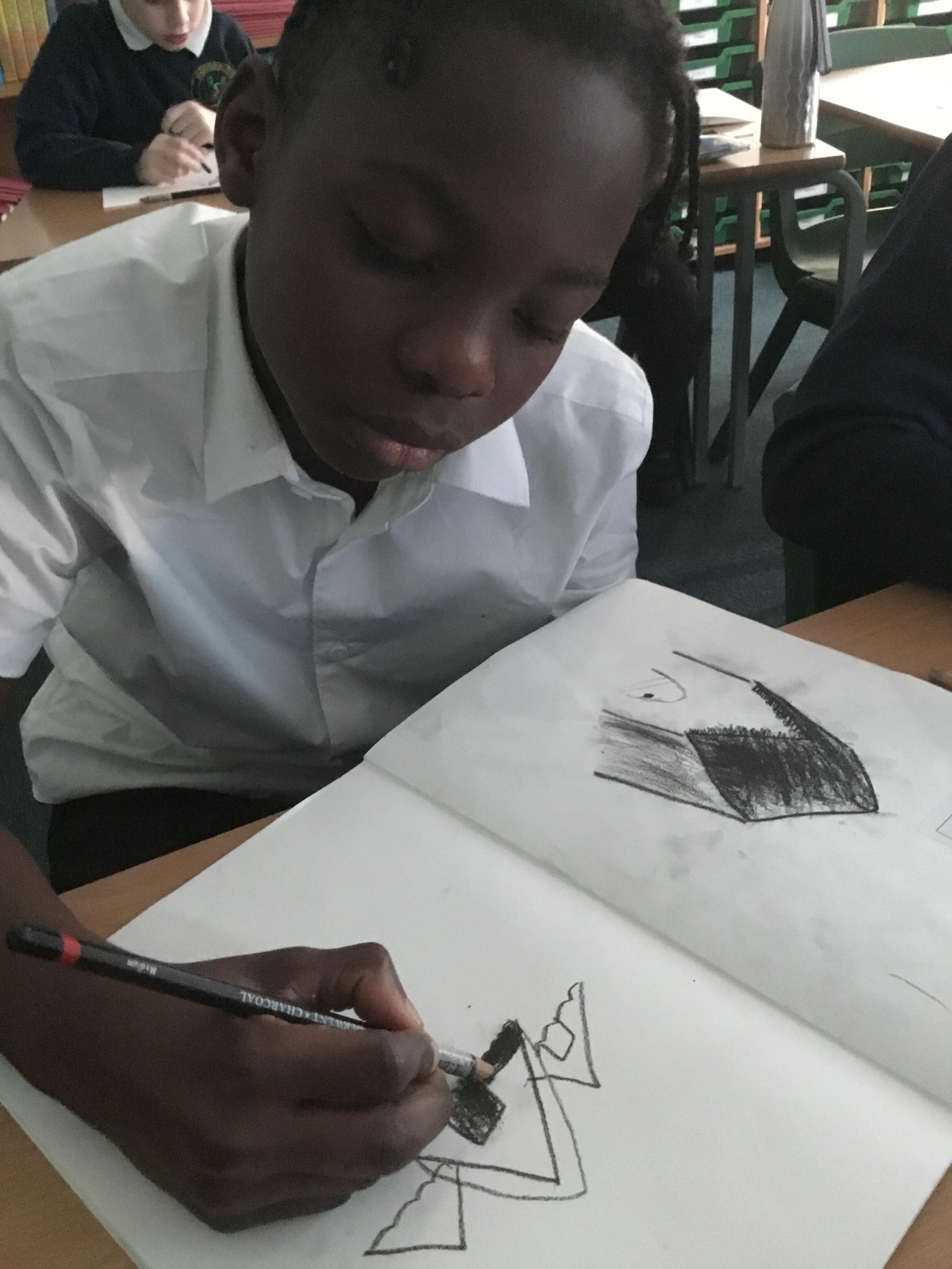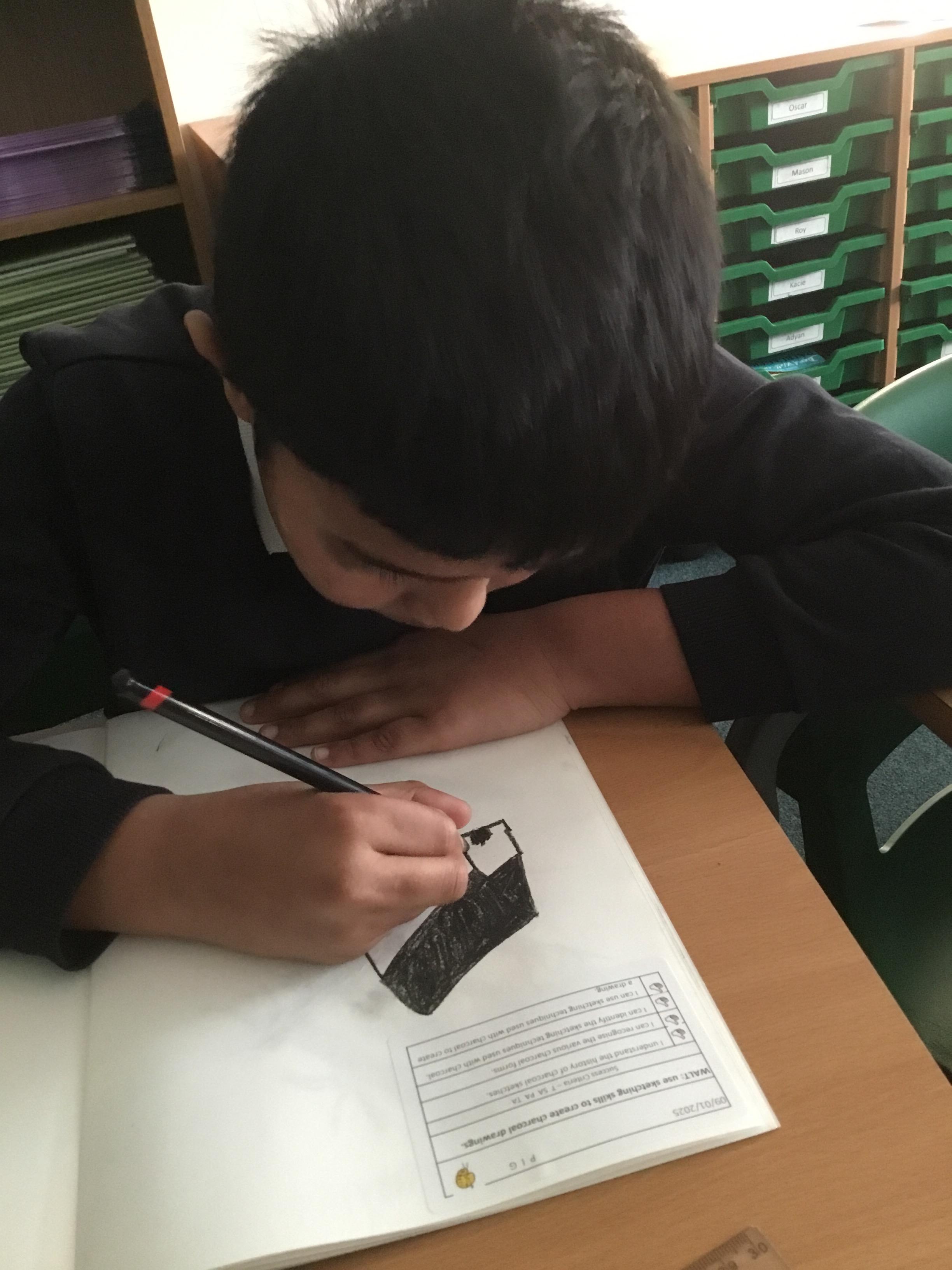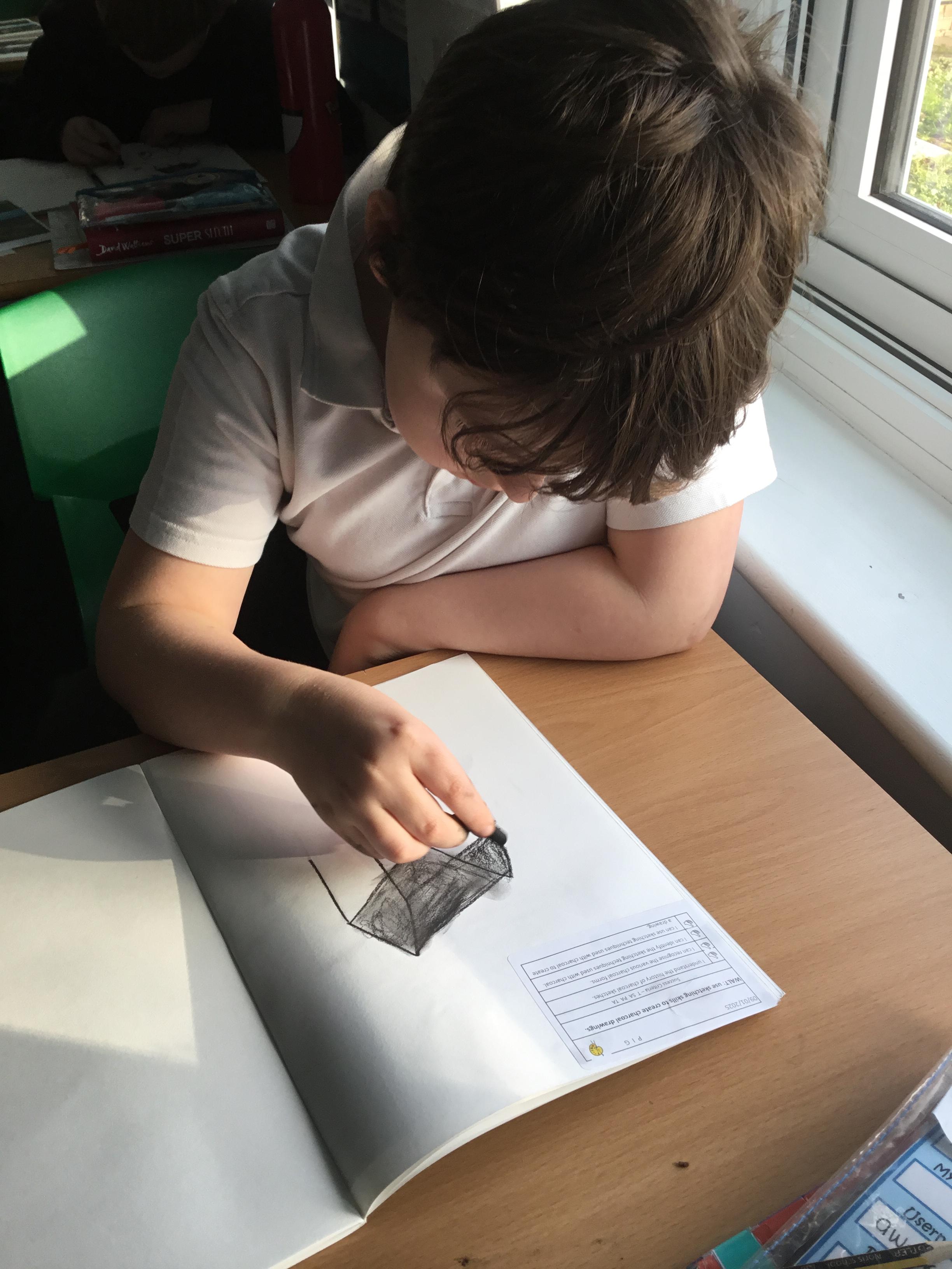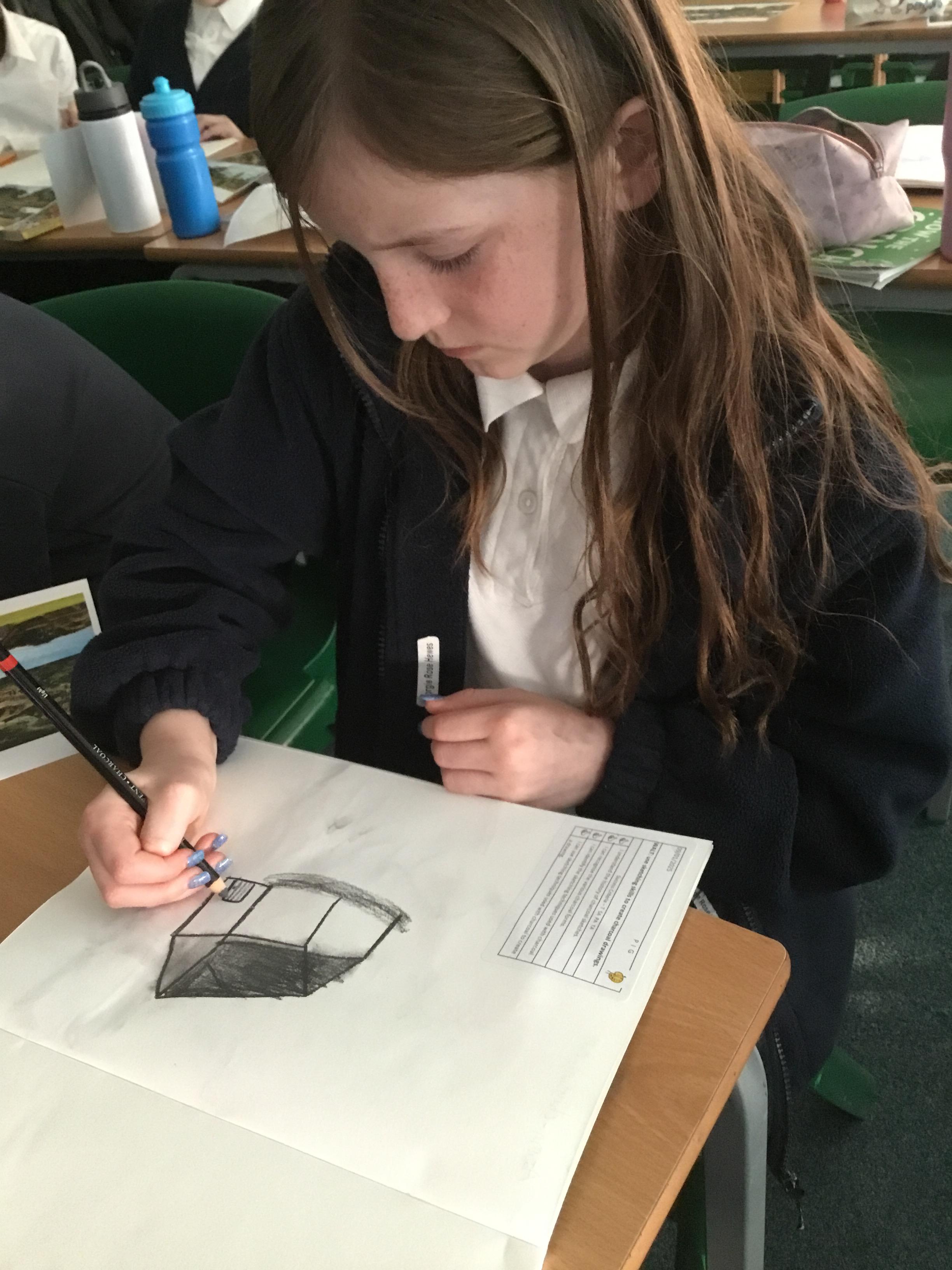 Art - using charcoal to draw our Anglo-Saxon 3D homes