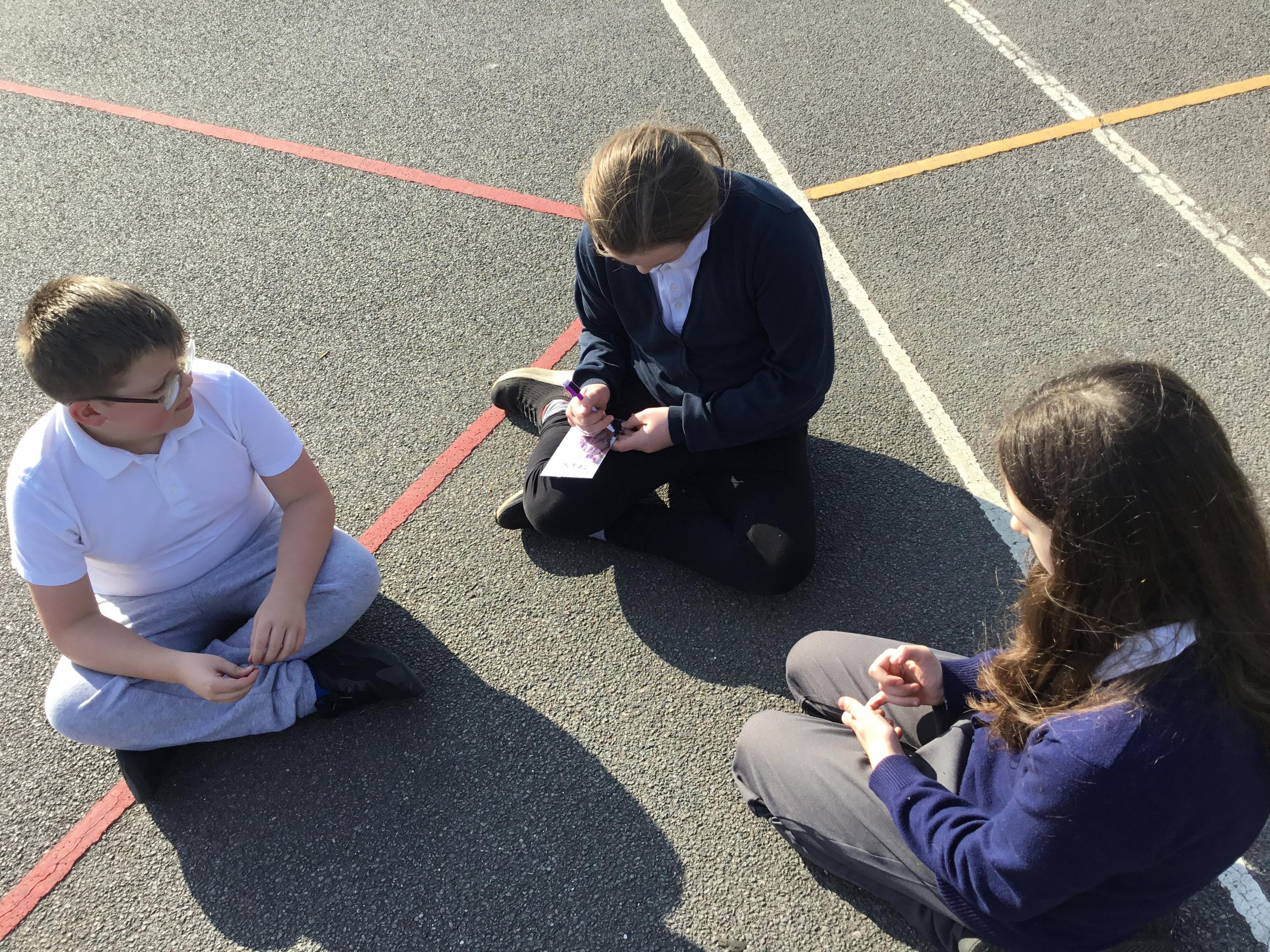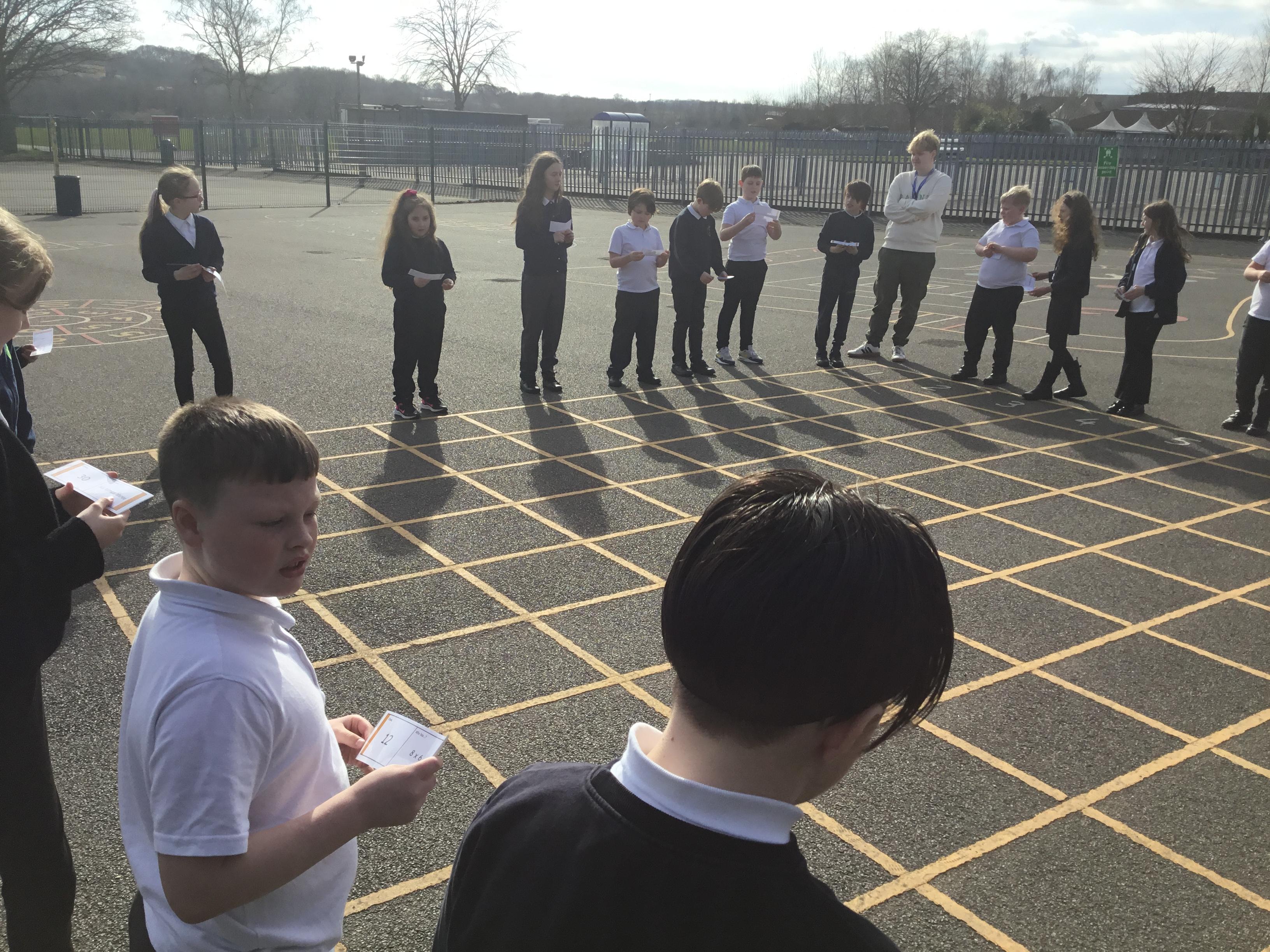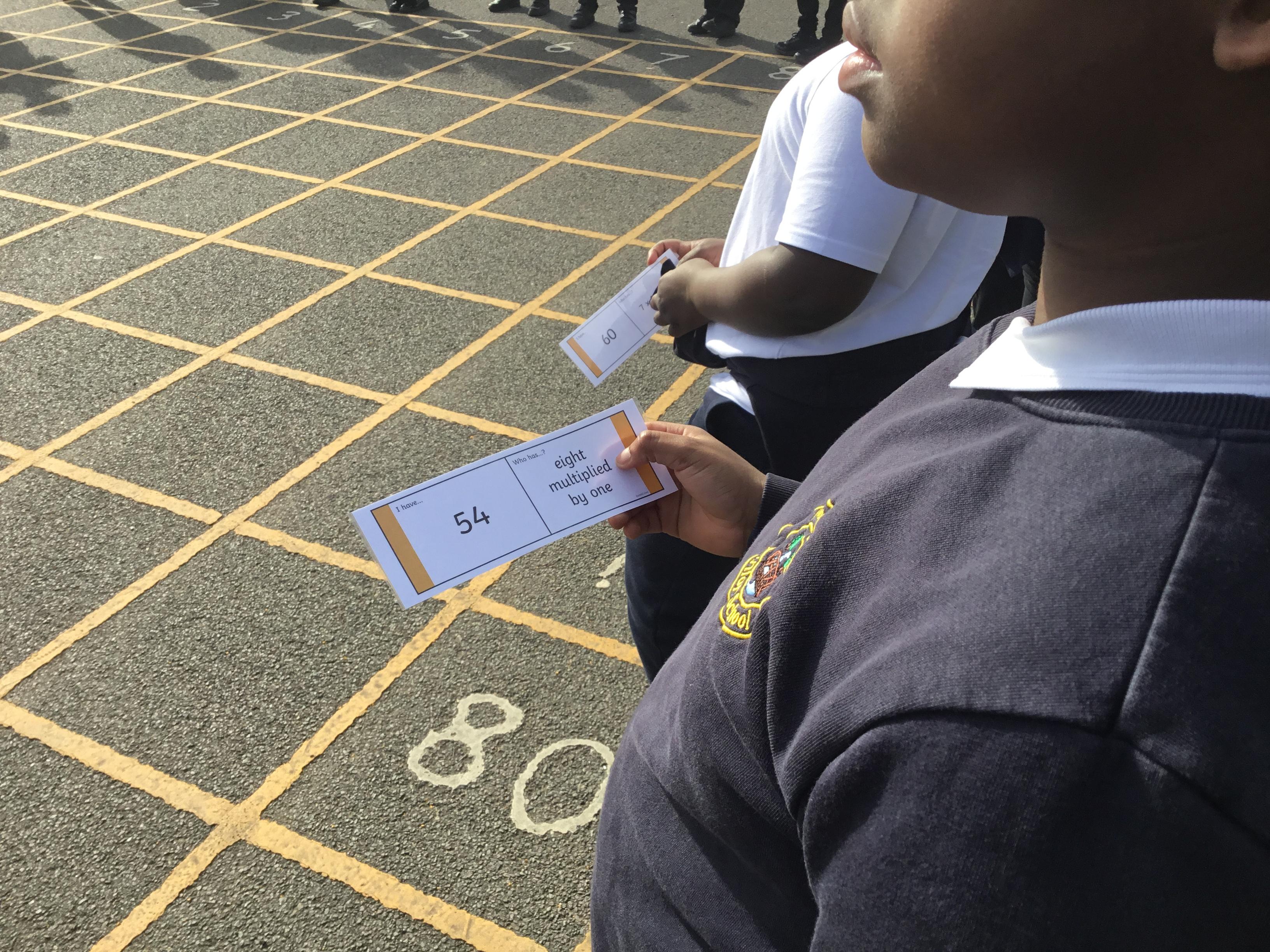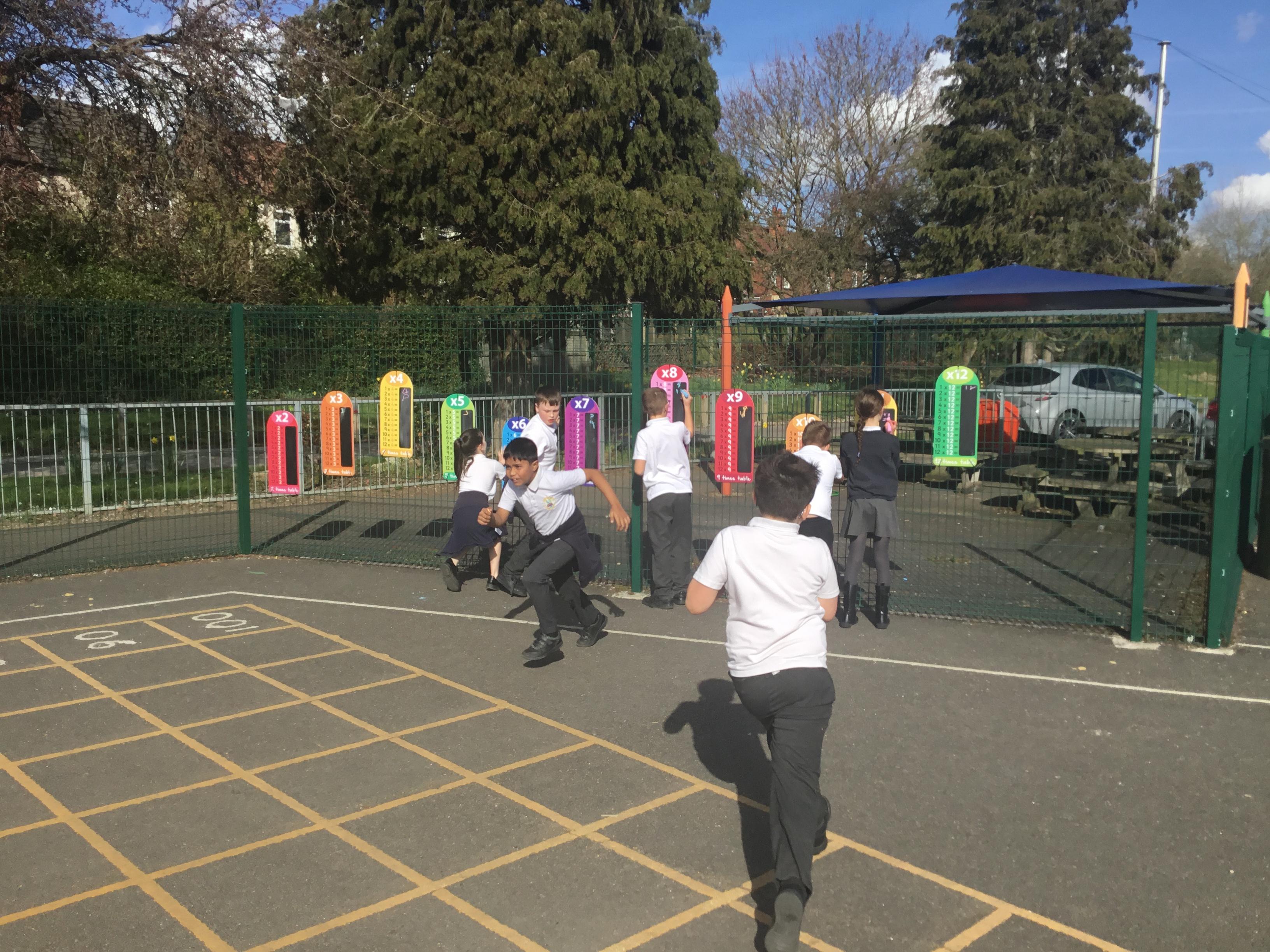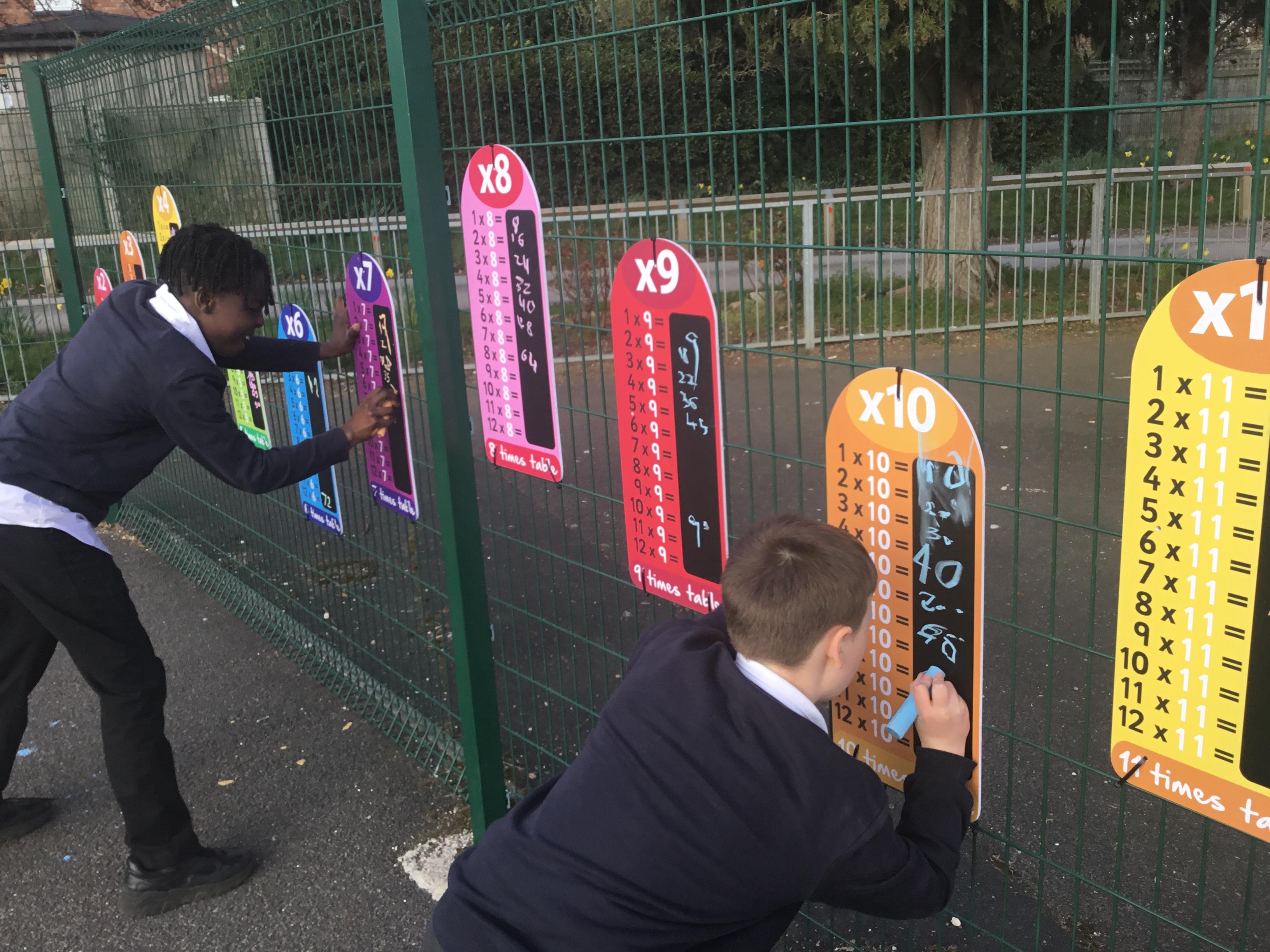 Practising our multiplication facts on our new multiplication boards outdoors