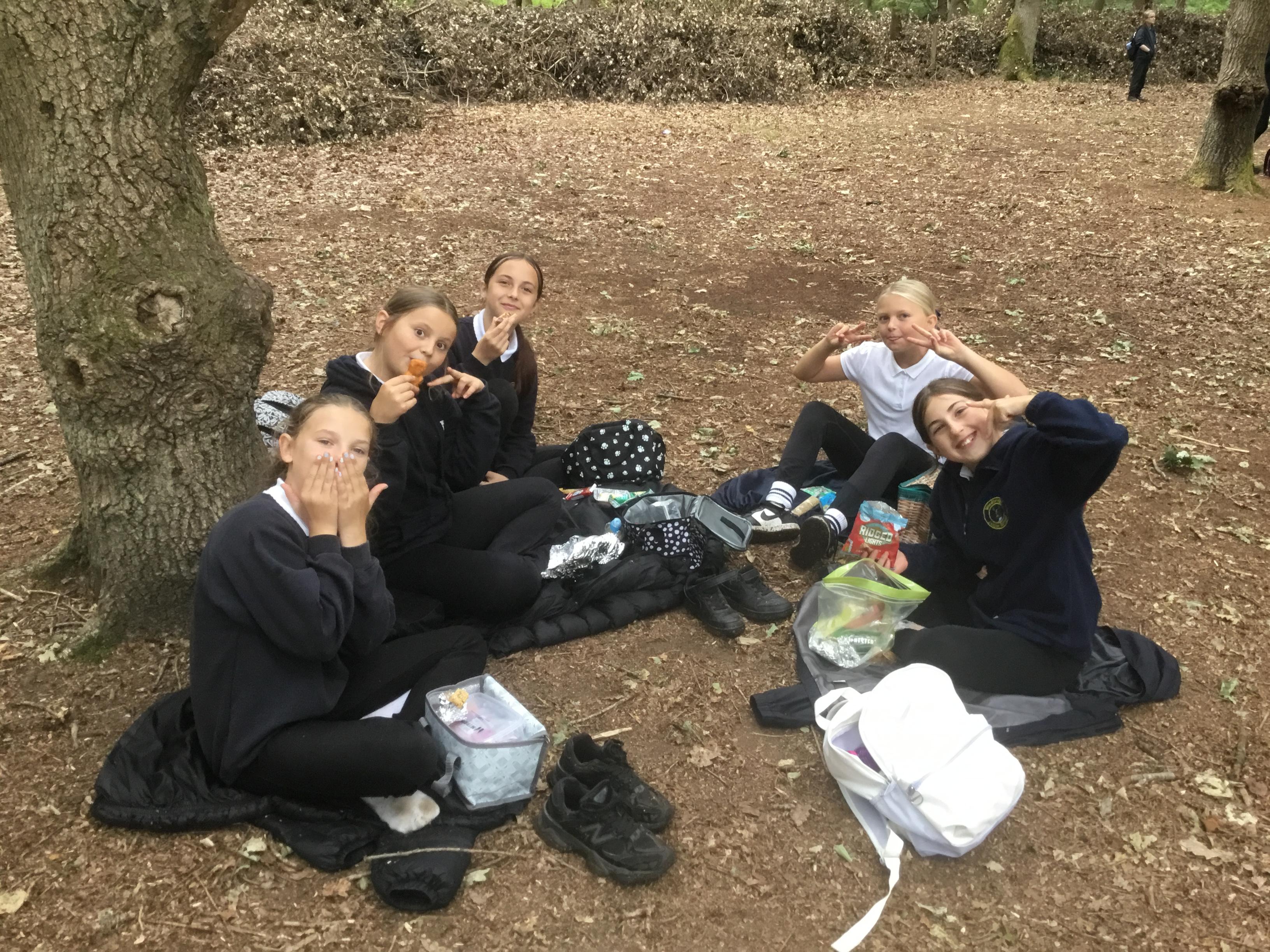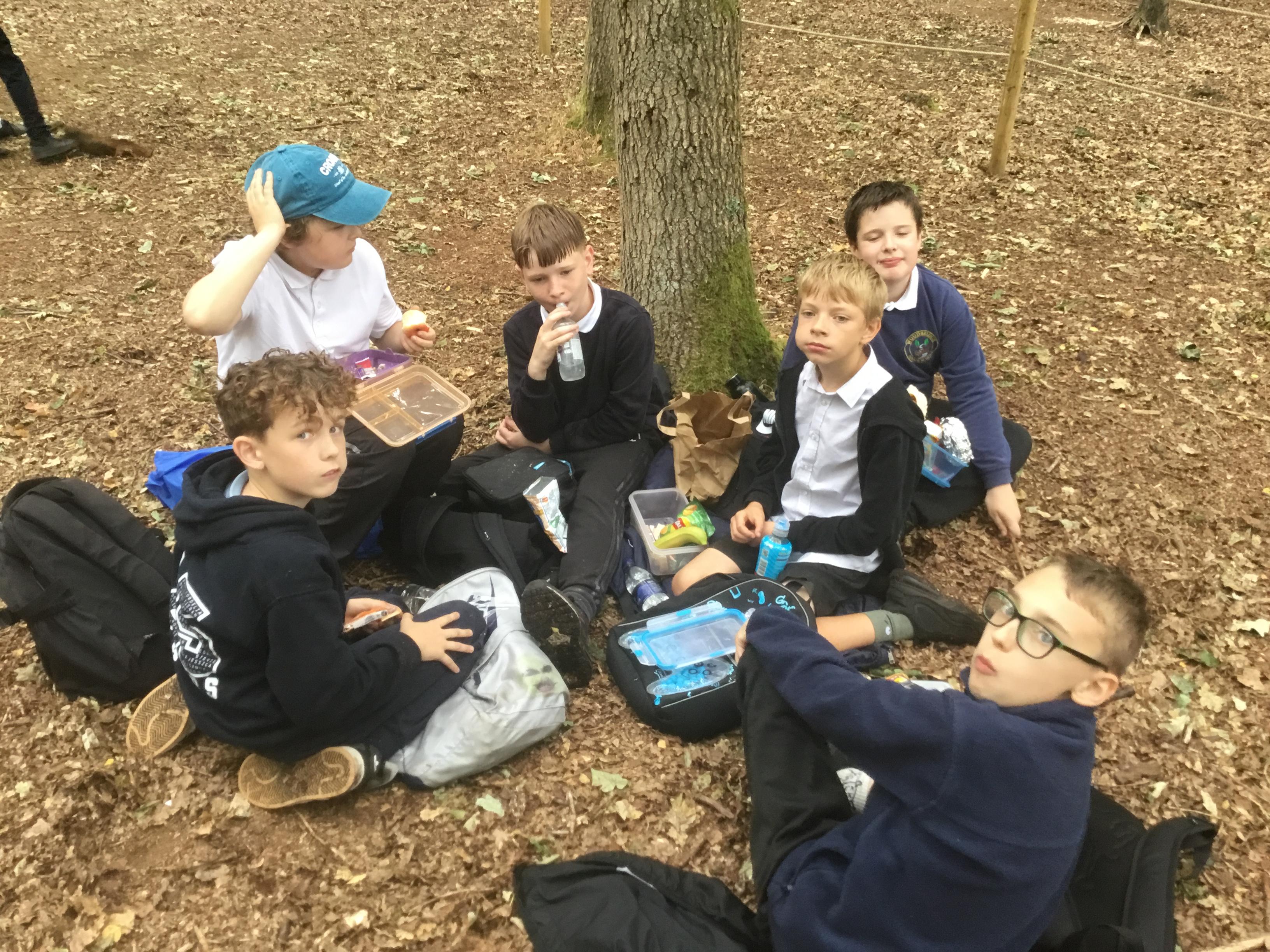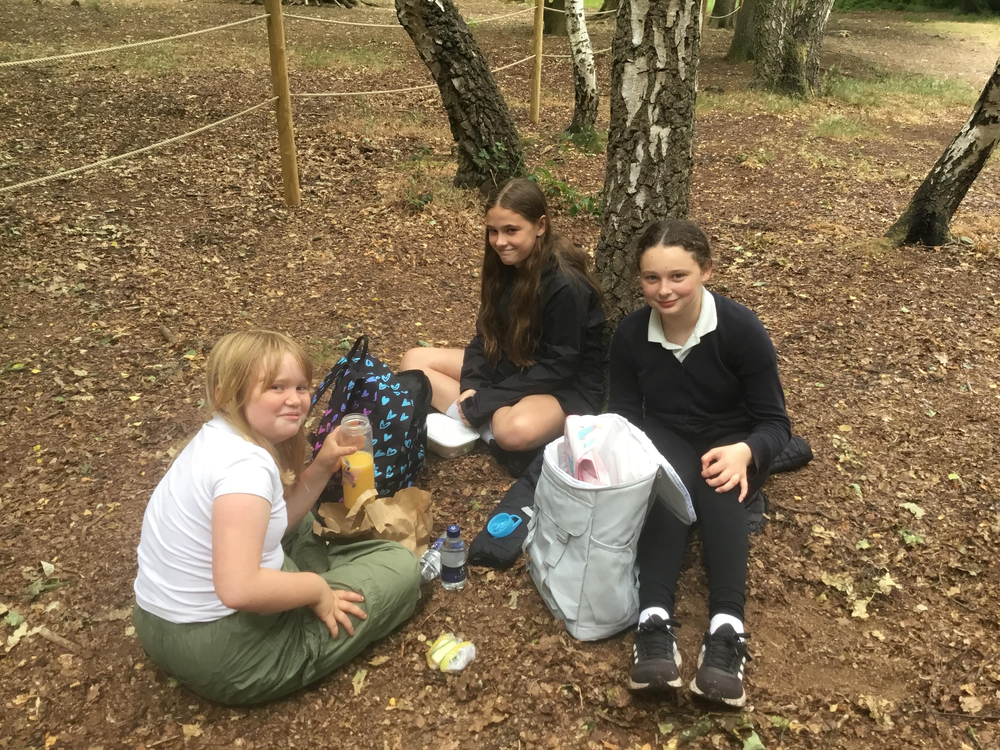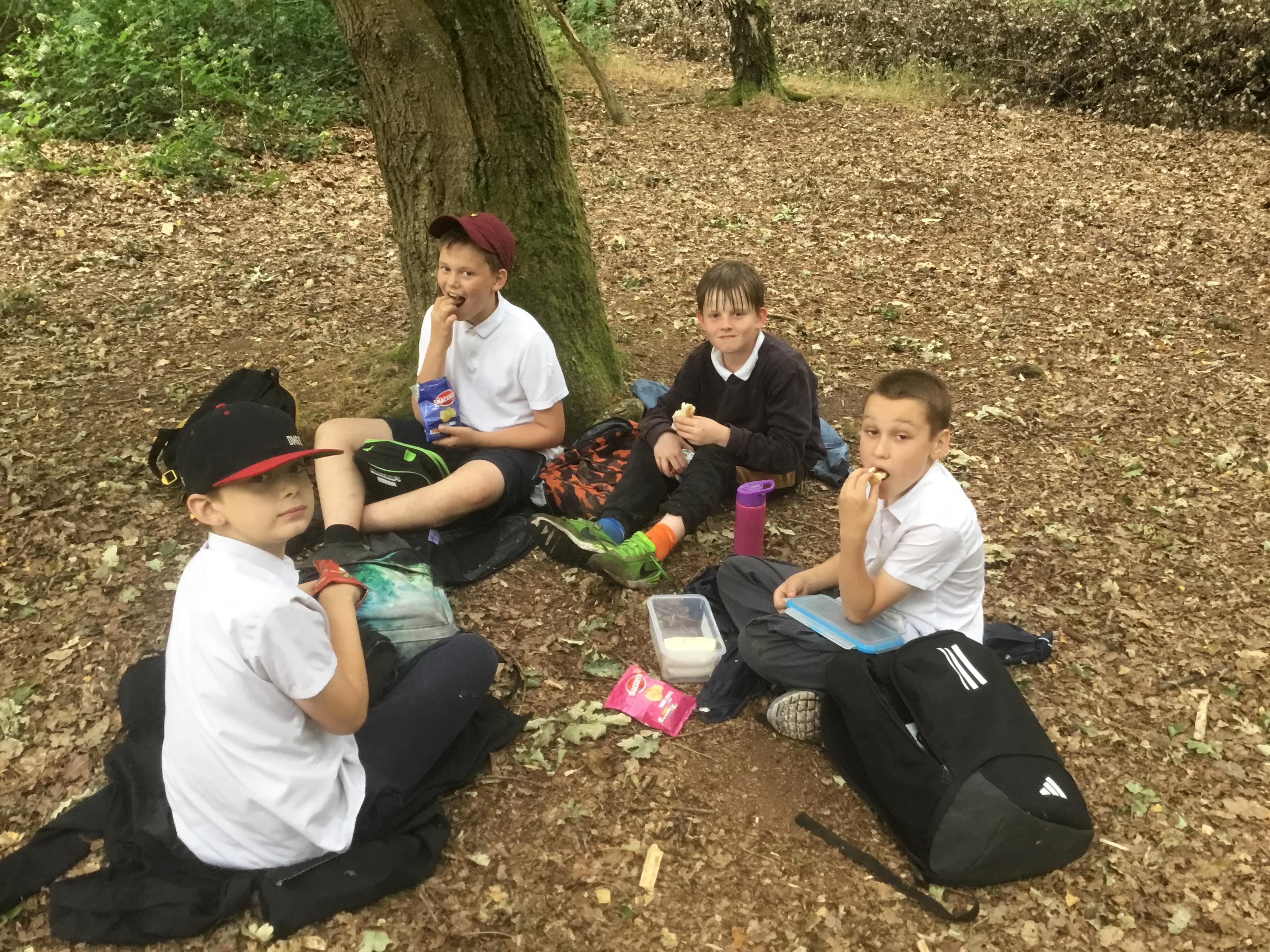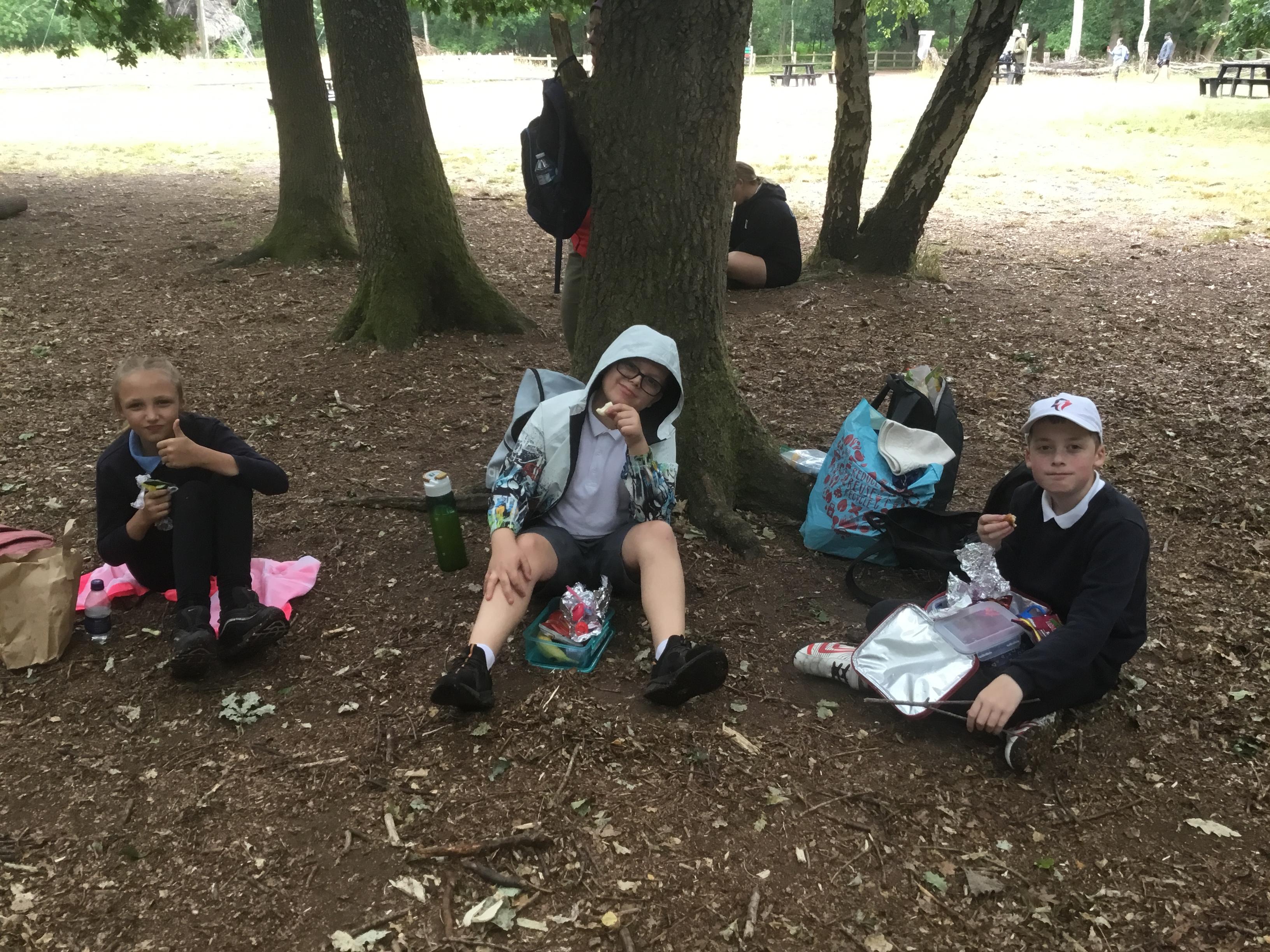 Eating lunch under the trees.