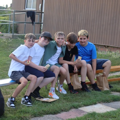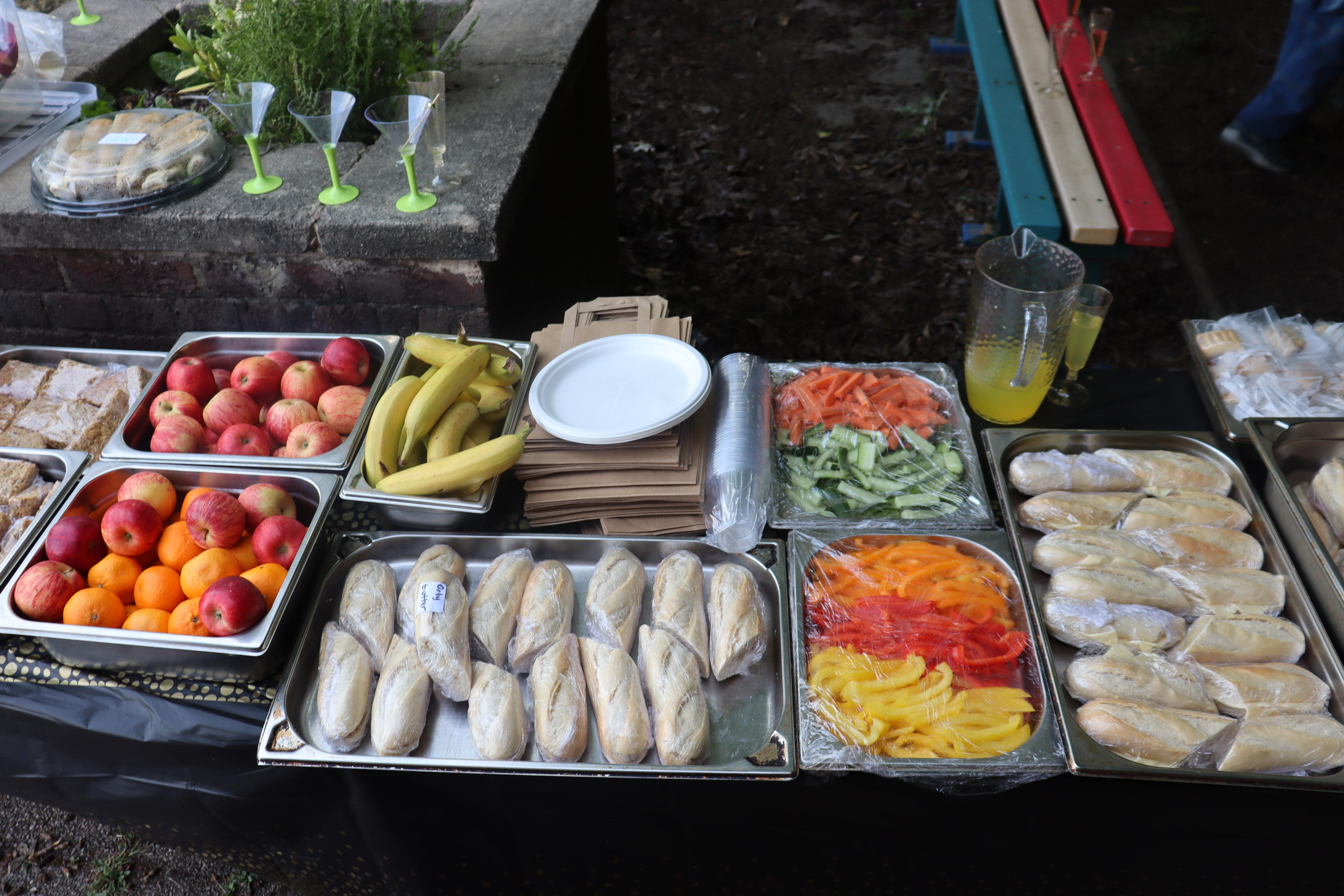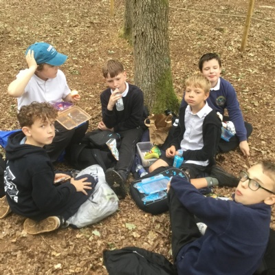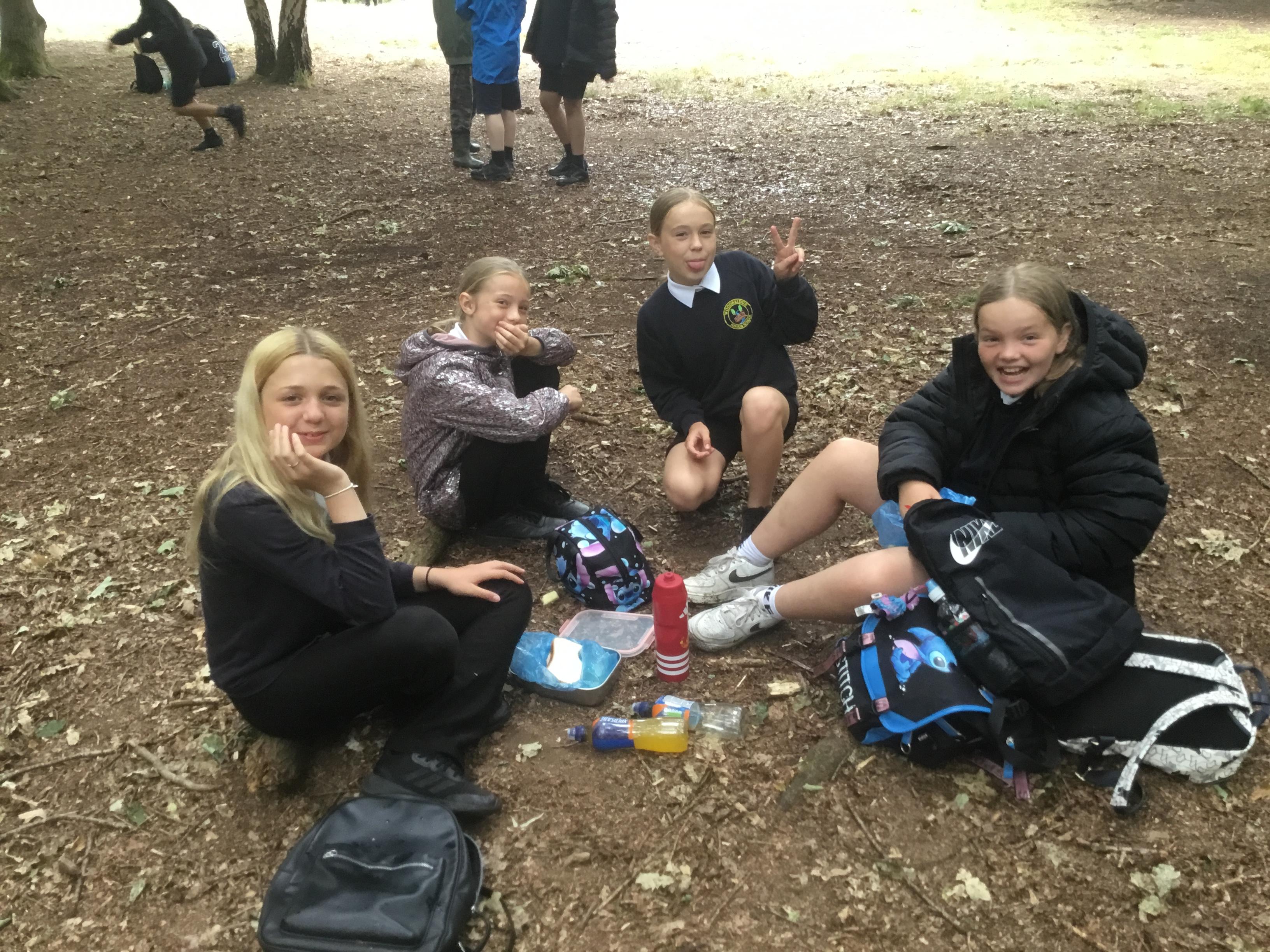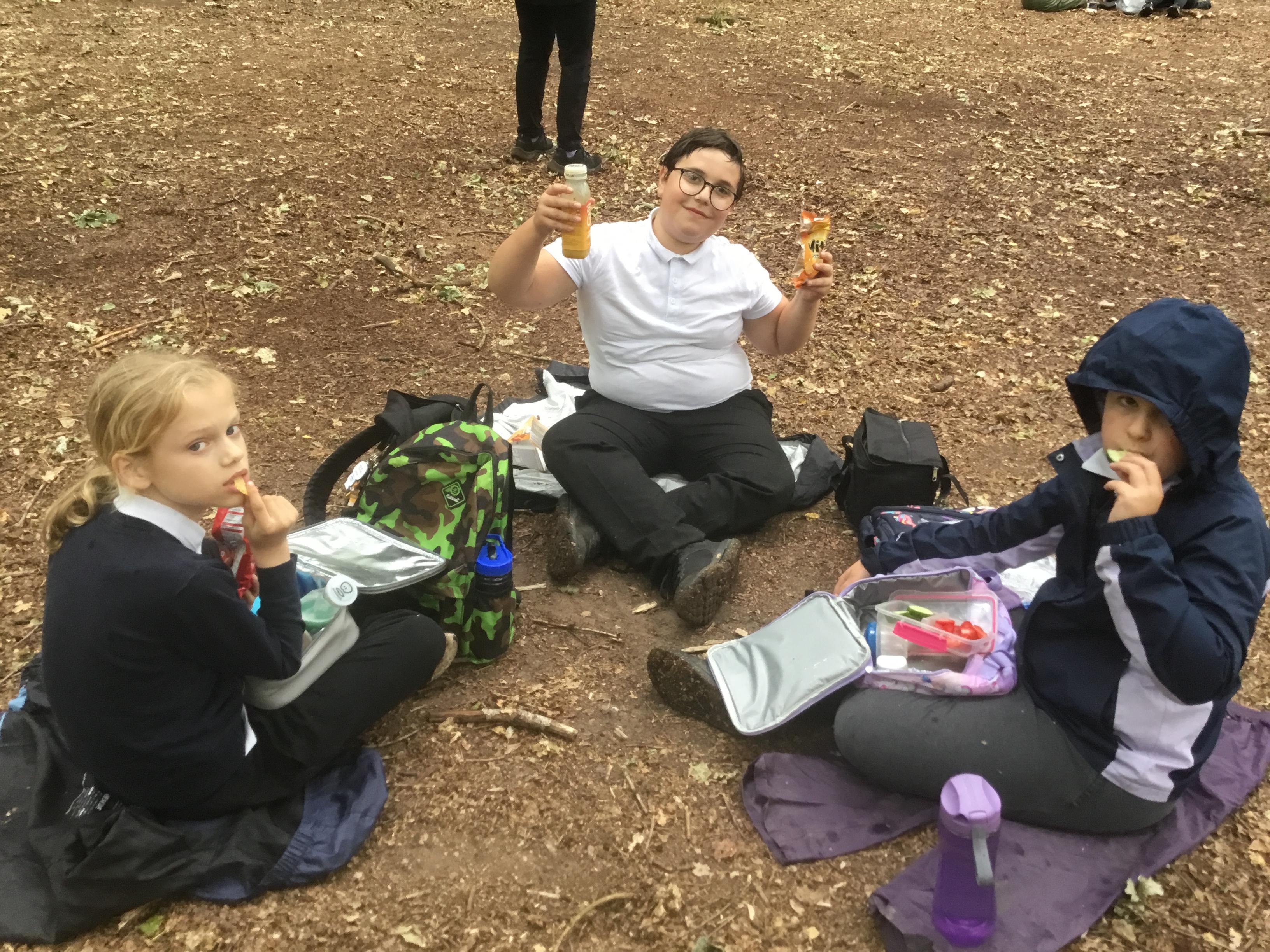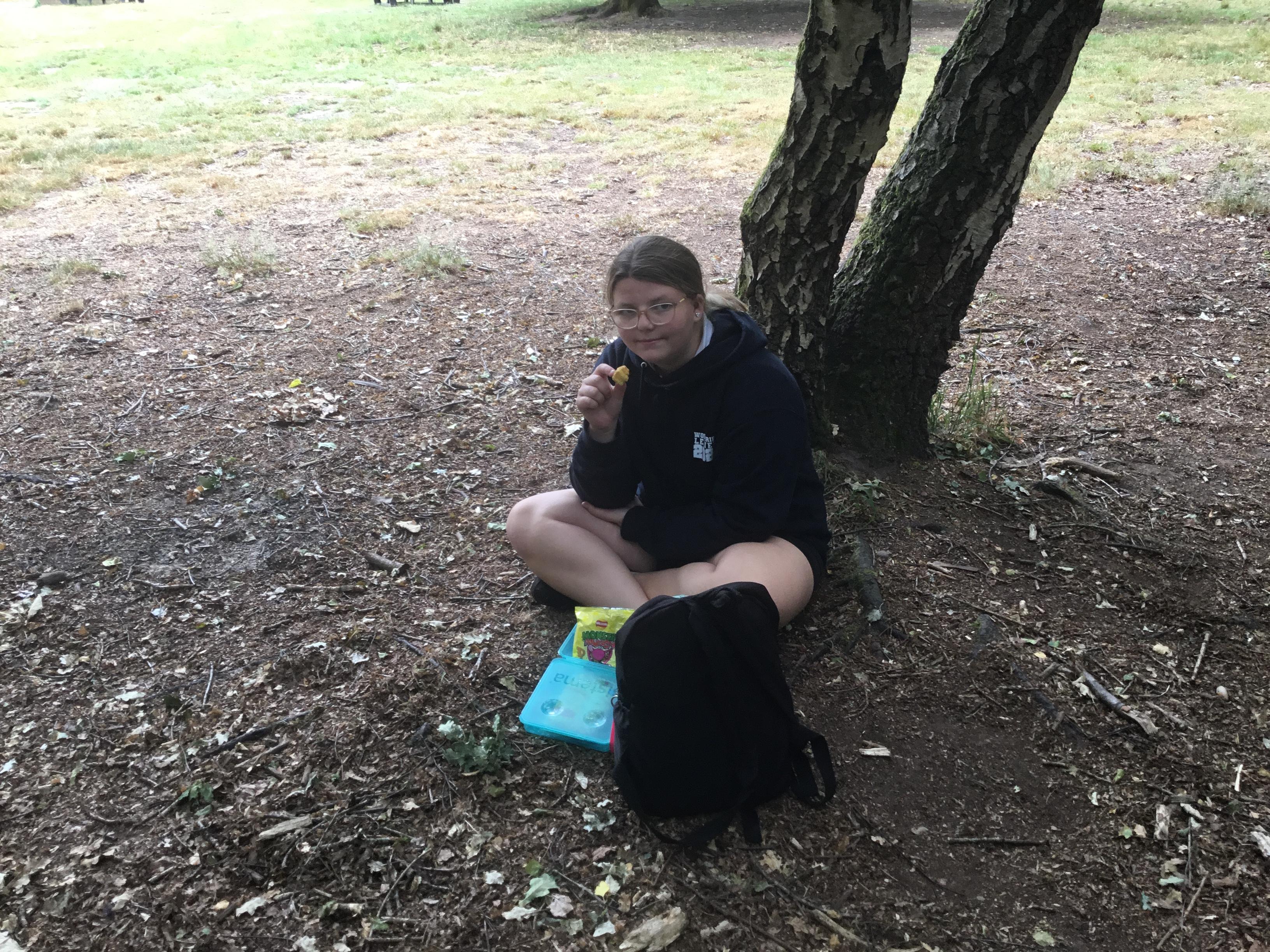 Eating lunch under the trees.
