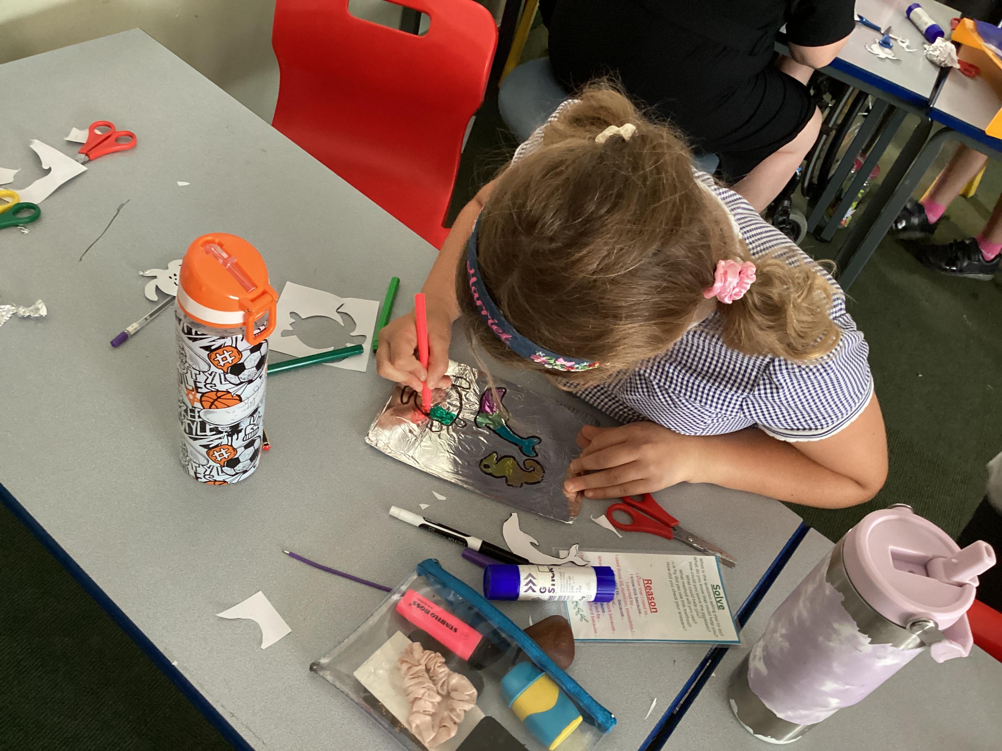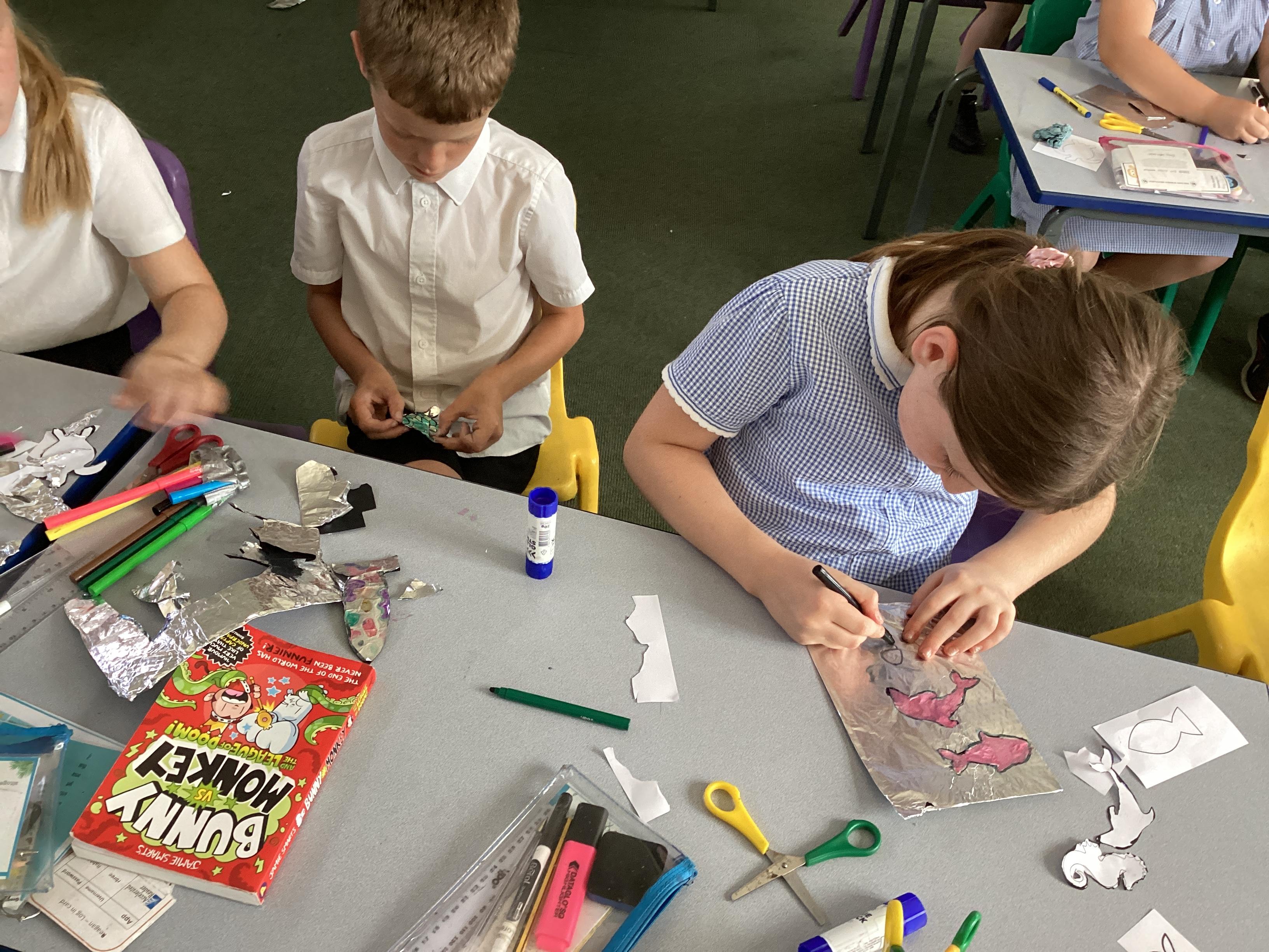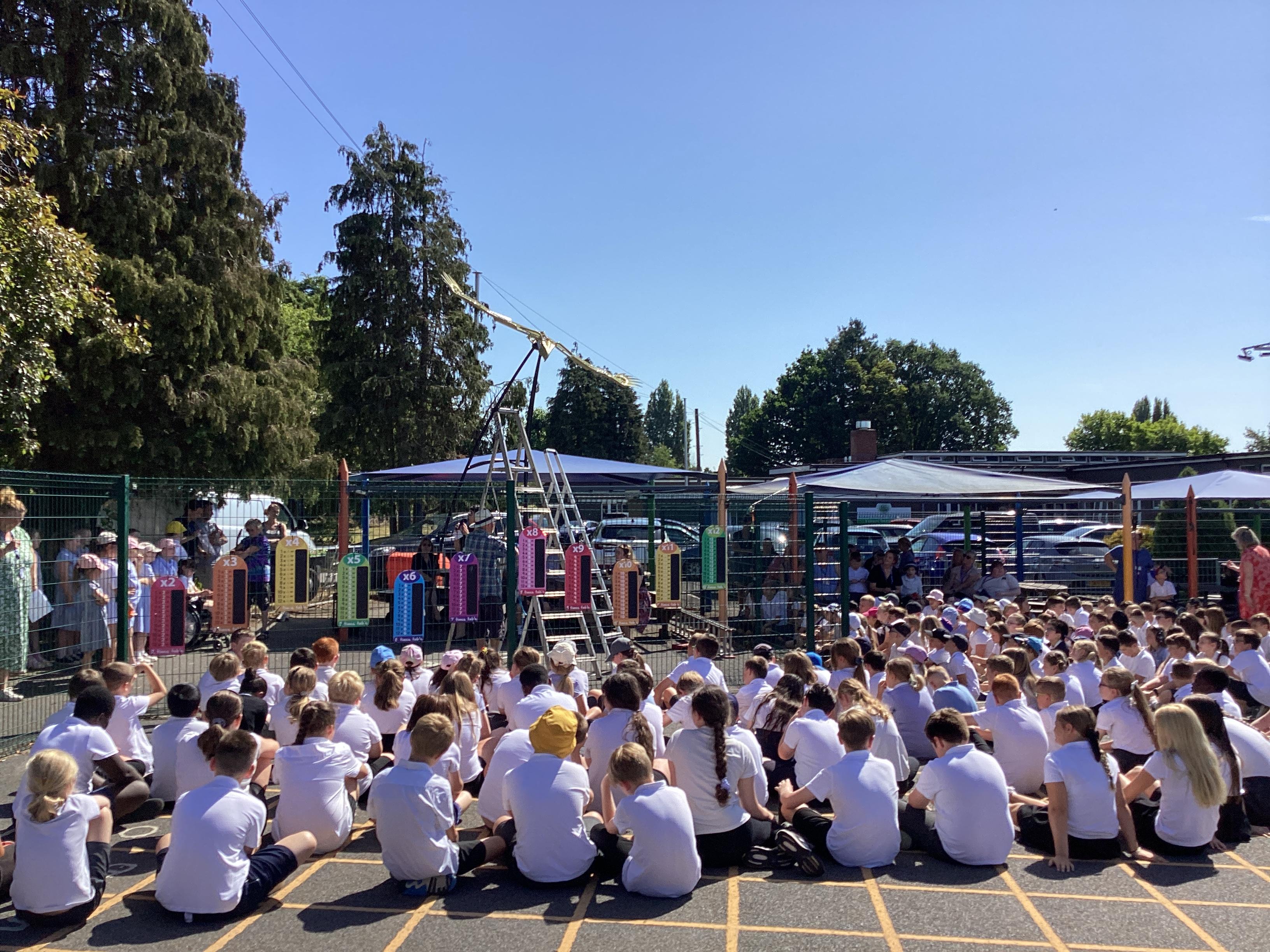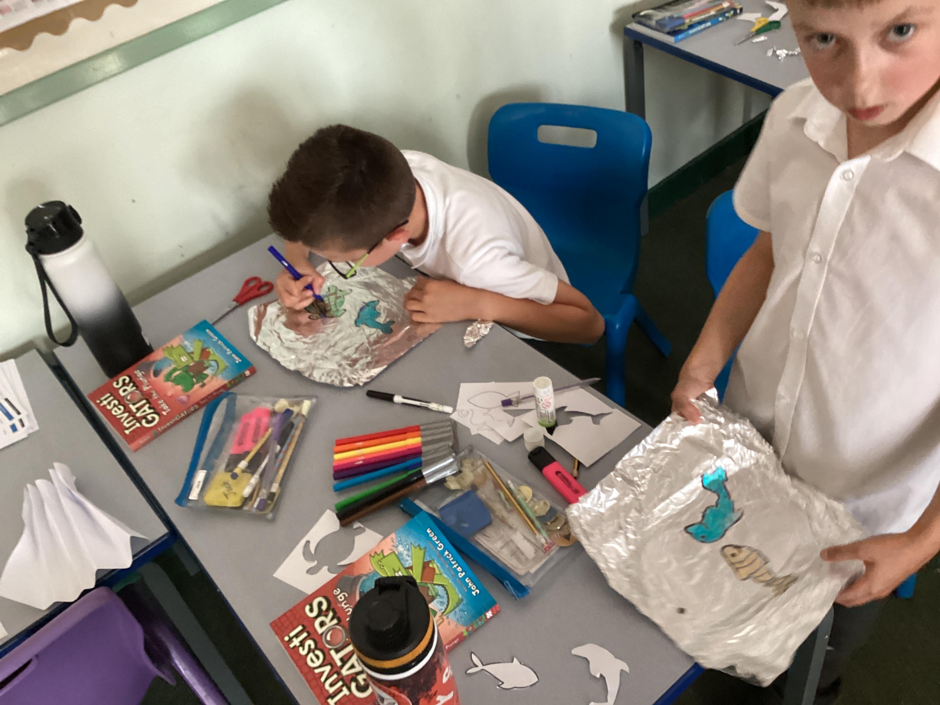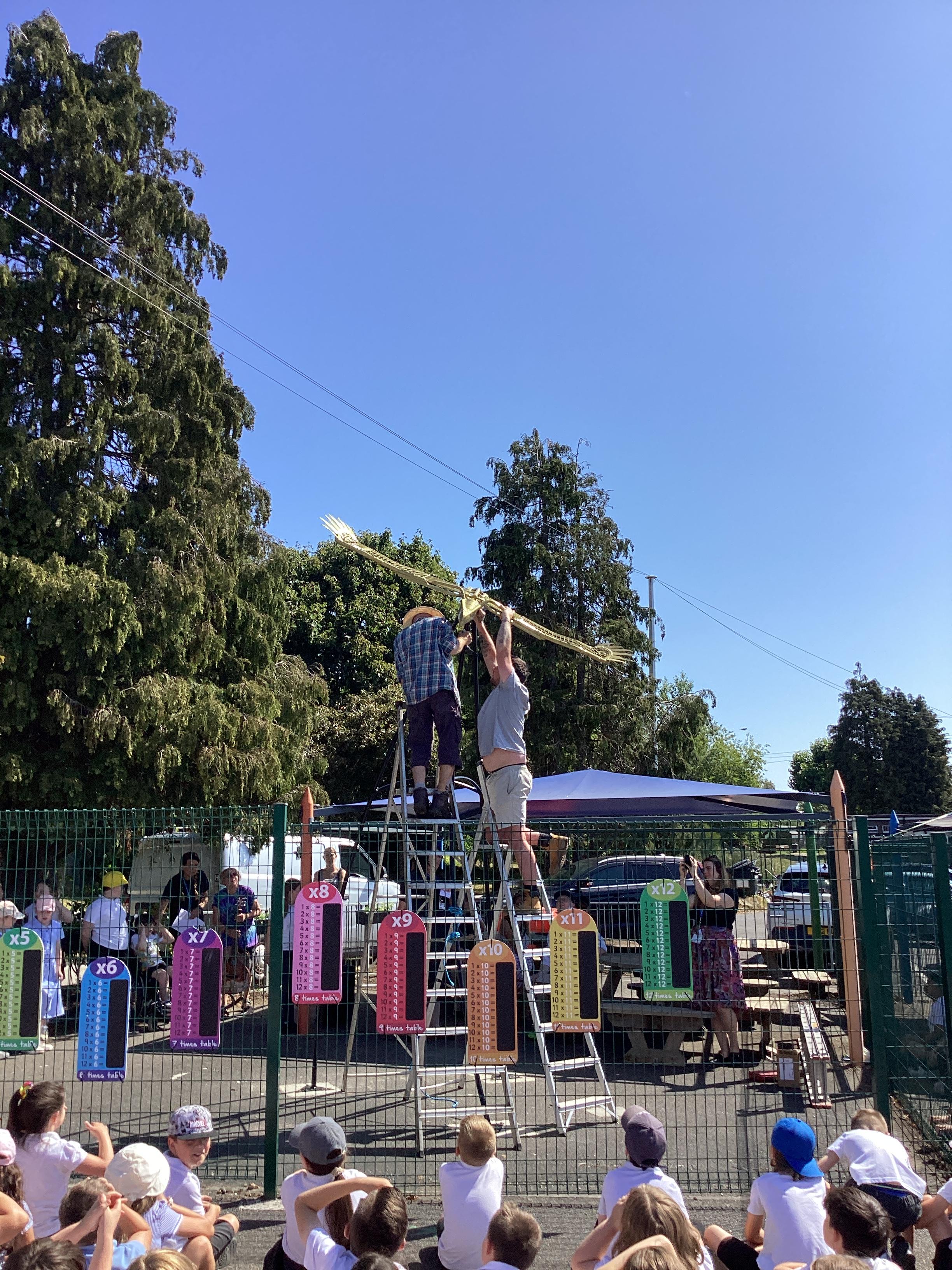 What a wonderful July week we have had! In PE we practised our cricket skills, we amalgamated all of our knowledge of how rivers are used and created an informative and colourful leaflet. In Art, we used our fourth medium to create foil fish to be added to our final piece. We had excellent discussions during English, where we sequnced images and then added captions to the tale of Jack and the Beanstalk. Finally, we had a brilliant celebration watching the installation of our new scrap metal sculpture!